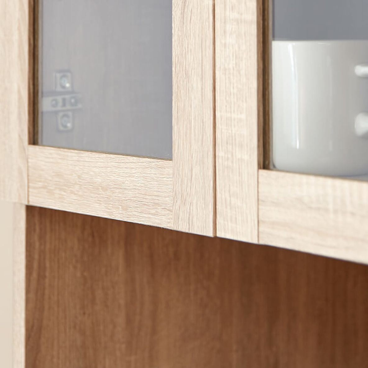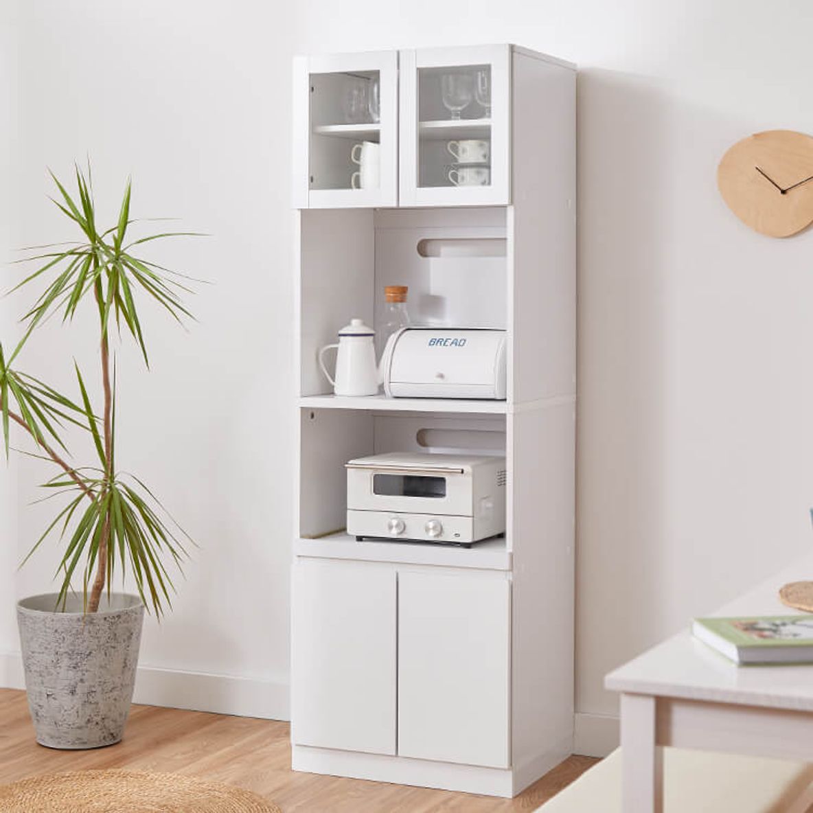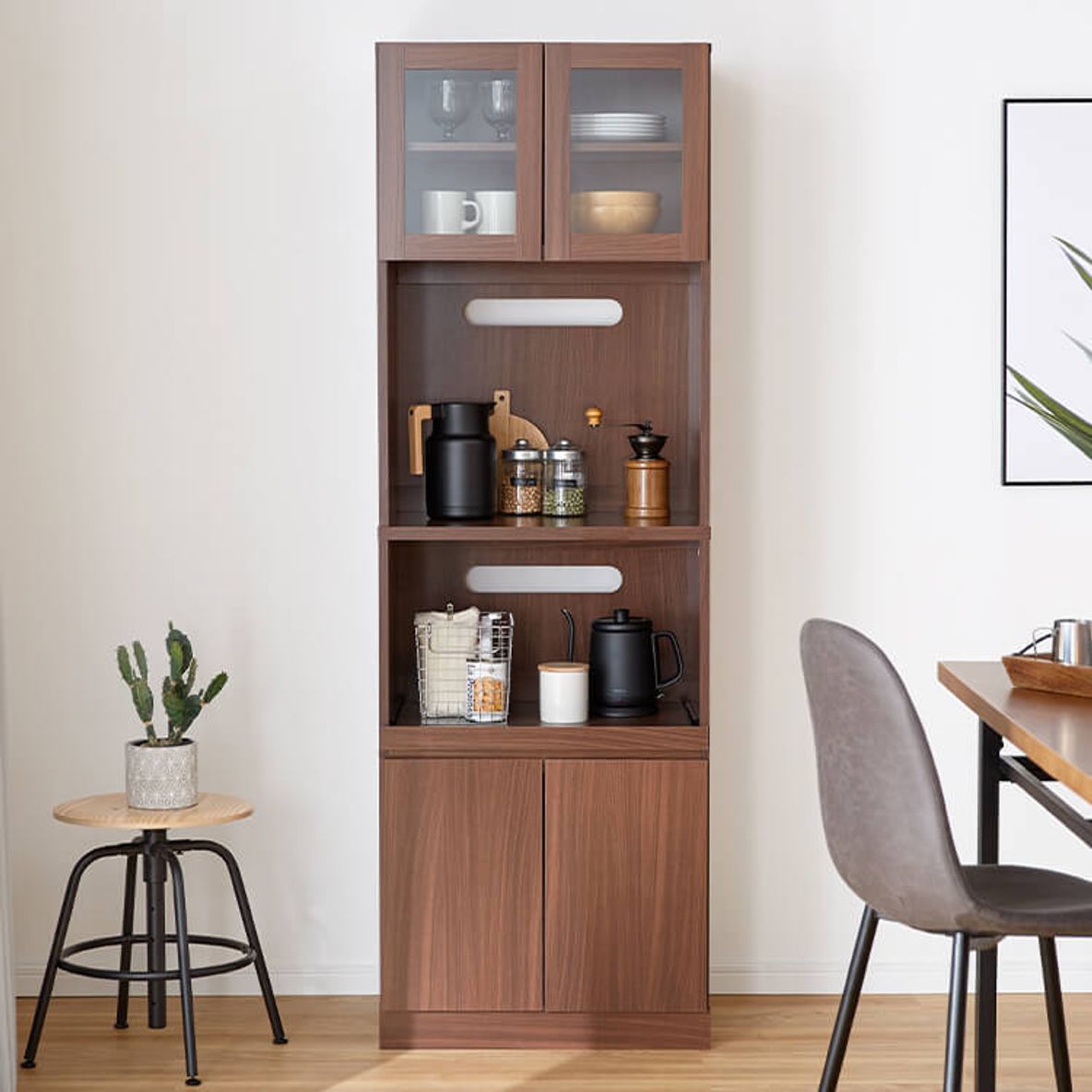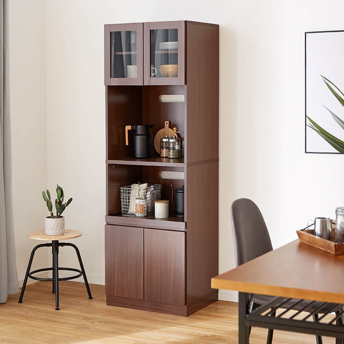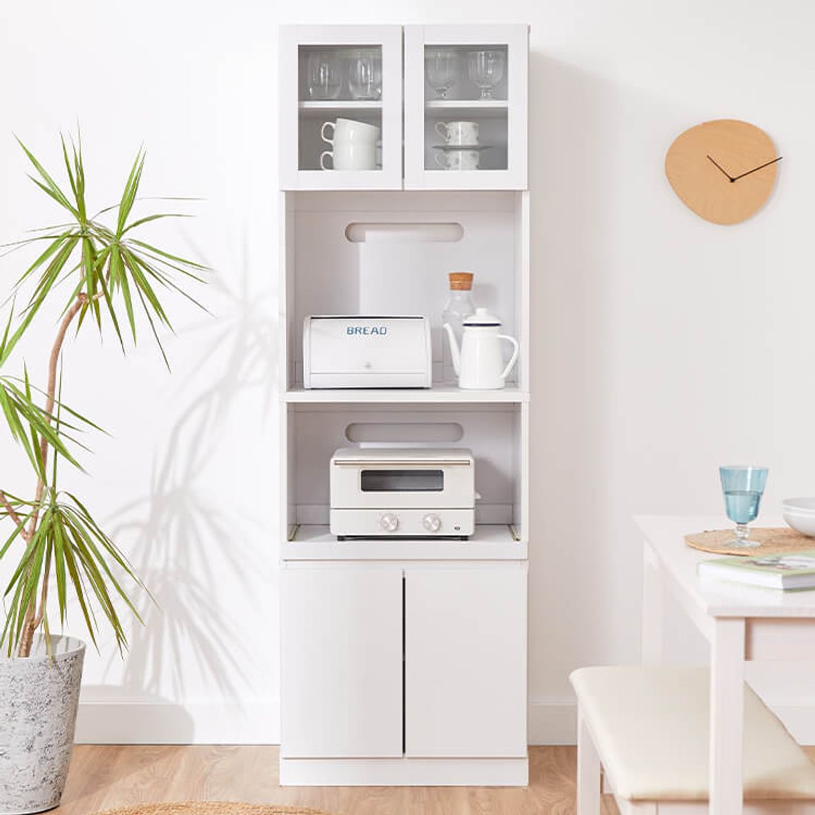 幅をとりすぎない丁度良い大きさとキッチンアイテムがすっきり片付く収納力。機能とムードにこだわったキッチンボードで、毎日のお料理がはかどる使いやすいキッチンへ。レンジ、ポット、炊飯ジャー、コーヒーメーカー…毎日使う家電製品がスッキリ片付きます。さらに豊富な収納スペースで、食器から鍋など大きなものまで収納可能です。幅はコンパクトな59cm、さらに上の空間を利用したハイタイプなので、あらゆる広さのお部屋で活躍してくれます。置く食器類を美しく見せてくれるガラス扉収納。扉のガラスにはキレイな透明感を誇る強化ガラスを使用しました。一般的なガラス(フロート板ガラス)に比べると3~5倍程度の強度があるガラスです。