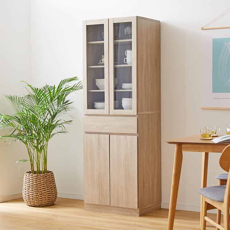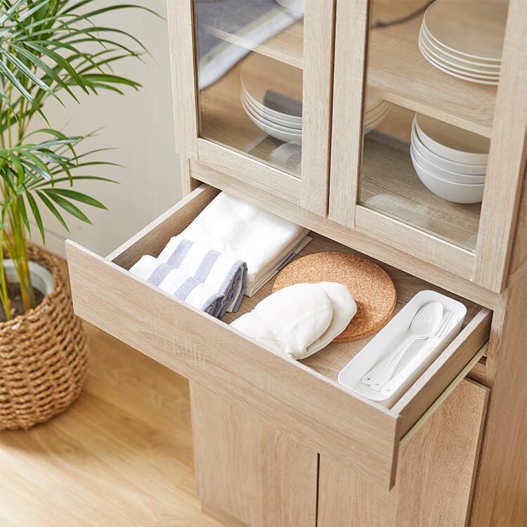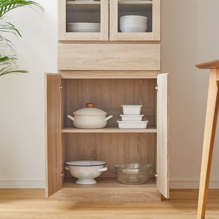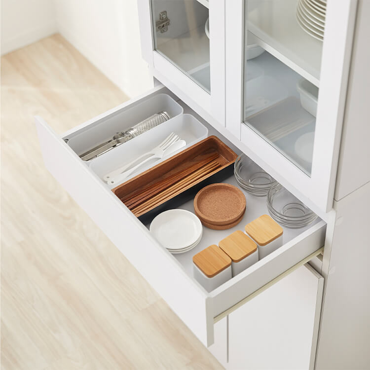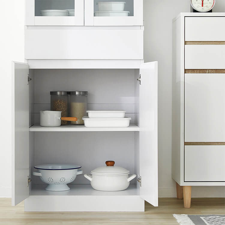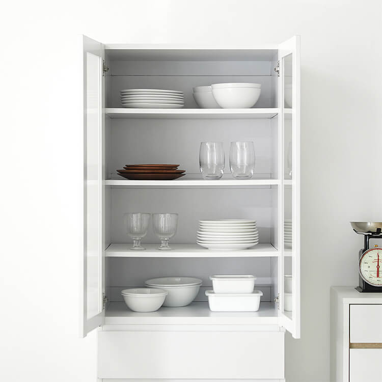 シンプルに美しく、でも収納はたっぷり。 使いやすさとムードにこだわった収納で、キッチンをおしゃれに引き立てます。シンプルで美しいフォルムが、キッチンを清潔感ある落ち着いた雰囲気に。 幅はコンパクトな59cm、上の空間を利用したハイタイプなので、 1LDKから大きな部屋まで使いやすい設計です。