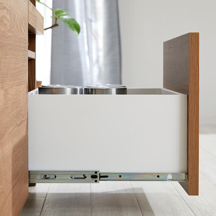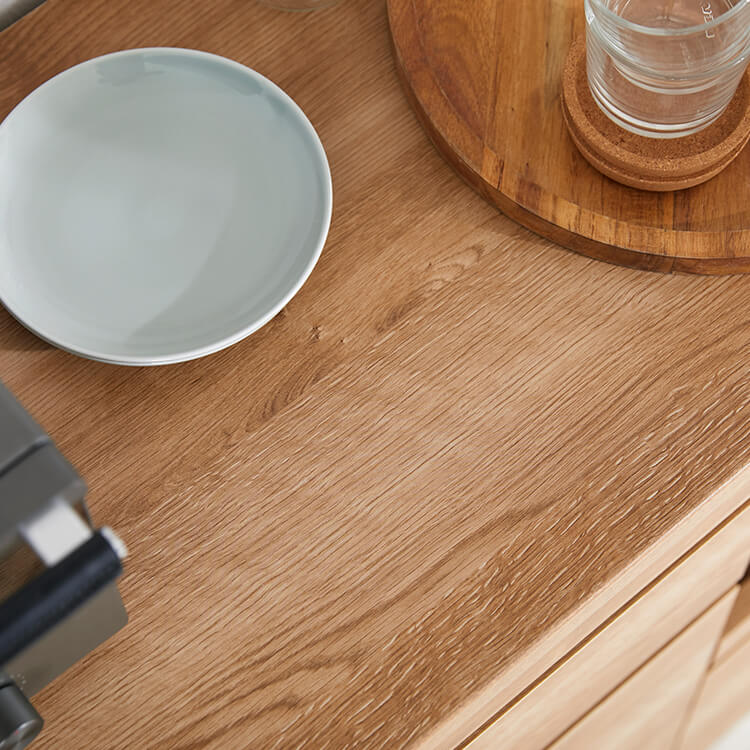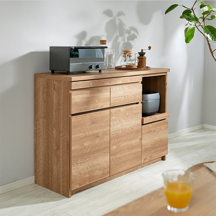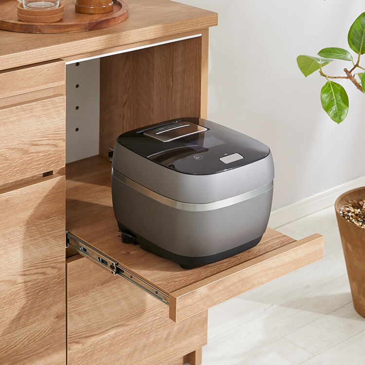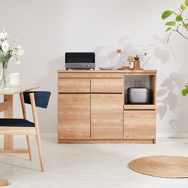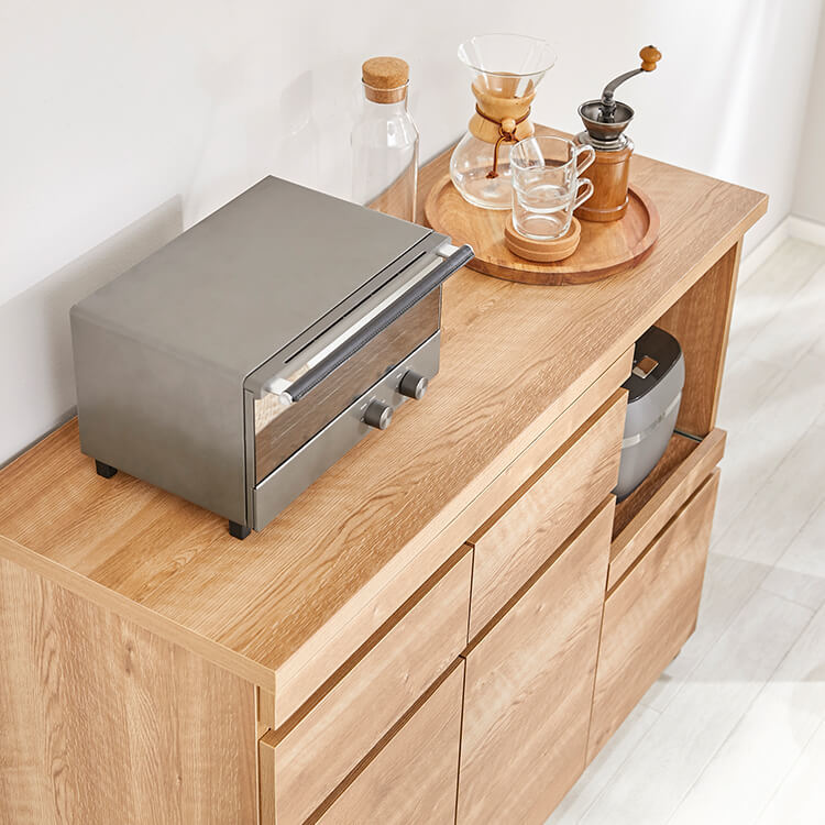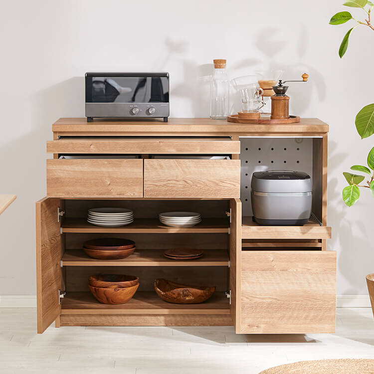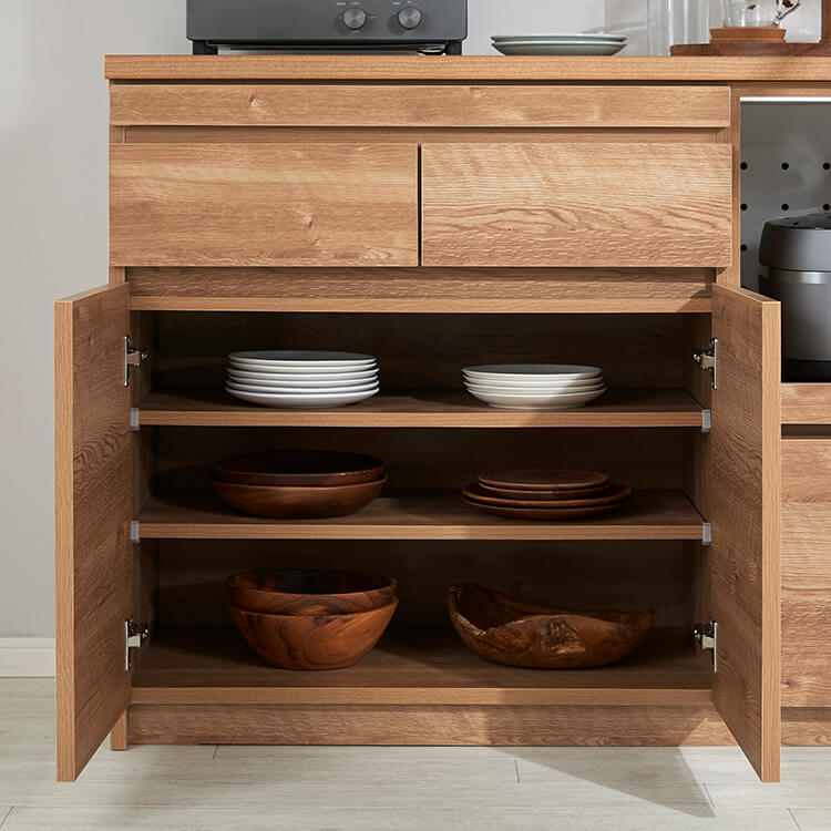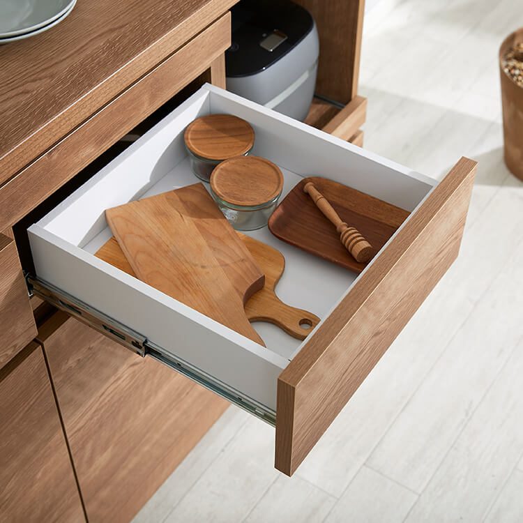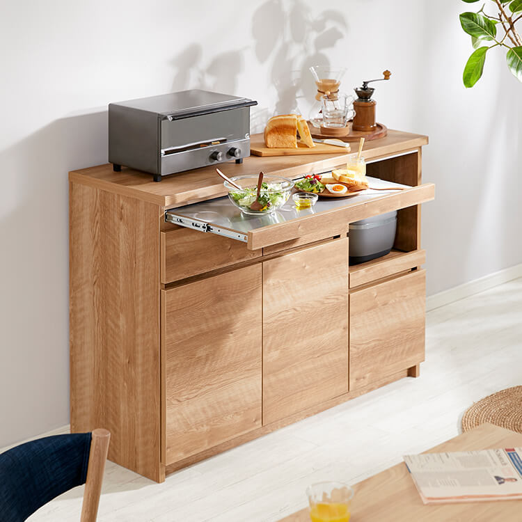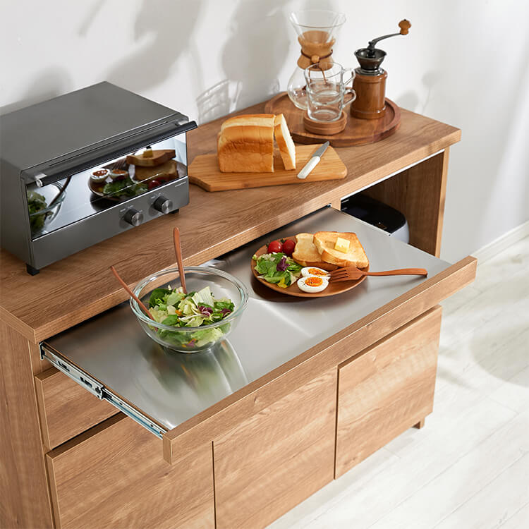 サッと引き出すだけで作業スペースが広がる、ステンレス製カウンター付きのキッチン収納。シンプルなフラットデザインの美しさと、機能性の高さが魅力です。「見た目も大事だけど、機能性にもこだわりたい」そんなあなたのためのキッチンカウンターです。限られたキッチンスペースを有効活用しつつ、おしゃれに演出します。最大の特徴はこのスライド式ステンレス製のカウンター。使いたい時にサッと引き出せ、調理中の食材置き場としても活躍。ステンレス製なので、汚れに強いのもうれしいポイントです。※傷防止の保護フィルム付きなので、剥がしてからご使用ください。熟練の家具職人が一つ一つ丁寧に真心こめて作り上げた完成度の高いキッチン収納。安価な輸入品とは違い、作り手のプライドと情熱が集結しています。