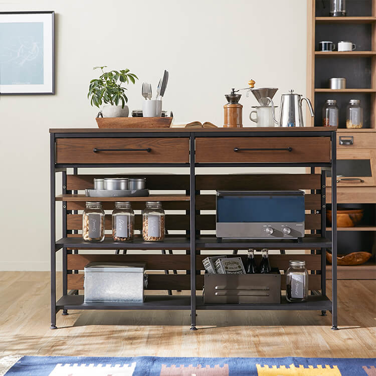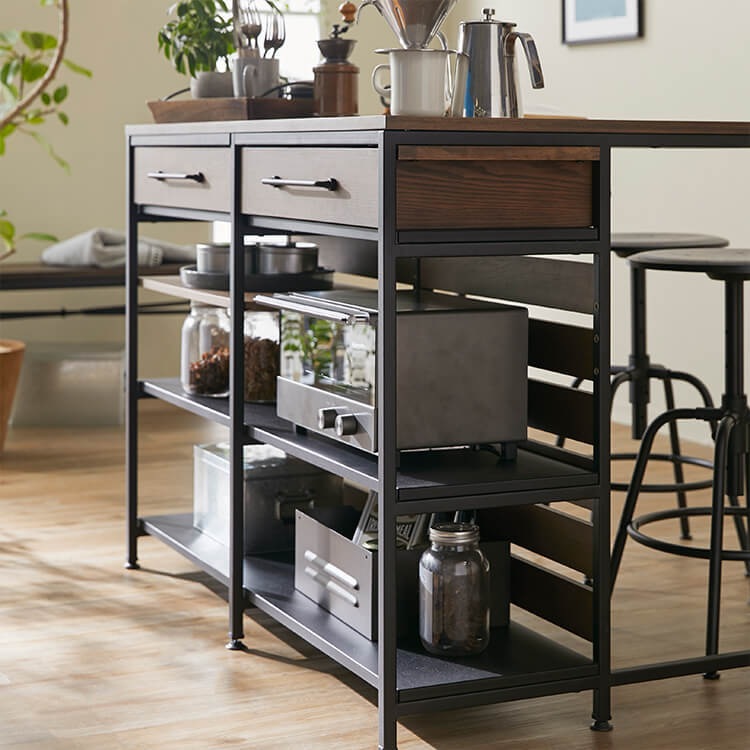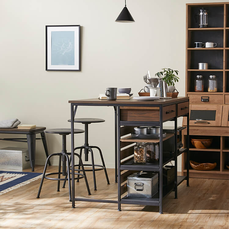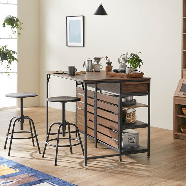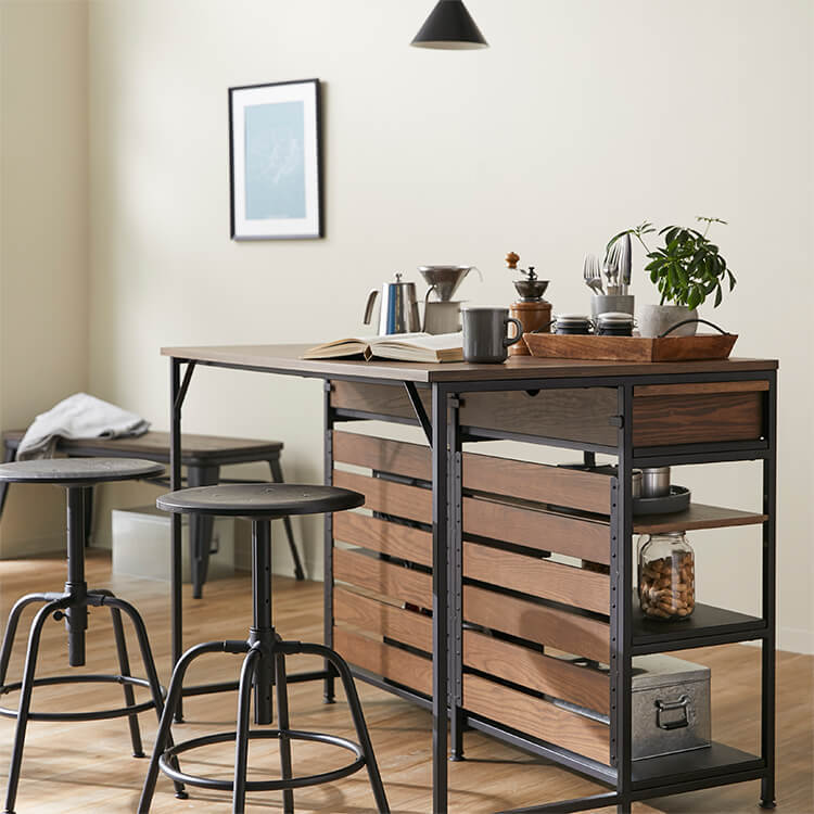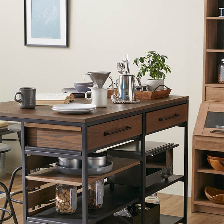 ゆったりと料理がはかどる憧れのキッチンカウンターに、対面でテーブル使いも出来る充分な広さが備わりました。異素材MIXでスタイリッシュな外見と、使い勝手のよい収納力が魅力のヴィンテージシリーズです。毎日触れるインテリアにこだわりを。自然の木目と絶妙な異素材が生み出すこなれたムードは、他のインテリアでは、なかなか真似できません。安価な化粧紙を貼っただけのプリント化粧板とは違い、天然木の突板を贅沢に使用しているため高級感が違います。使用したのは大柄で繊細な木目が人気のタモ材。1点1点木目や風合いが異なり、木本来のあたたかみある風合いや重厚感を存分に堪能できます。