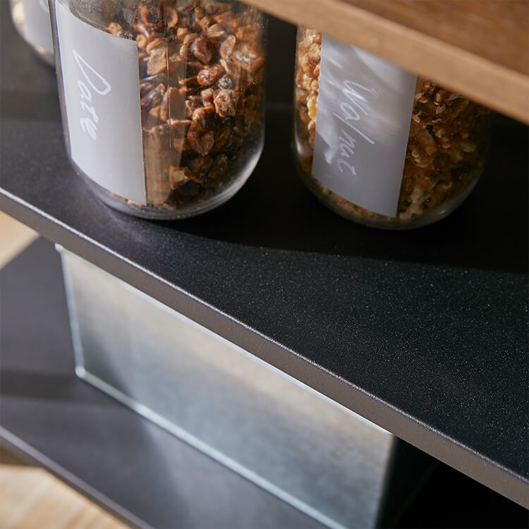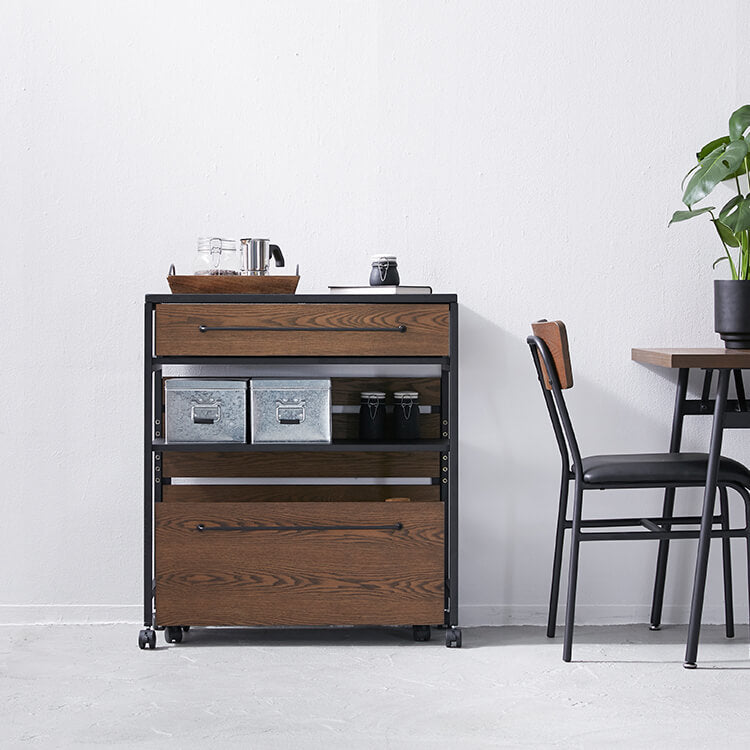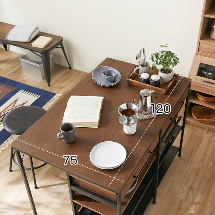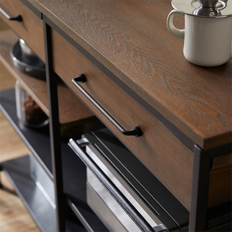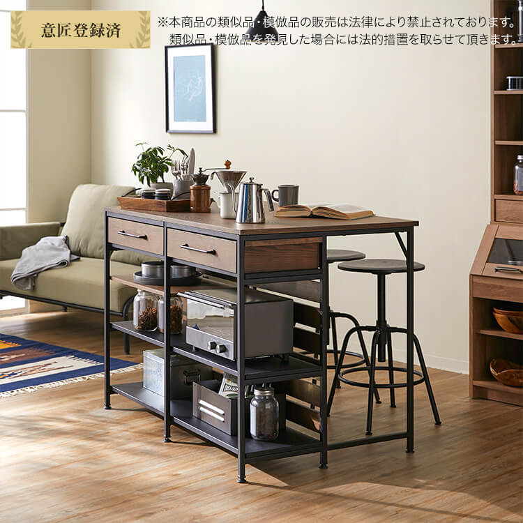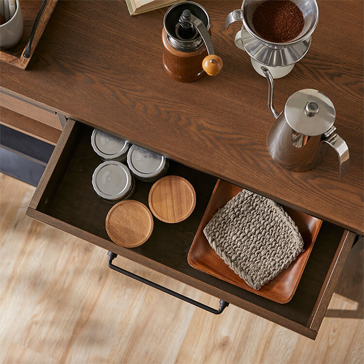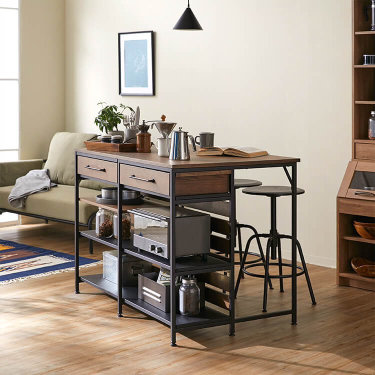 ゆったりと料理がはかどる憧れのキッチンカウンターに、対面でテーブル使いも出来る充分な広さが備わりました。異素材MIXでスタイリッシュな外見と、使い勝手のよい収納力が魅力のヴィンテージシリーズです。毎日触れるインテリアにこだわりを。自然の木目と絶妙な異素材が生み出すこなれたムードは、他のインテリアでは、なかなか真似できません。安価な化粧紙を貼っただけのプリント化粧板とは違い、天然木の突板を贅沢に使用しているため高級感が違います。使用したのは大柄で繊細な木目が人気のタモ材。1点1点木目や風合いが異なり、木本来のあたたかみある風合いや重厚感を存分に堪能できます。