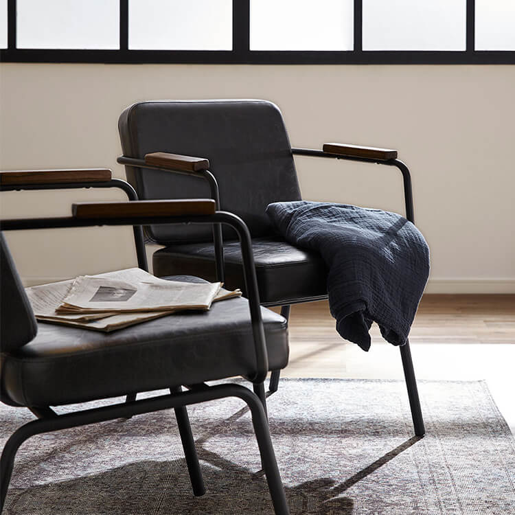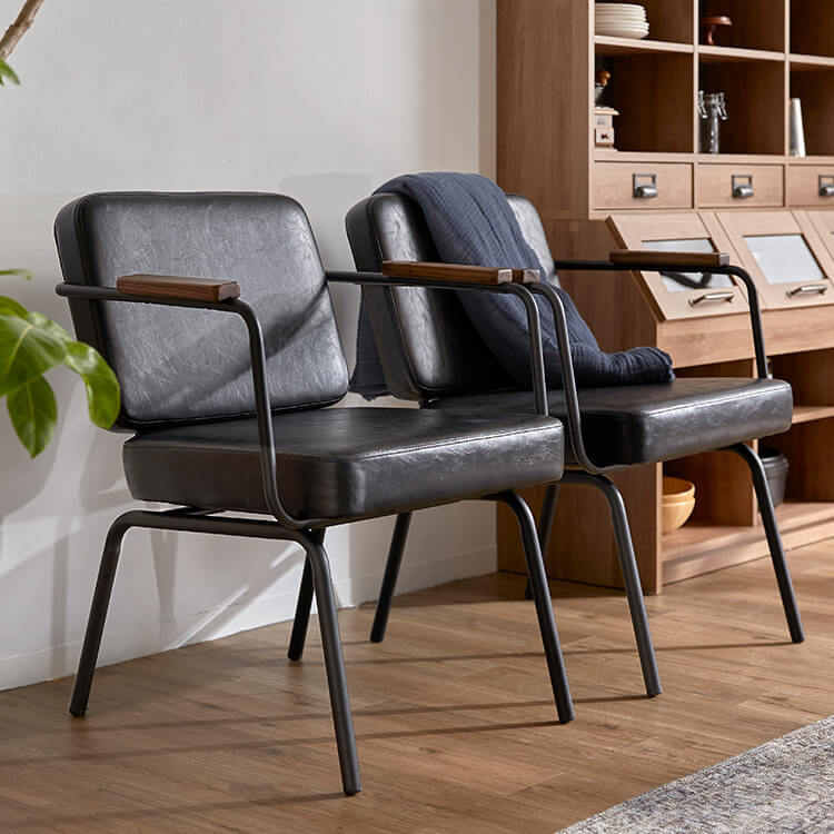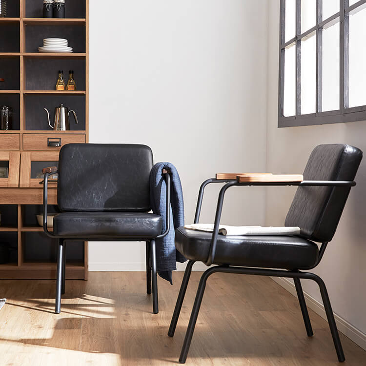 ソフトレザーとスチールの組み合わせが魅力のソファが、お洒落カフェのような居心地のよい空間へと導いてくれます。スチールの無機質な素材感に、重厚感のあるPVCソフトレザーを組み合わせれば、1つの素材では作りだせない新しいムードを創造。それぞれの素材の魅力を高め合います。1人でゆったり座ってくつろげる1Pソファ。お部屋に合わせやすいので、ダイニングスぺースや作業スペースなど、様々なシーンでお使いいただけます。皮革の美しさを再現した風合いある美しさと、サラッと心地よい肌触りが特徴のPVC(合成皮革)。キズや汚れに強く、お手入れも軽い汚れならサッと拭くだけでカンタンです。