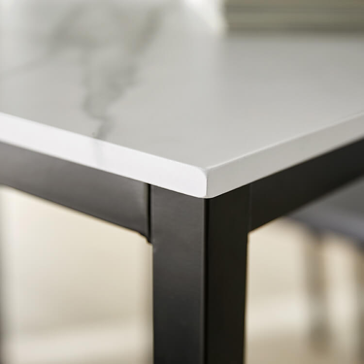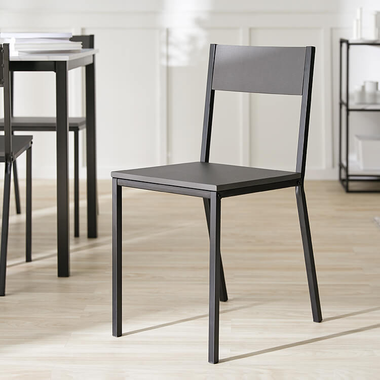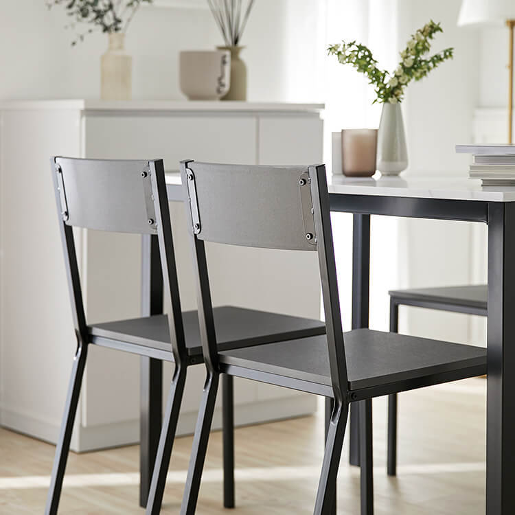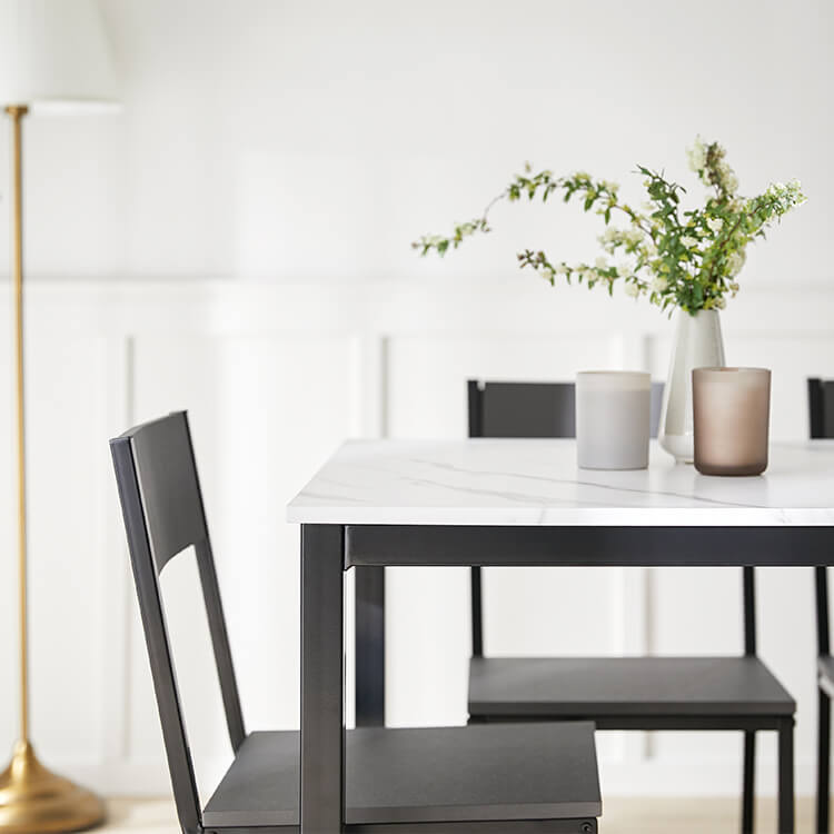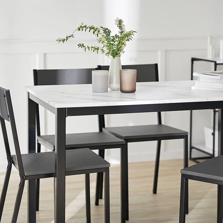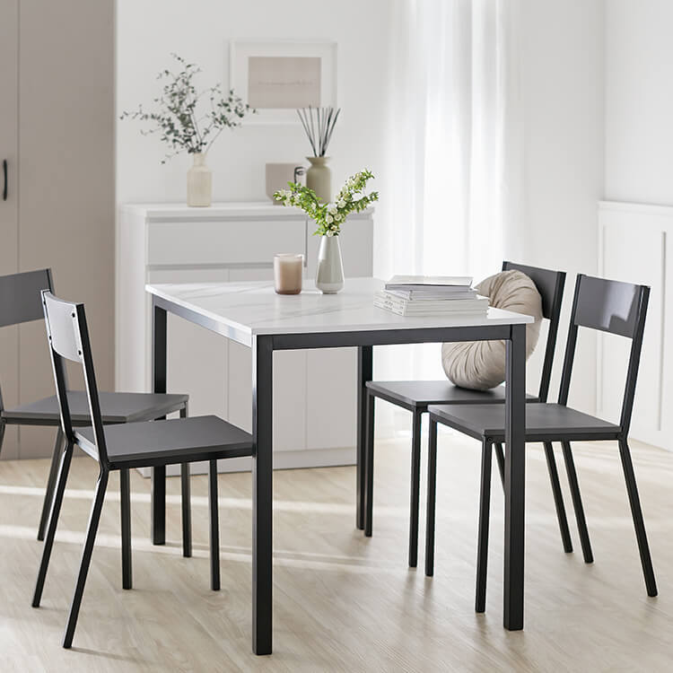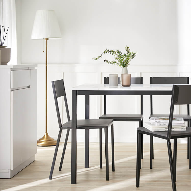 オフホワイトのシックな大理石柄天板とスマートに空間を引き締めるスチール脚。モダンな香りを運ぶダイニングセットが、贅沢で心地よいリラックスタイムをもたらします。洗練された海外インテリアのようなダイニングシーンをあなたのおうちにも。天板に入った大胆なマーブルパターンがお部屋のアクセントになり、あこがれのダイニング空間を作り出します。お部屋のスペースを取りがちなダイニングテーブル。圧迫感を減らしつつもしっかりと4人で座れるコンパクトタイプのダイニングセットです。置いた物までお洒落に魅せる大理石柄の天板。天板に入った大胆なマーブルパターンがお部屋にラグジュアリーなムードをプラスします。