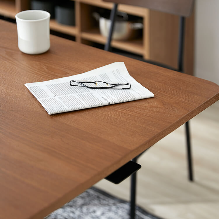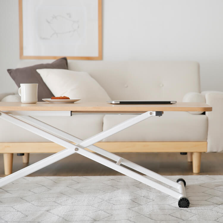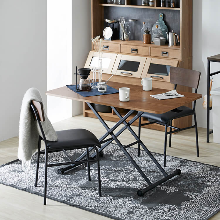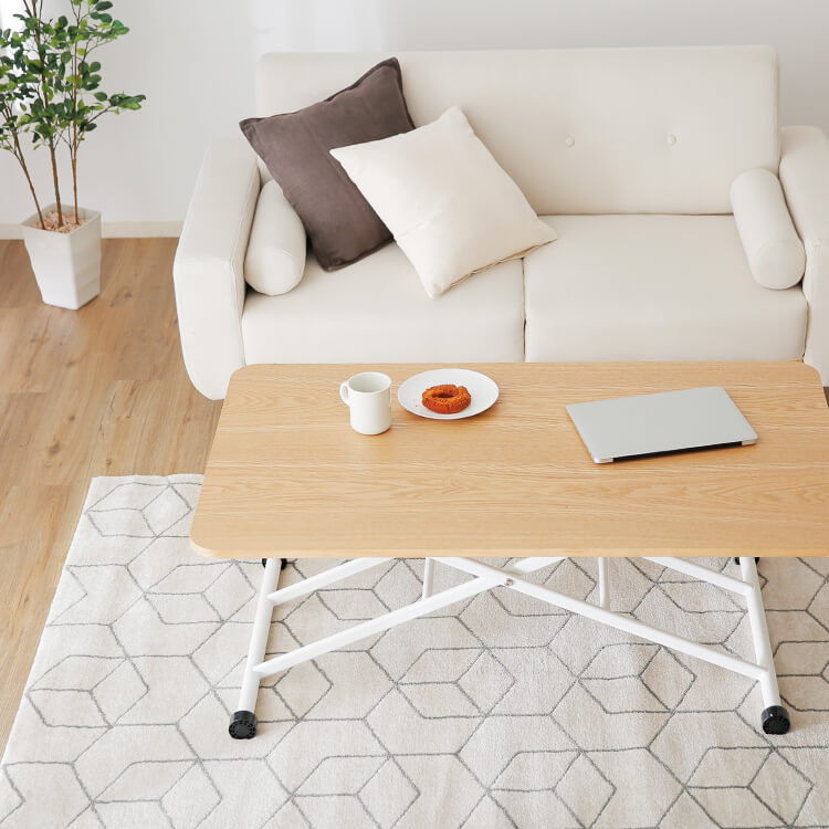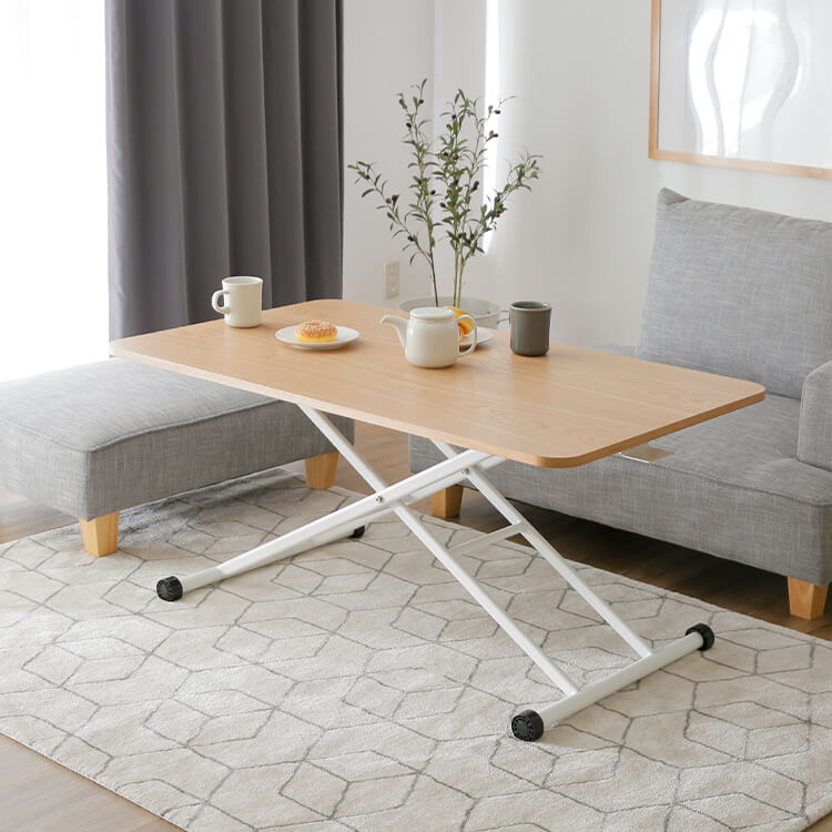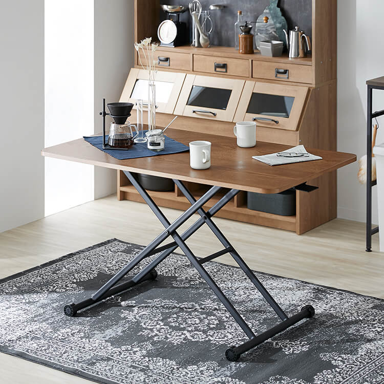 暮らしのスタイルに合わせて、高さが変更できる便利なテーブル。マルチに何役もこなすポテンシャルであなたの暮らしにぴったりフィットします。最大高さ71cmから最少高さ12cmまで幅広く 調整ができる昇降テーブル。自分好みに合わせた細やかな高さ調節ができる「無段階」仕様なので、この1台で様々な使い方が可能です。テーブルの昇降もカンタン。高くする時は、テーブルサイドにあるレバーを引くだけで、スーッと上へ天板が上昇します。※台の安定感を高めるため硬めの設計となっております。