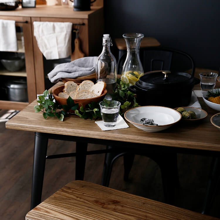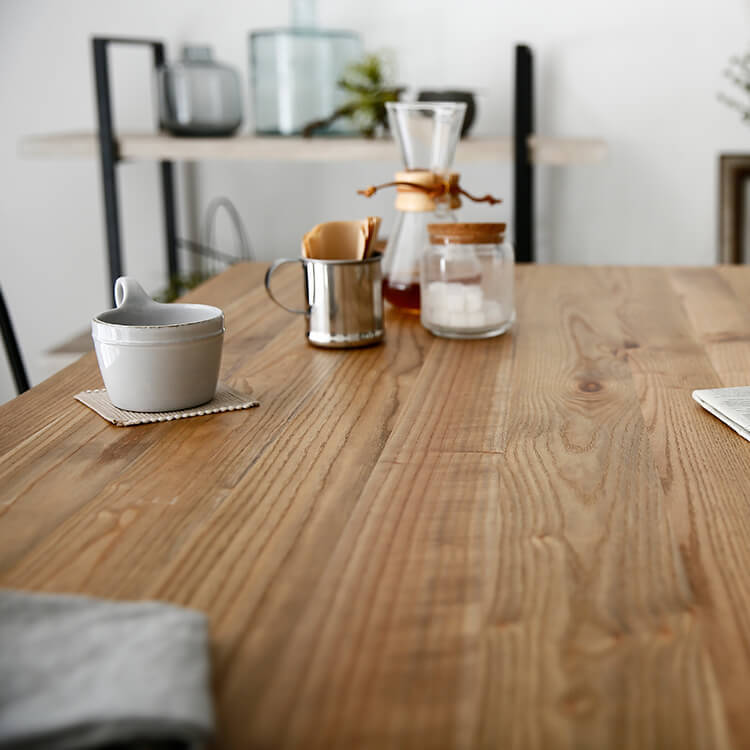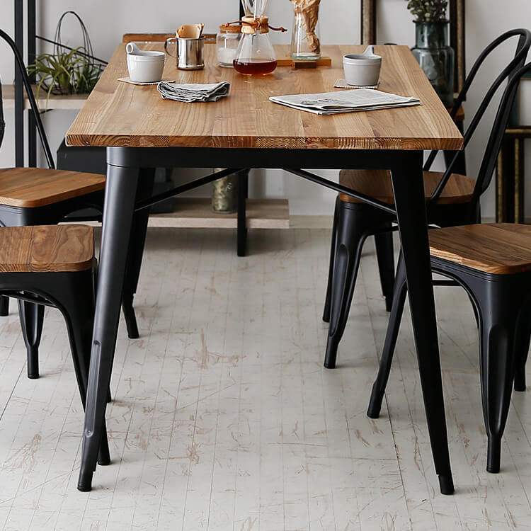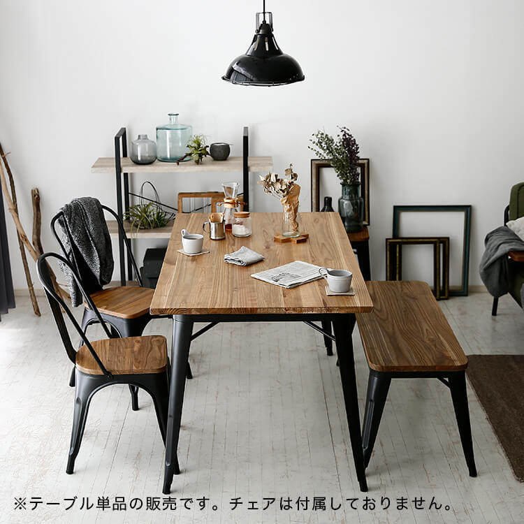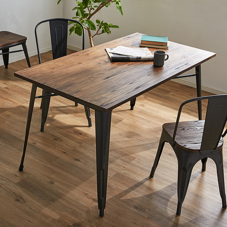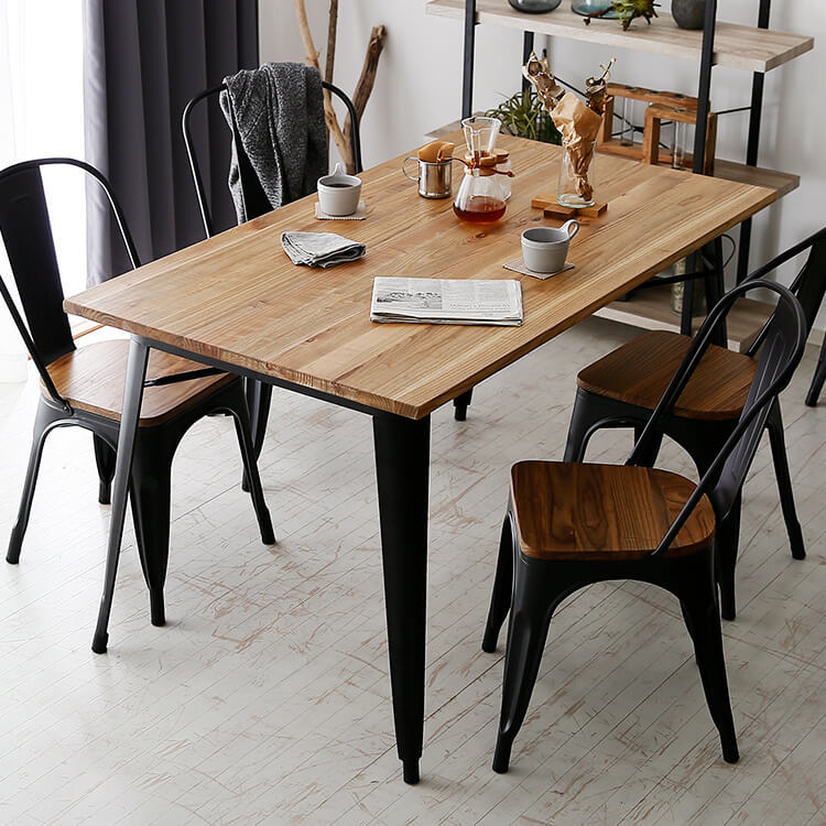 コーヒーの香りがしてきそうな心地よい空間を作り、心地よい時間が流れます。誰もが使いやすいバランスのヴィンテージダイニングテーブル。人気の異素材ミックスが生み出す、おしゃれなムードが魅力。たっぷり使えるワイドな天板だから、お料理がたくさん乗ります。大人が4人座っても狭さを感じさせないゆとりある広さで、ホームパーティーにもおすすめのサイズ感です。無骨なスチールの素材感と無垢材を合わせることで洗練されたイメージに落とし込みました。