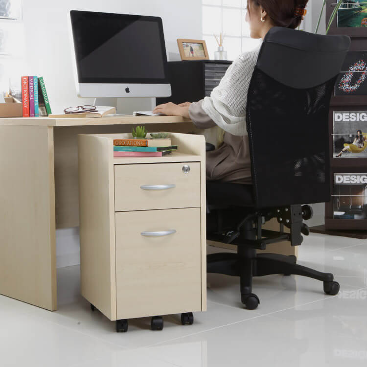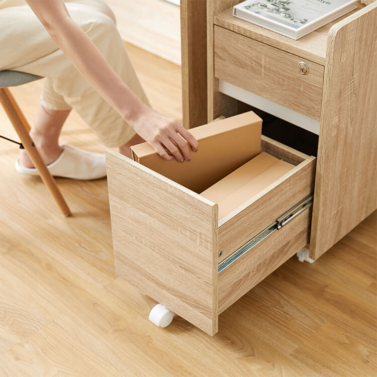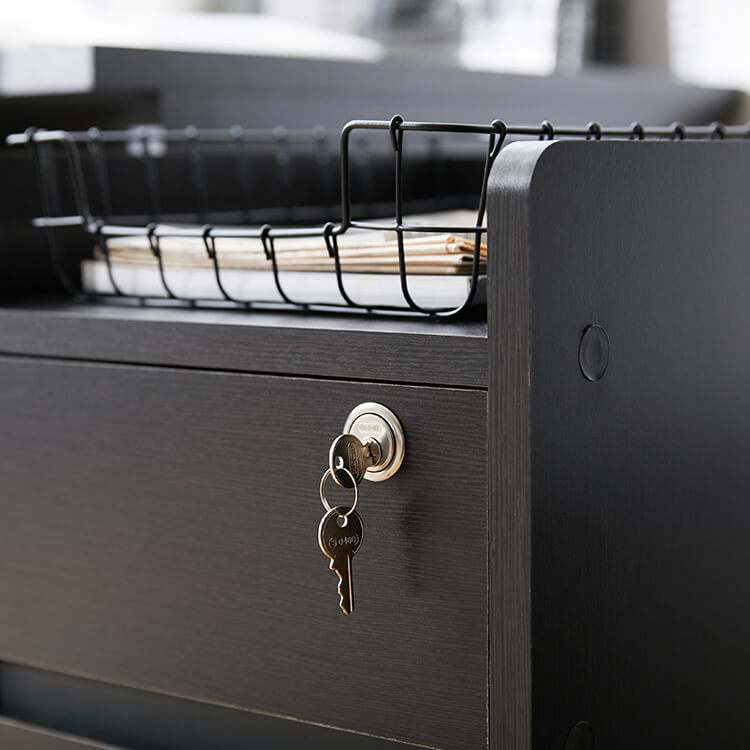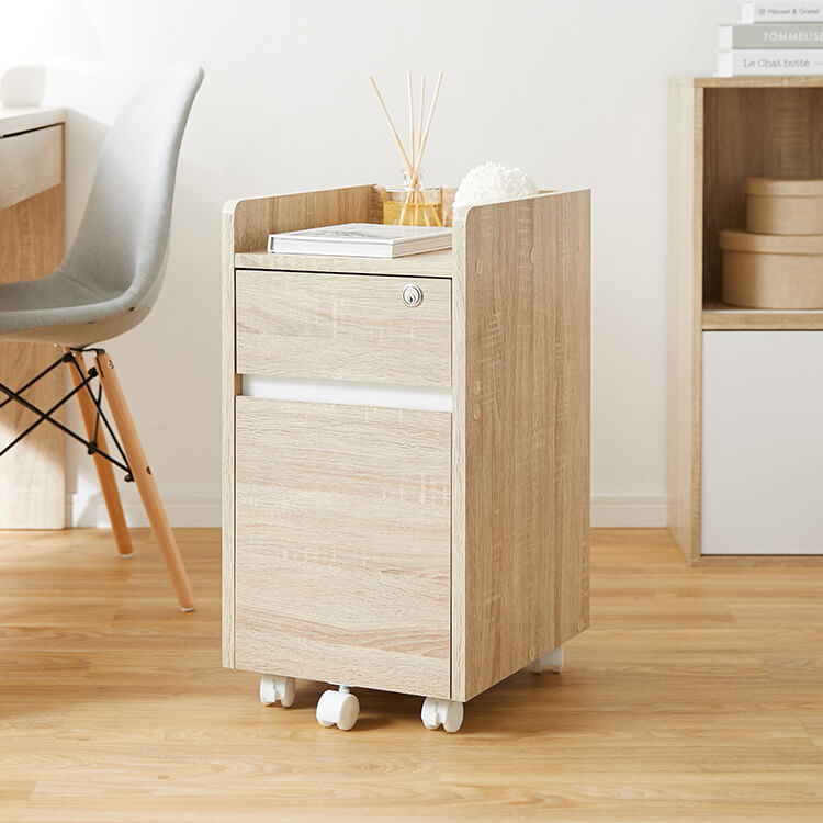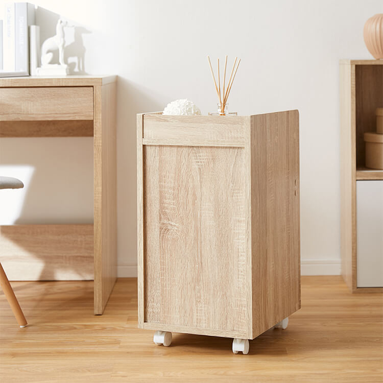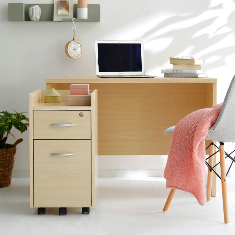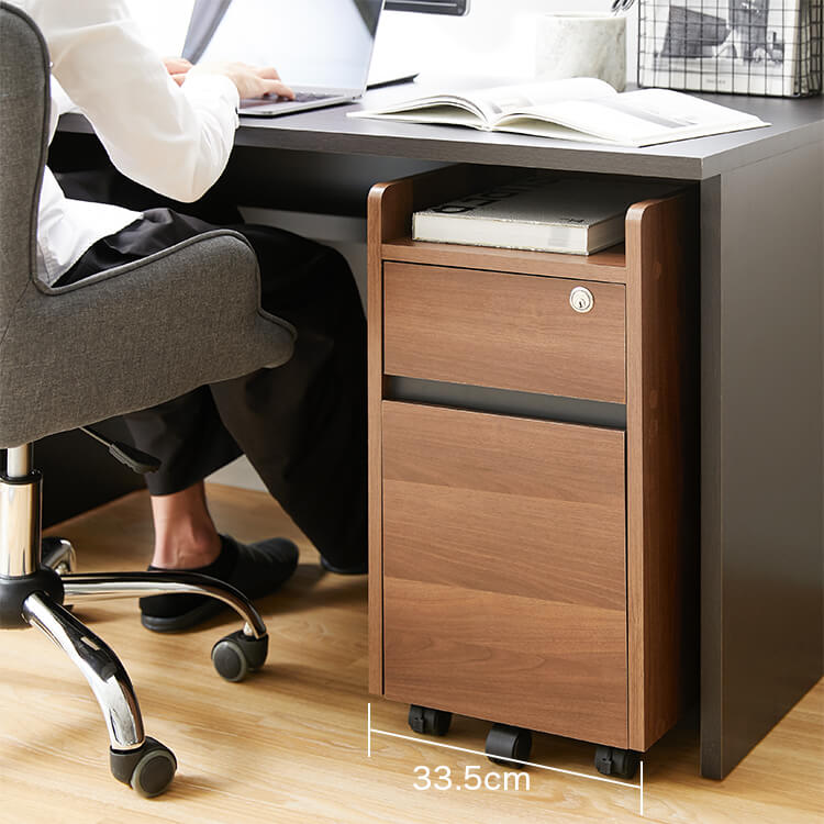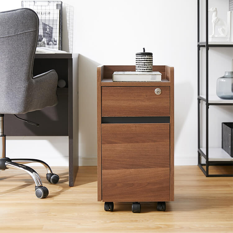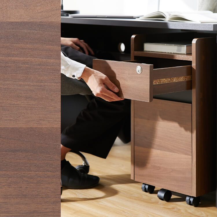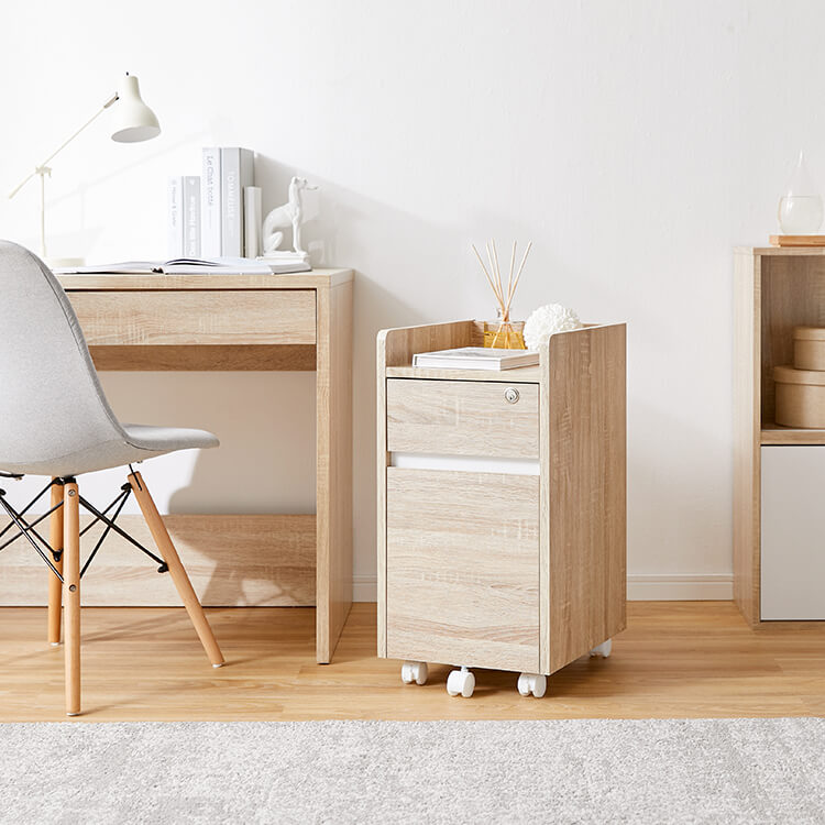 美しい木目調に選べる2トーンカラーがオシャレなサイドチェスト。スリムな見た目なのにしっかり収納できる、デスク回りの頼もしい存在です。このチェストの魅力は、デスク下の脚元においても邪魔にならないスリムな幅。しっかりとA4ファイルが収まる収納力もポイントです。木目の中に目を惹く2トーンカラーは、なんと「リバーシブル」仕様。組み立ての際に選んでお楽しみいただけます。思わず触れたくなるような木目調は、木のぬくもりを表現したリアルな造り。ナチュラルで柔らかい雰囲気がお部屋に馴染みます。