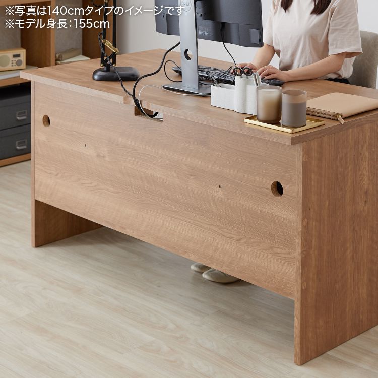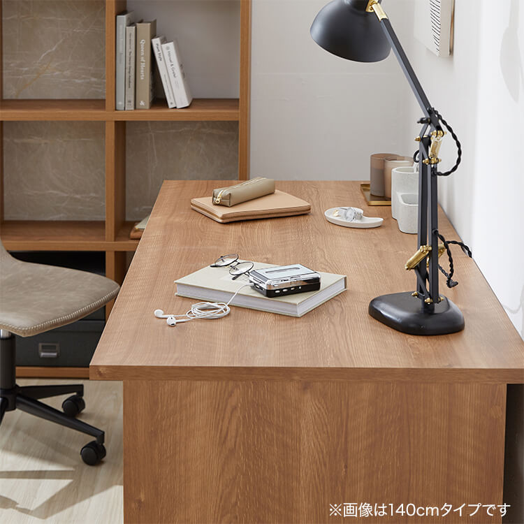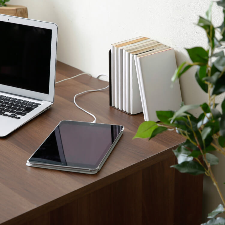 パソコンデスクの周辺はいつも配線がゴチャゴチャ。床に散らばるコードのせいで、足に引っ掛かったり、掃除もしにくく見た目も悪い……。そんな『デスクあるある』を解消する、タップ収納付きデスクです!オフィスや在宅勤務でも活躍する、シンプルで便利なスマートデスク。パソコンデスクにありがちな沢山の配線を1か所にまとめられる仕組みを備えました!当社でしか購入できないオリジナル商品です。パソコンデスクに付きものの周辺機器のコード類。スッキリとまとめる事ができれば、毎日のワークスペースがより快適な環境に変わります。約10.5cmの奥行があるので、ケーブルやモデムも丸ごと置けます◎ごちゃついたコードが解決するのはもちろん、邪魔になりがちなケーブル収納を別に購入する必要もありません。