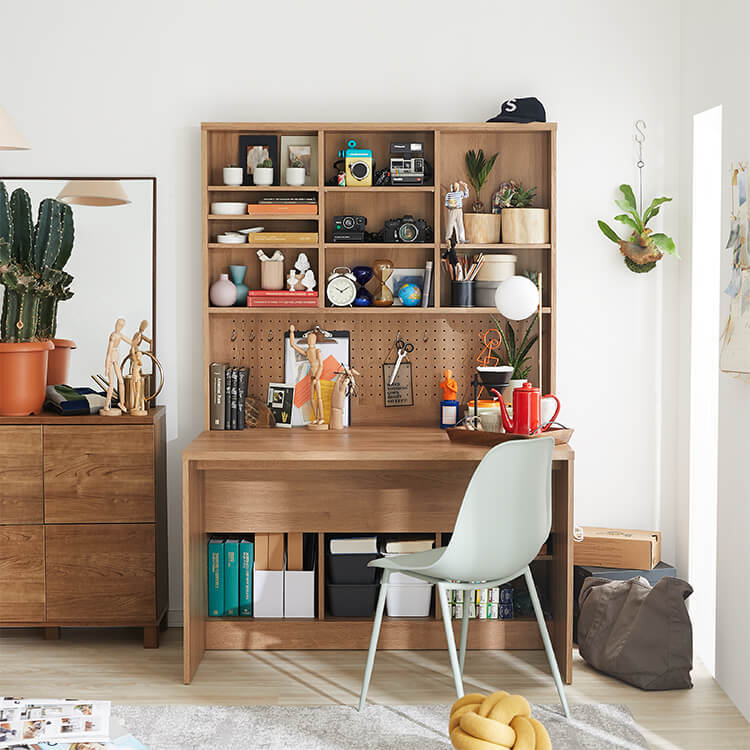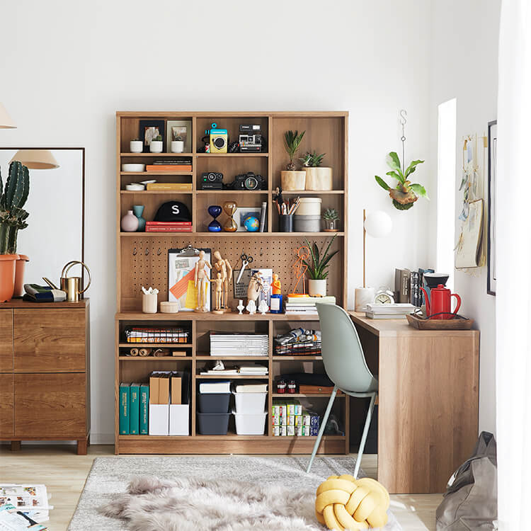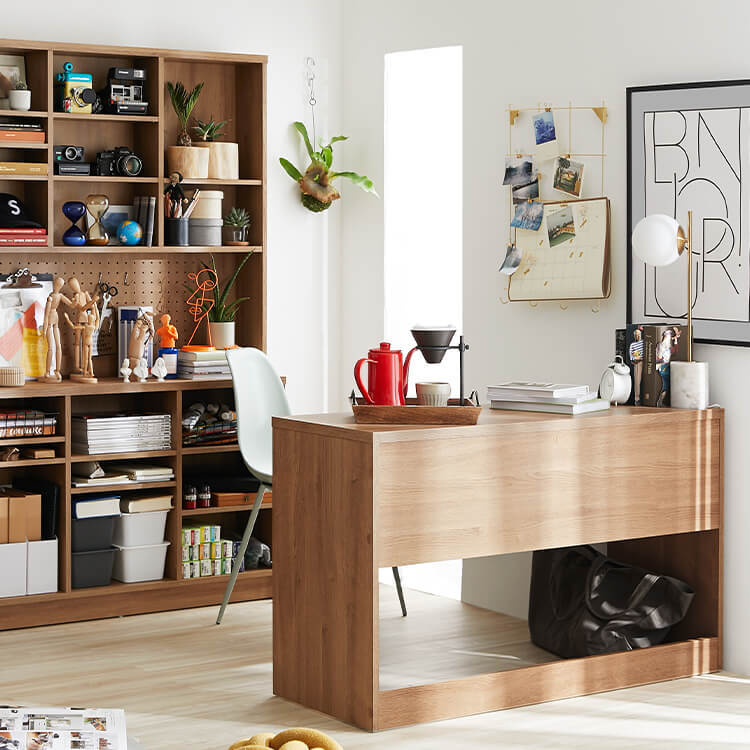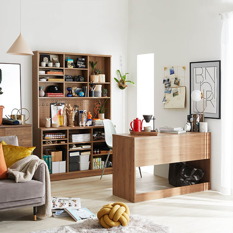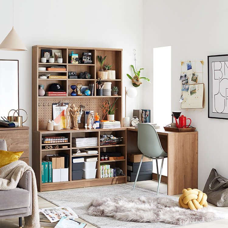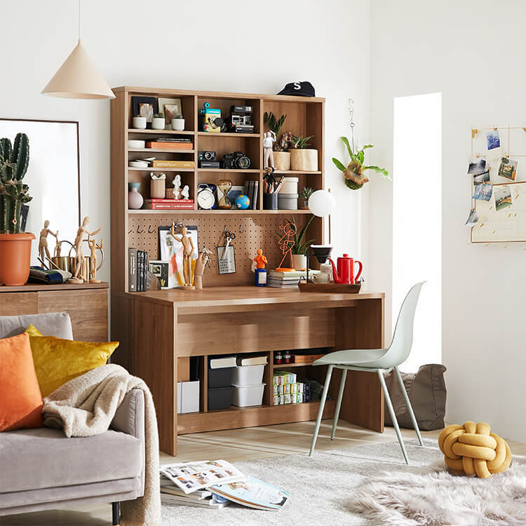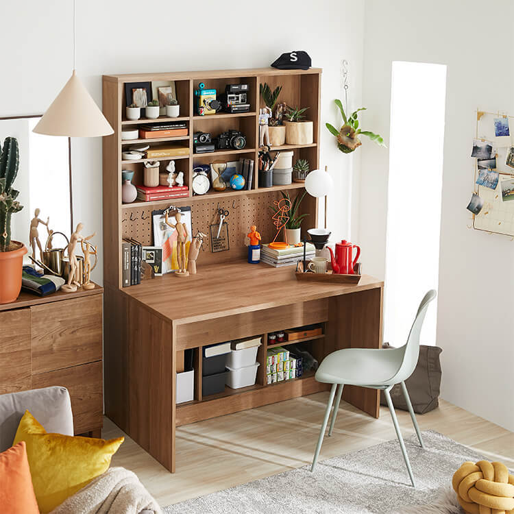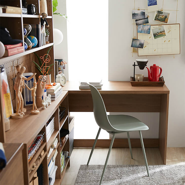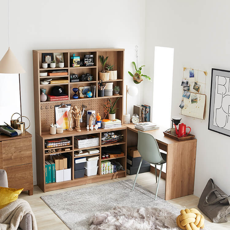 「限られたスペースでも、オシャレにまとまる書斎が欲しい。」その発想から生まれたのが、このシステムデスク。自由な組み換え機能と、大容量の壁面収納。美しく機能性が高いシステムデスクです。お部屋を「使い勝手の良い書斎スペース」へと変えてくれる秘密は、壁面収納とデスクを独立させたこと。よくある一体型のシステムデスクでは出来なかった、自由な組み換えが可能になりました。ご紹介する組み換えパターンは、3パターン。(1)L字スタイル 、 (2)書斎スタイル 、 (3)壁面収納スタイル と、あなたにピッタリのスタイルがきっと見つかるはずです。思わず触れたくなるような木目調は、木のぬくもりを表現したリアルな造り。ナチュラルで柔らかい雰囲気がお部屋に馴染みます。