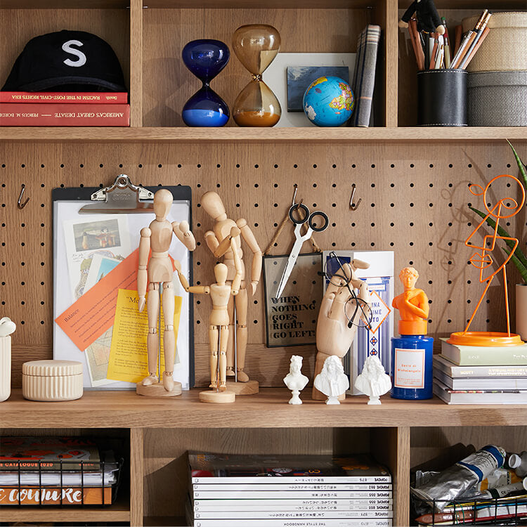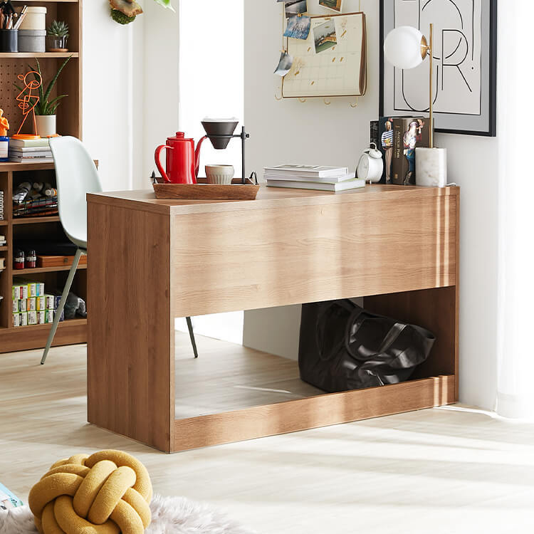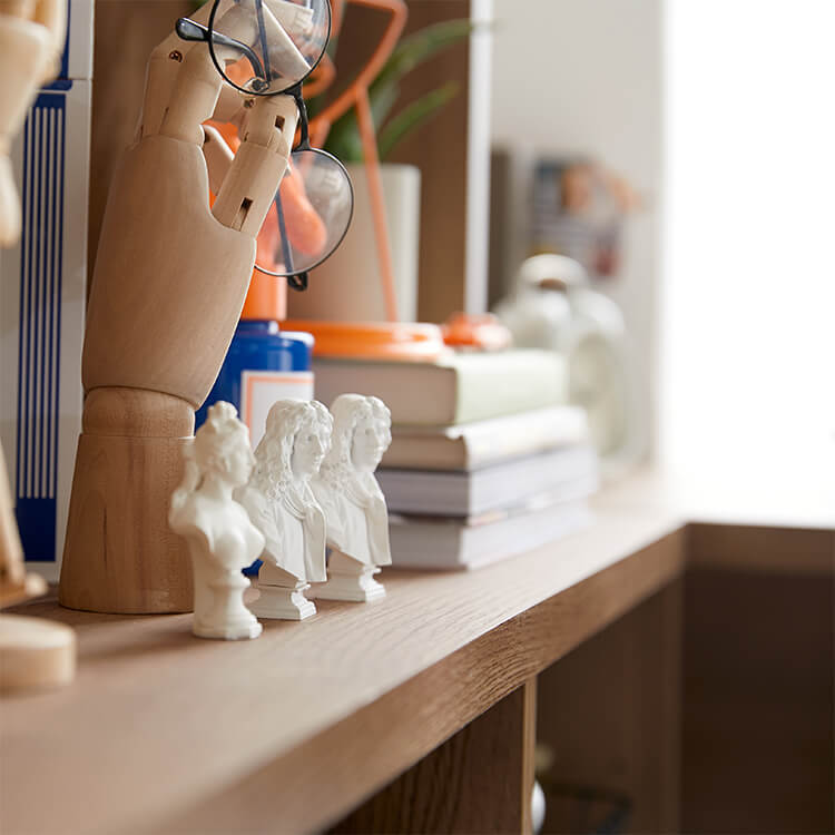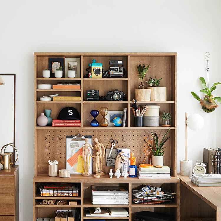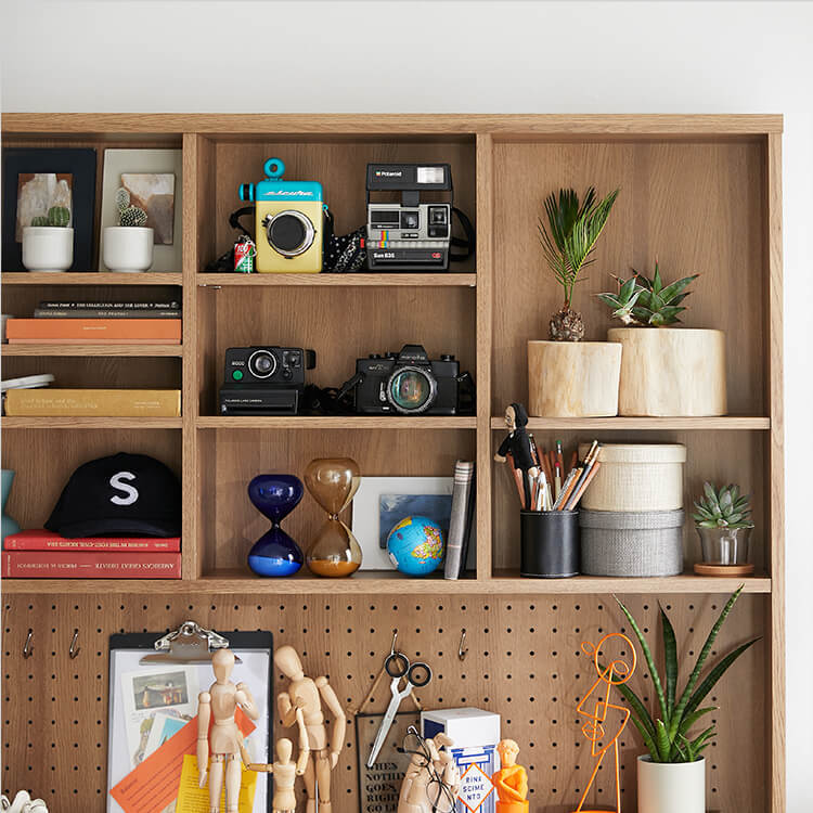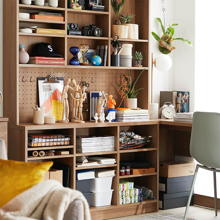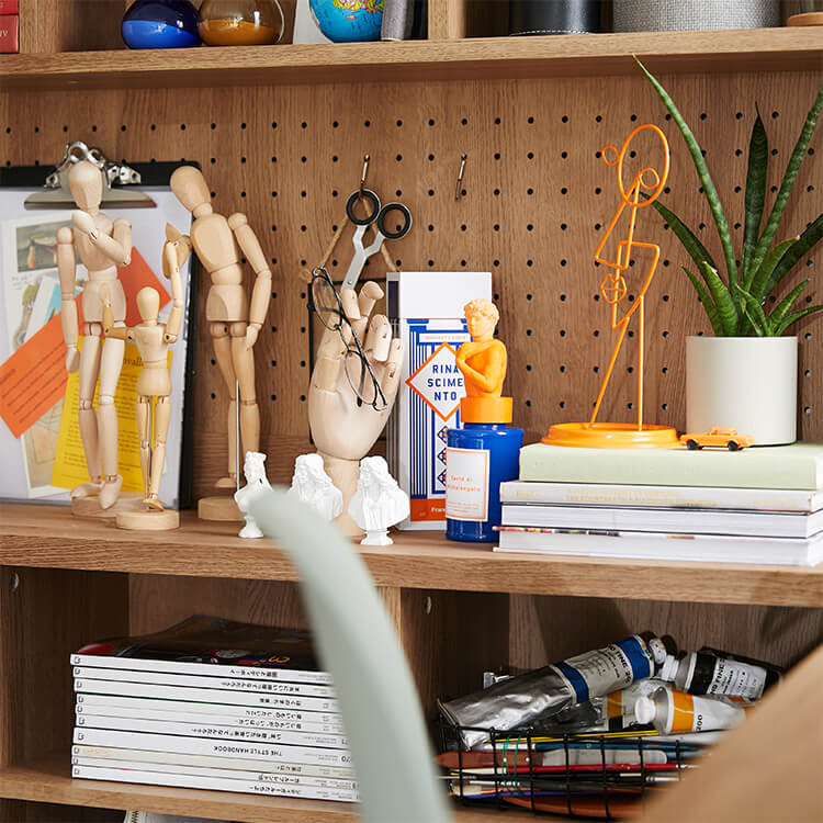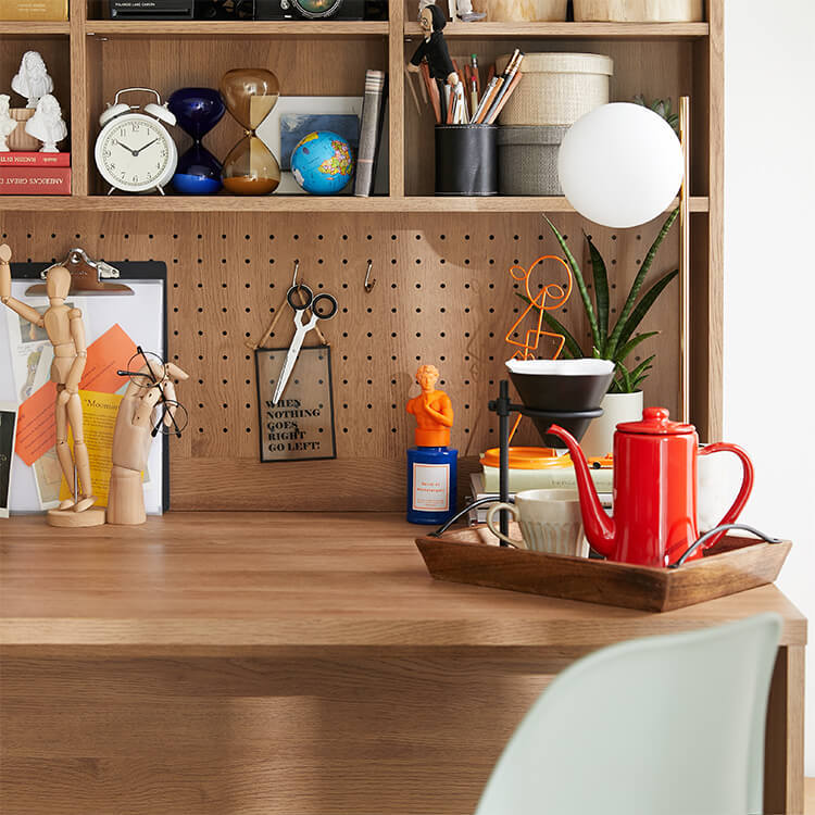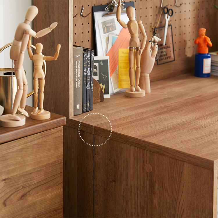 「限られたスペースでも、オシャレにまとまる書斎が欲しい。」その発想から生まれたのが、このシステムデスク。自由な組み換え機能と、大容量の壁面収納。美しく機能性が高いシステムデスクです。お部屋を「使い勝手の良い書斎スペース」へと変えてくれる秘密は、壁面収納とデスクを独立させたこと。よくある一体型のシステムデスクでは出来なかった、自由な組み換えが可能になりました。ご紹介する組み換えパターンは、3パターン。(1)L字スタイル 、 (2)書斎スタイル 、 (3)壁面収納スタイル と、あなたにピッタリのスタイルがきっと見つかるはずです。思わず触れたくなるような木目調は、木のぬくもりを表現したリアルな造り。ナチュラルで柔らかい雰囲気がお部屋に馴染みます。