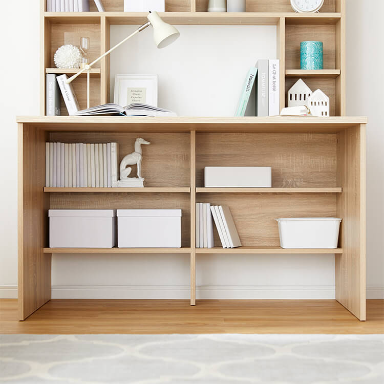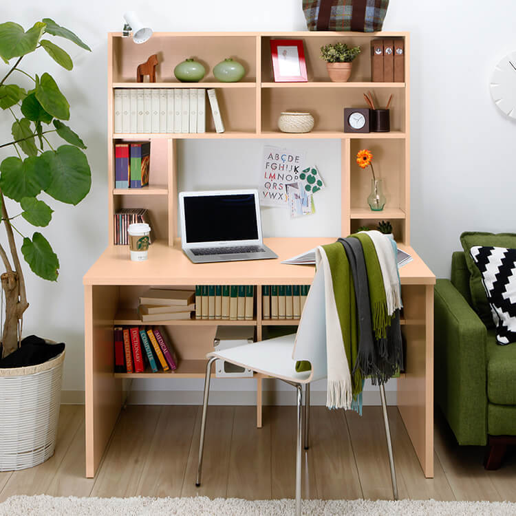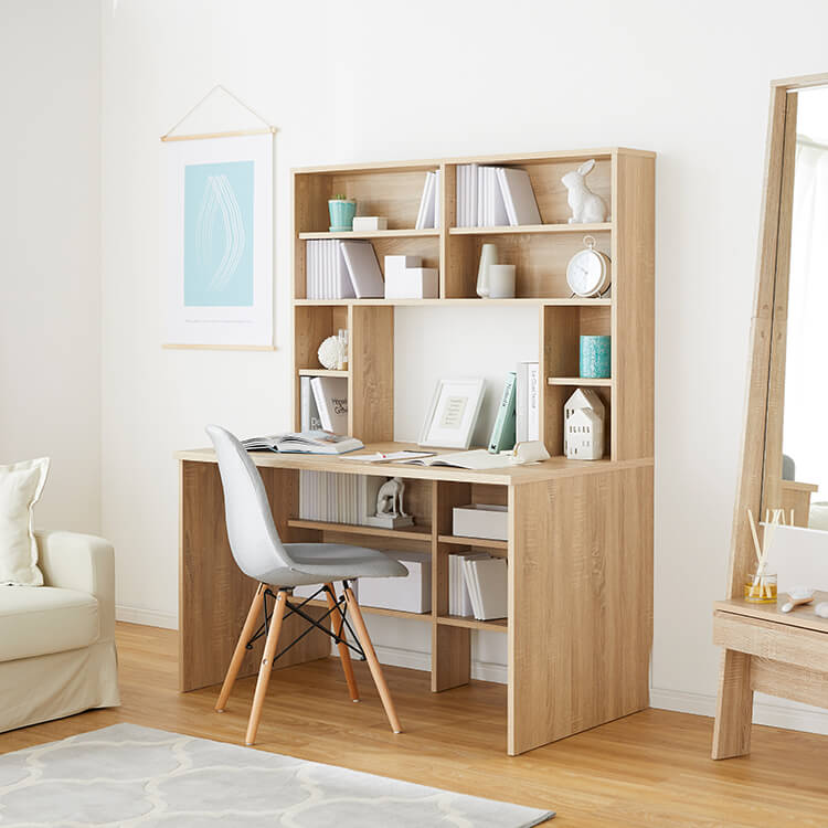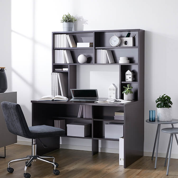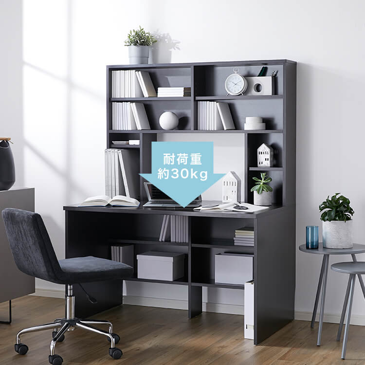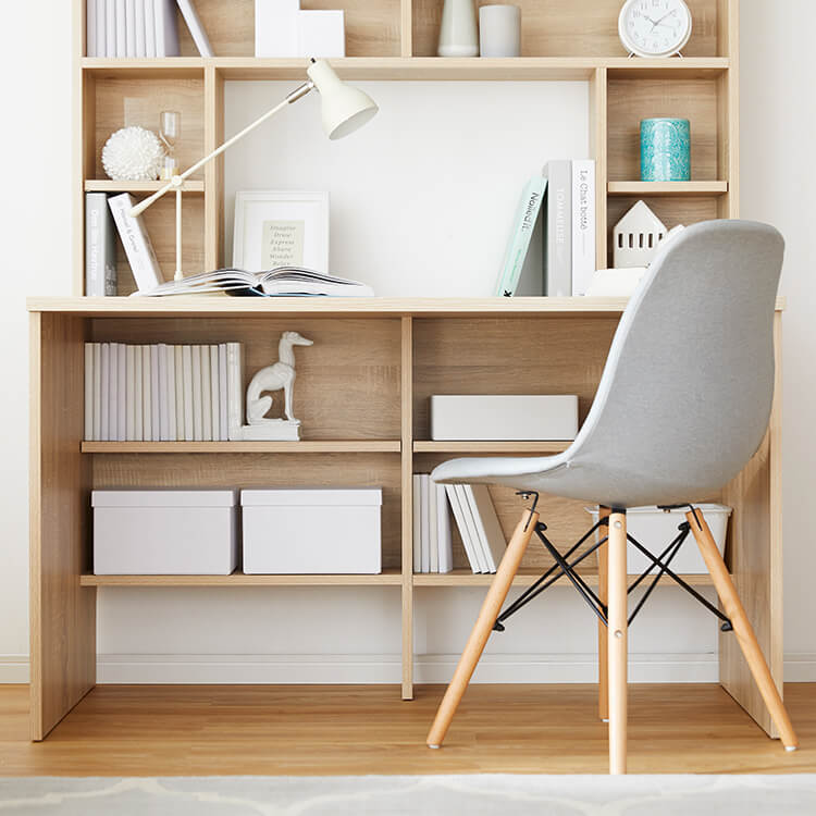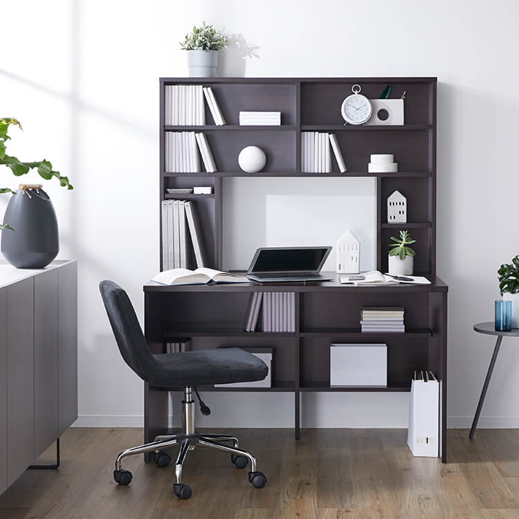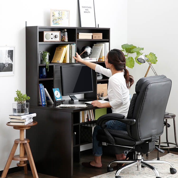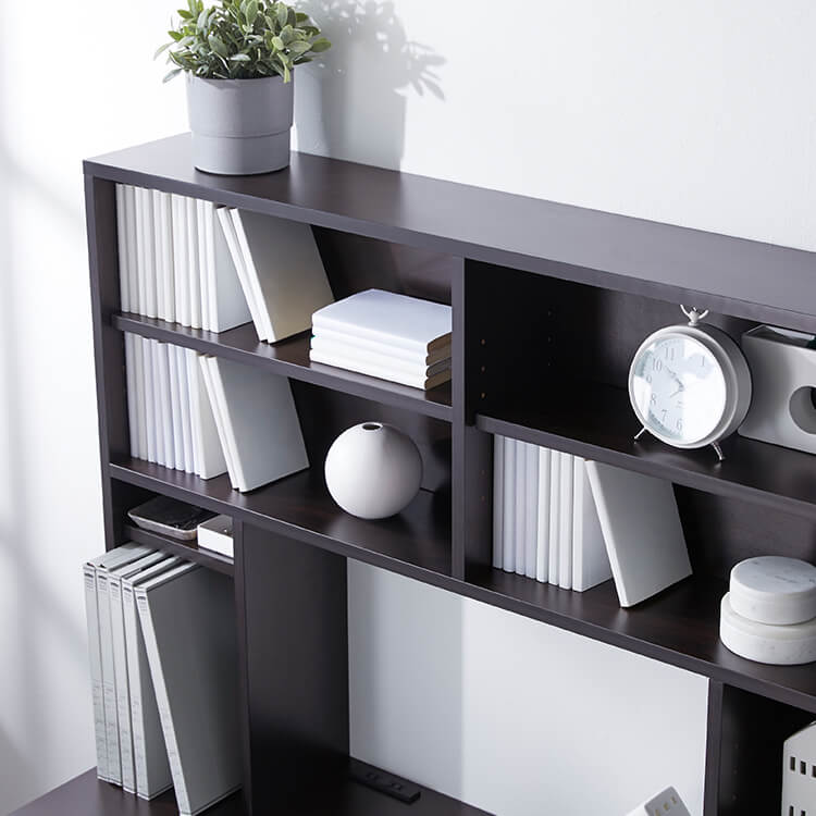 コンパクトな120cm幅のデスクに、たっぷり収納できる本棚を一体化。ワンルームにも置けるサイズ感で、便利なデスクスペースが作れます。見上げればそこには、必要なものがすぐに取り出せる壁面本棚。必要なものがデスク上にまとまっていることで、すぐに手が届くので、仕事や勉強の効率がグッとUPします。本好きにはたまらない、壁面いっぱいの本棚があなたのものに。コンパクトな見た目とは裏腹の、たっぷりとした収納力が自慢です。上棚の大小各2箇所と下段合わせて、計6箇所の棚板は、自由に動かせる可動式。とても使いやすく、取り外しも簡単!用途に合わせて調整可能です。