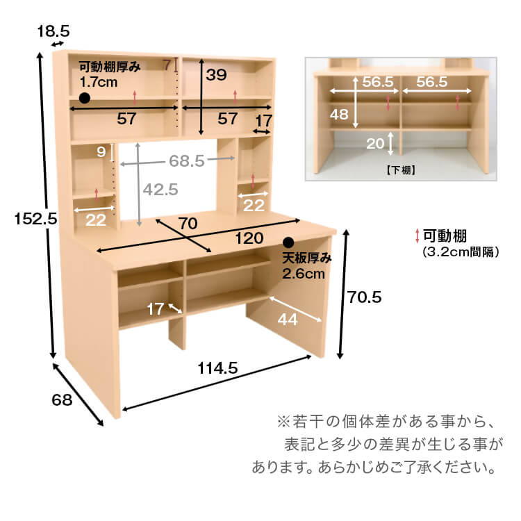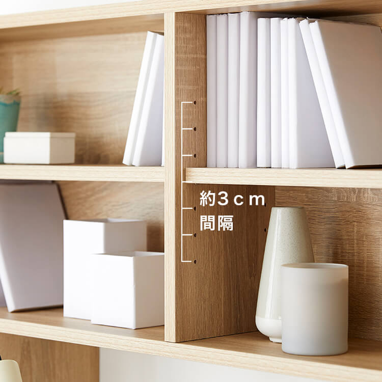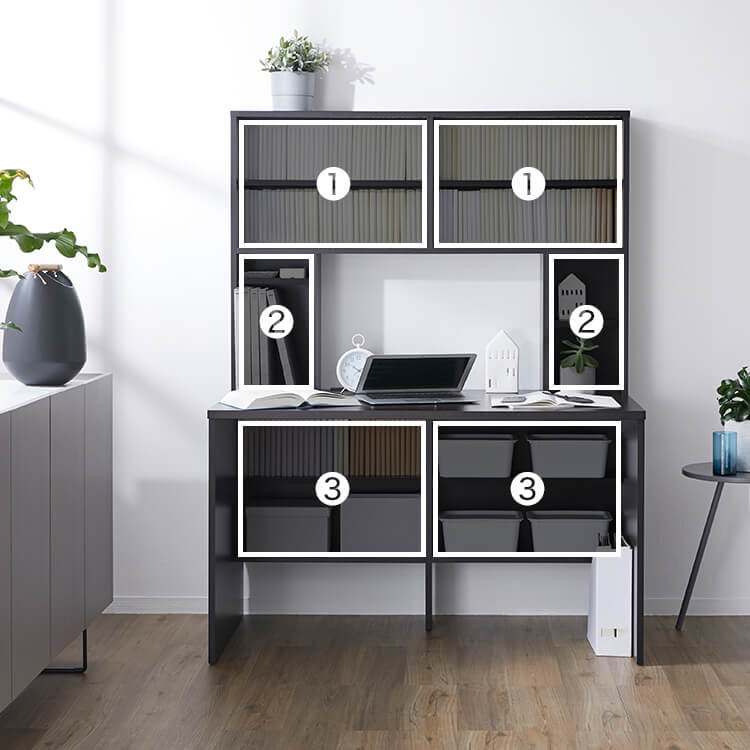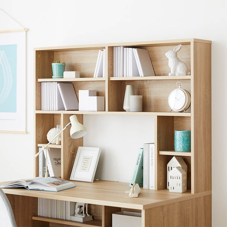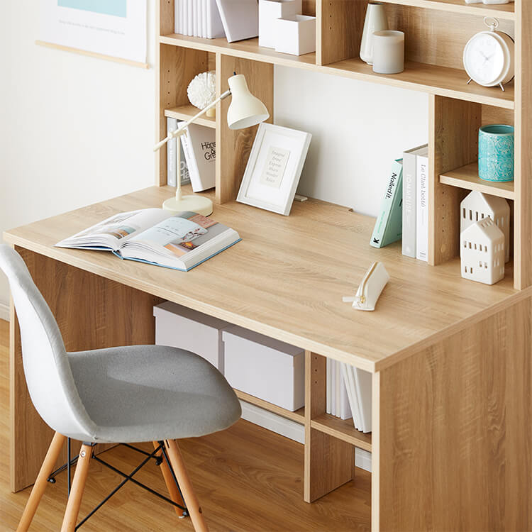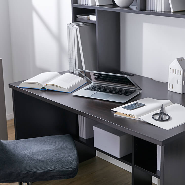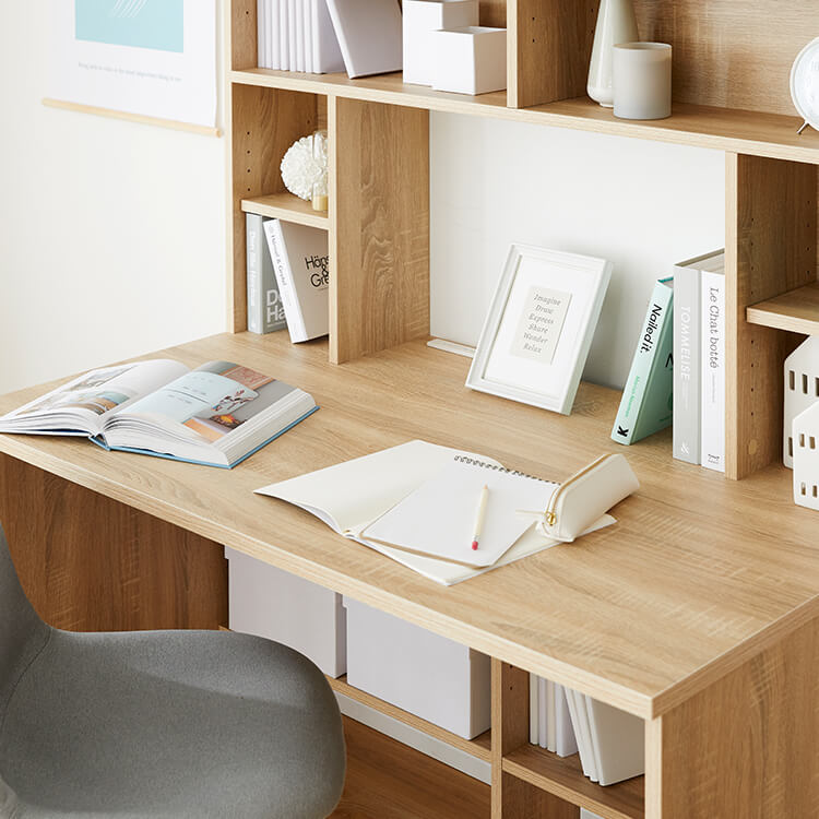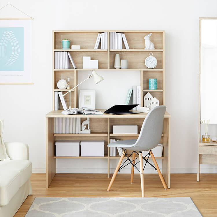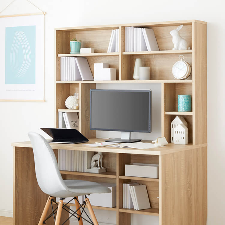 コンパクトな120cm幅のデスクに、たっぷり収納できる本棚を一体化。ワンルームにも置けるサイズ感で、便利なデスクスペースが作れます。見上げればそこには、必要なものがすぐに取り出せる壁面本棚。必要なものがデスク上にまとまっていることで、すぐに手が届くので、仕事や勉強の効率がグッとUPします。本好きにはたまらない、壁面いっぱいの本棚があなたのものに。コンパクトな見た目とは裏腹の、たっぷりとした収納力が自慢です。上棚の大小各2箇所と下段合わせて、計6箇所の棚板は、自由に動かせる可動式。とても使いやすく、取り外しも簡単!用途に合わせて調整可能です。