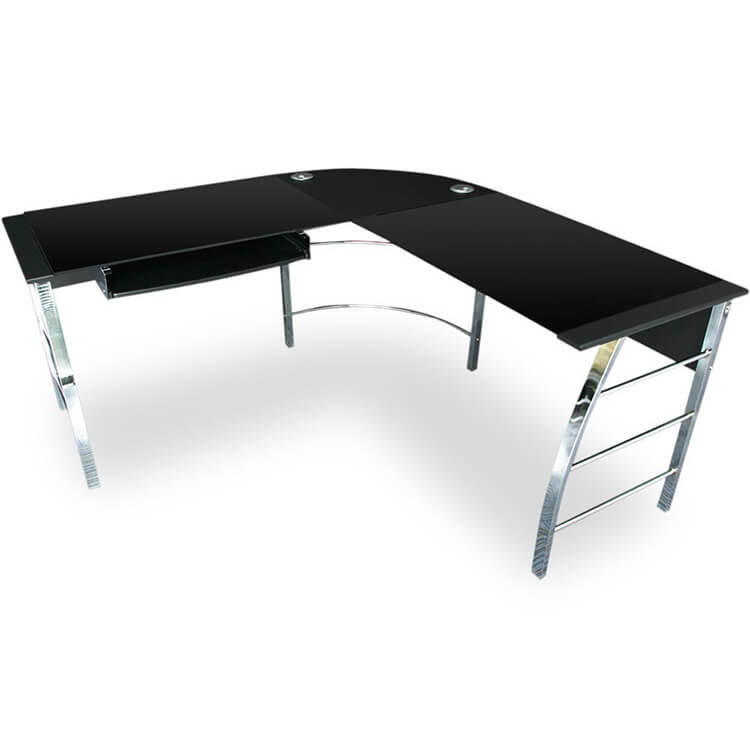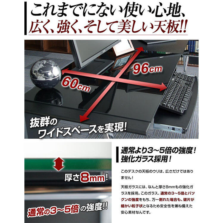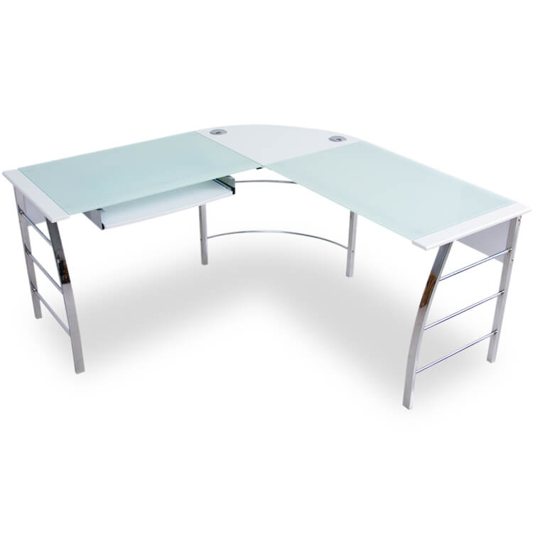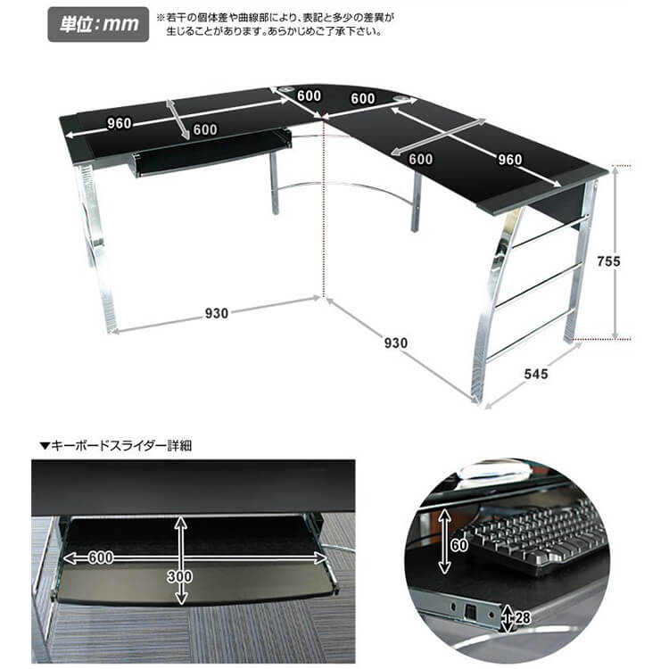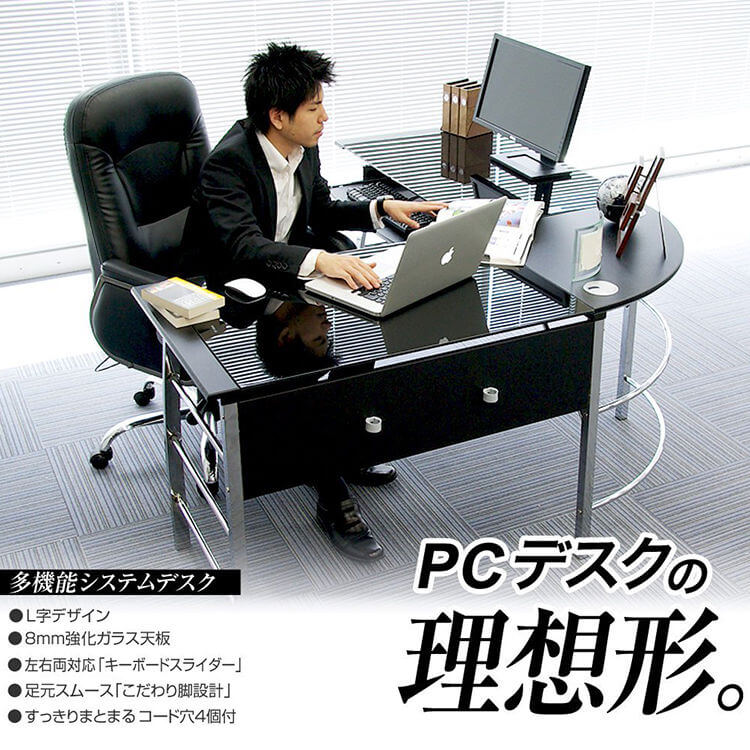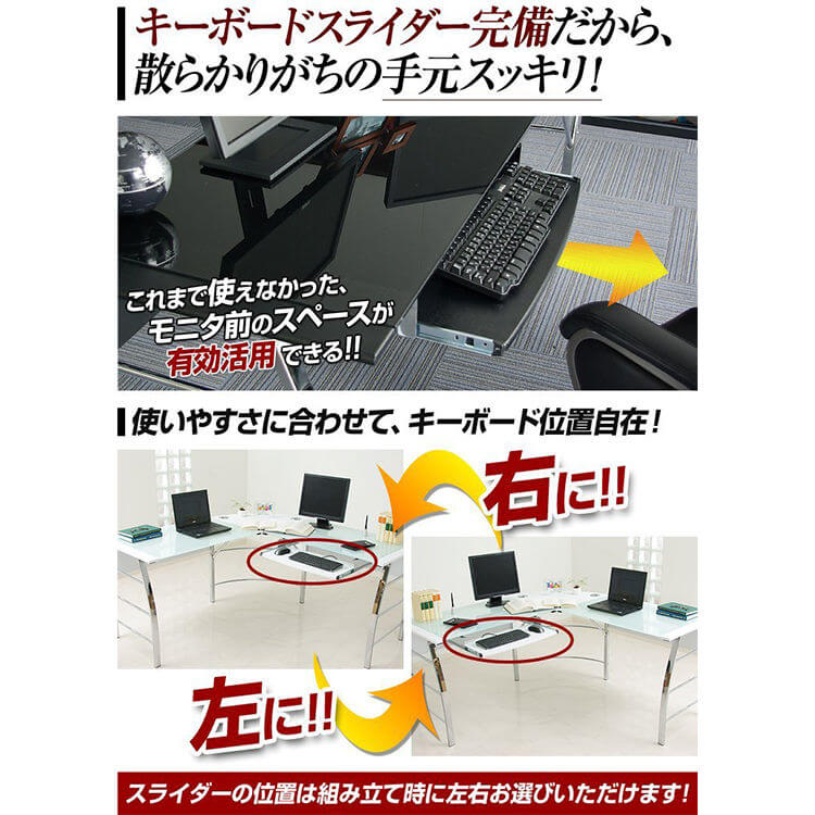 L字デスク コード穴付き キーボードスライダー付き ガラス天板