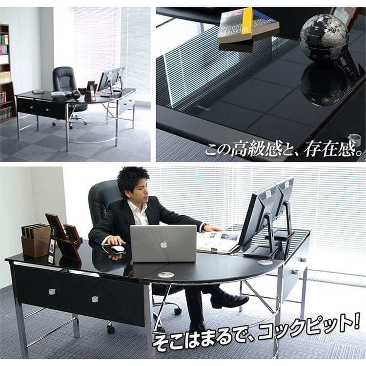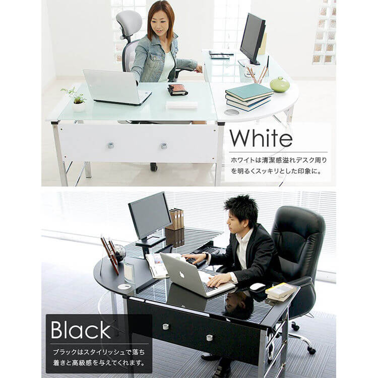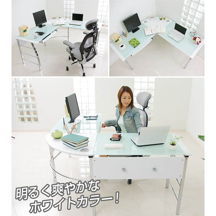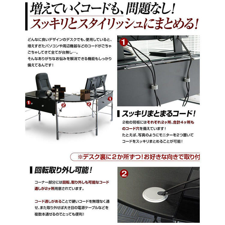 ガラス天板でスタイリッシュなL字デスクです。2箇所のコード穴とコードをまとめるバンド付きで、パソコン機器などのコードを綺麗にまとめることができます。