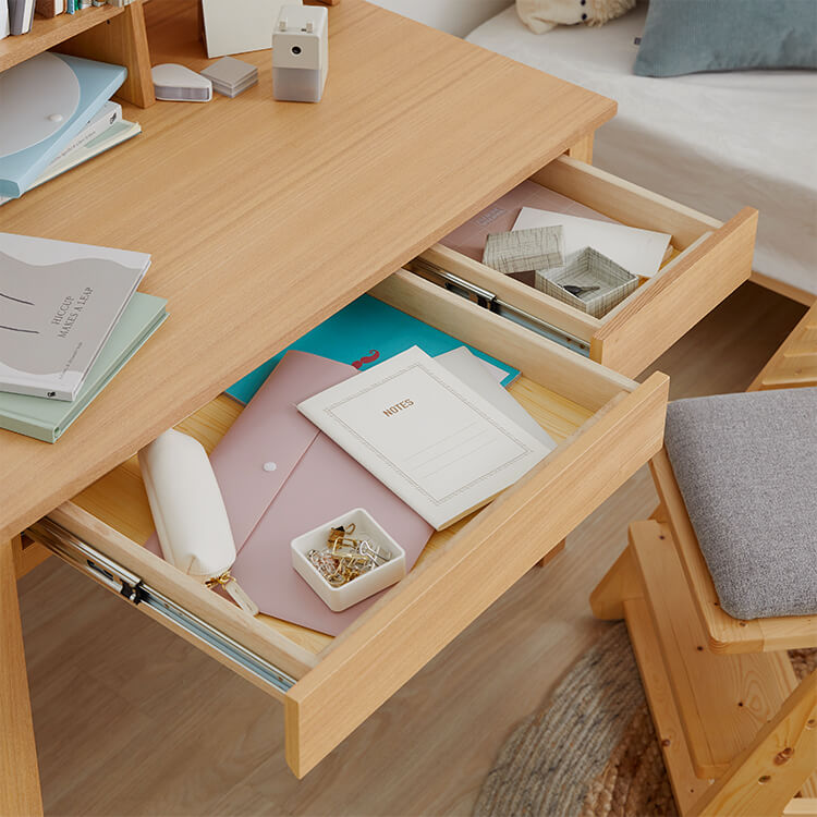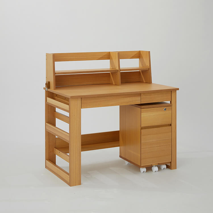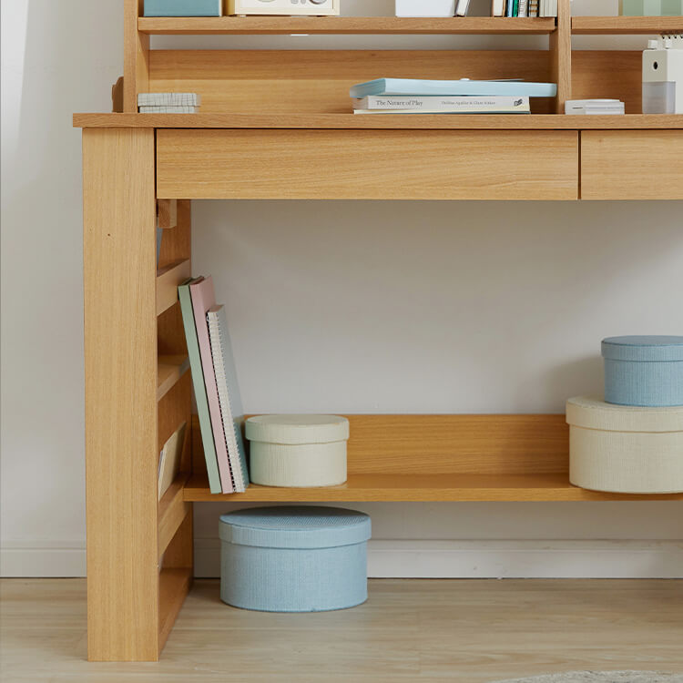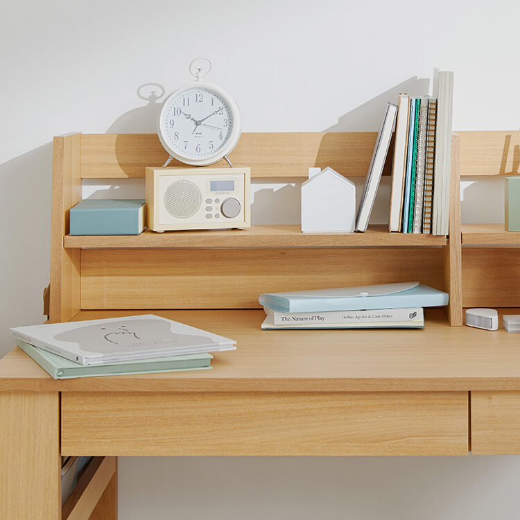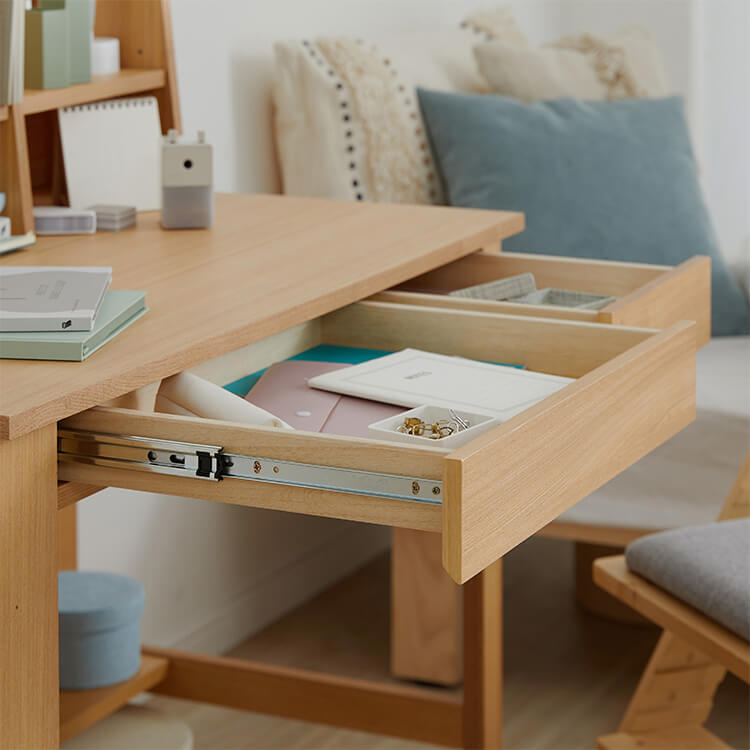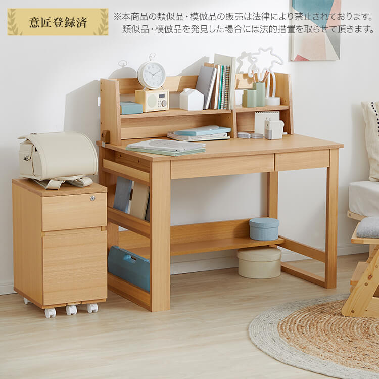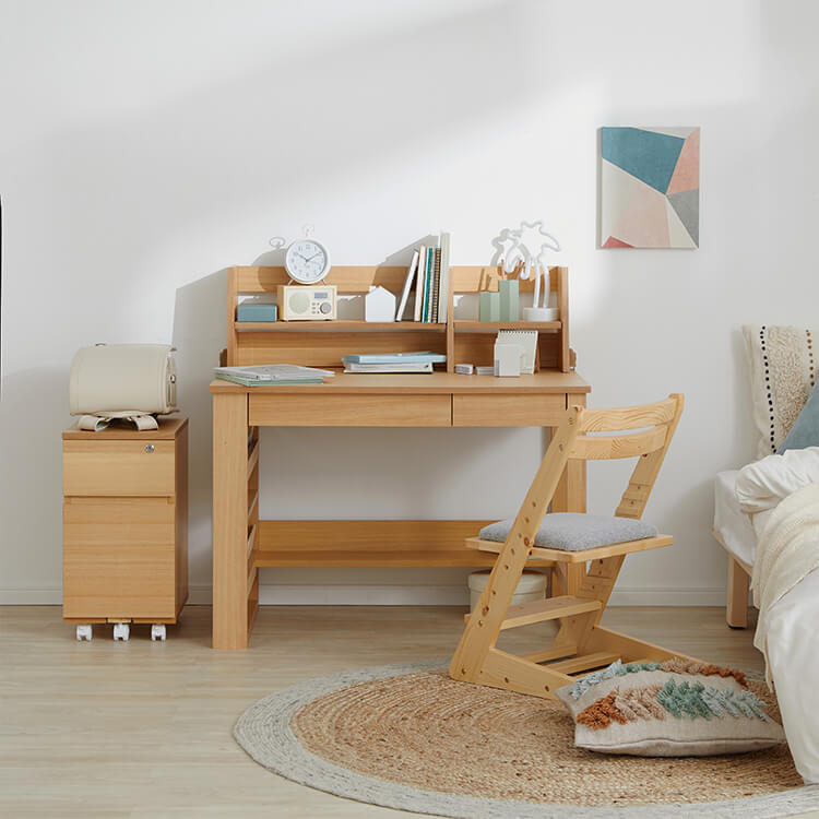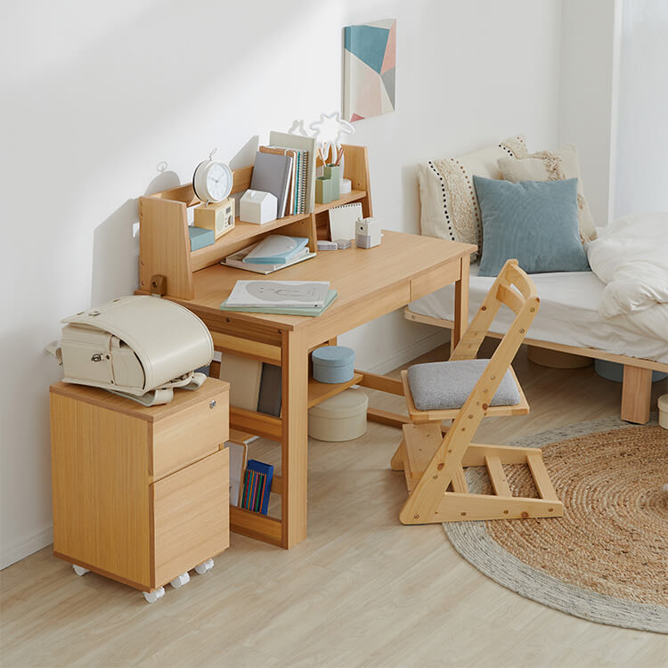 お子さまが毎日使い、その成長する姿を見守ってくれるデスク。だからこそ機能面にも優れ、ずっと大切に使っていけるオシャレな物に決めたいですよね。当社デザイナーが独自のこだわりを持って完成させたオリジナル商品です。カスタム自由でたっぷり収納もできるデスクで、楽しく充実した日々を!天然木を使用したオシャレデザインと、カスタム自由でたっぷりの収納力が自慢。長く使える、デザイン性の高さもポイントです!ラックや引き出しなど、子ども達もお片付けがしやすい豊富な収納スペース!溢れかえる本や小物もしっかり片付けます。