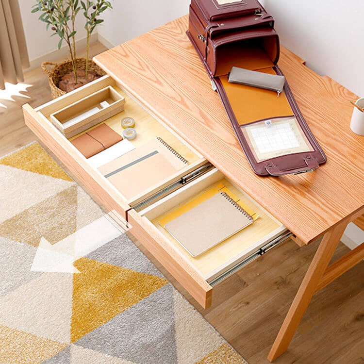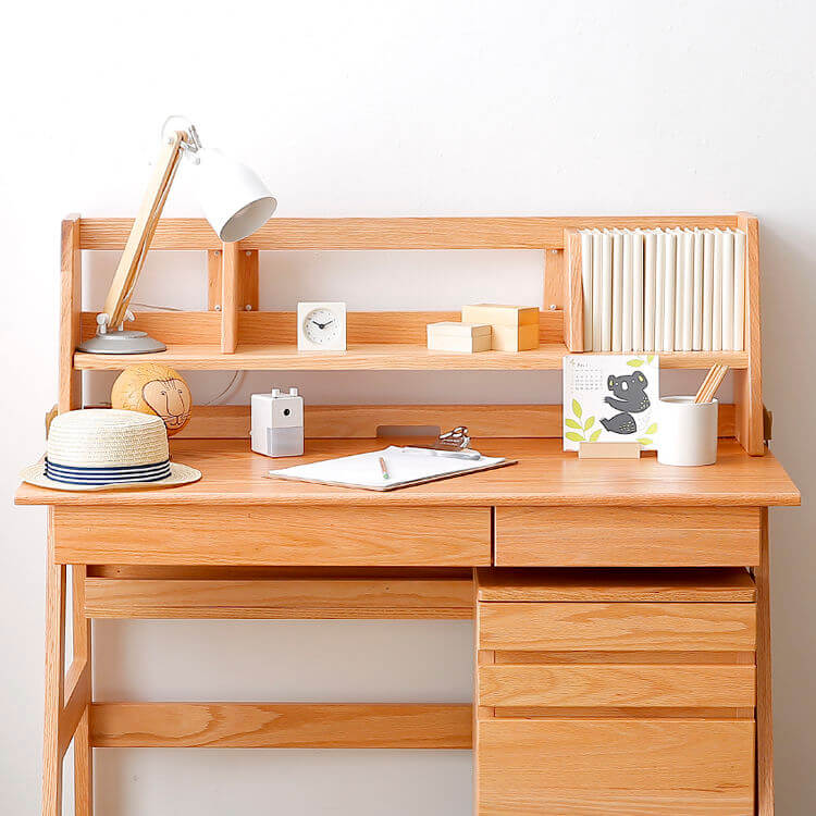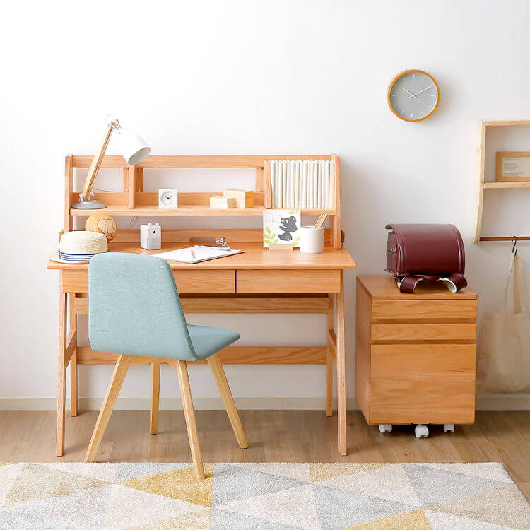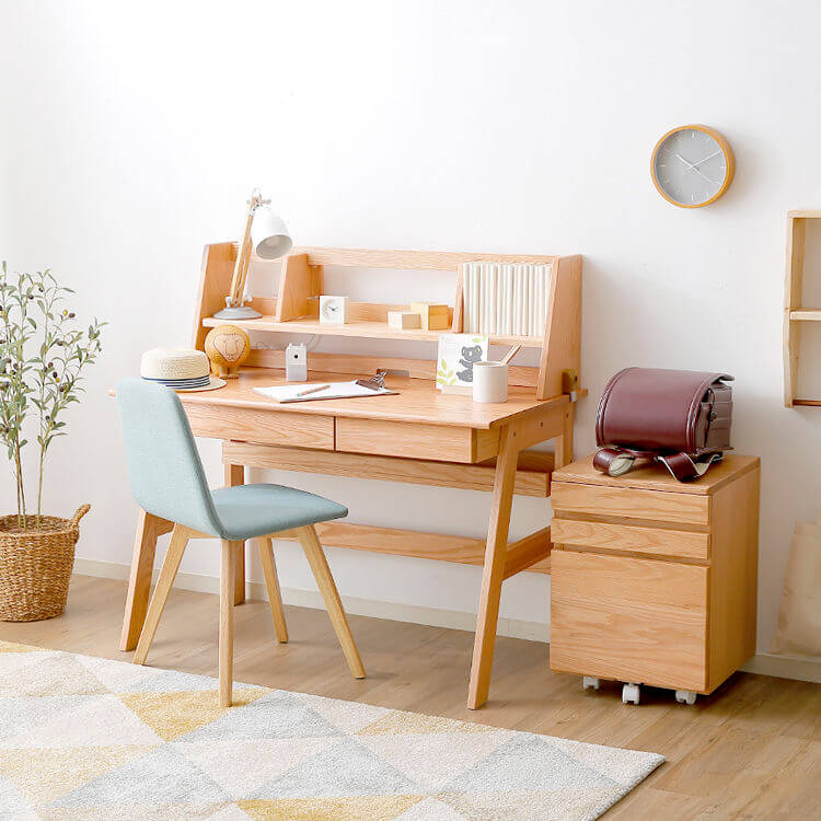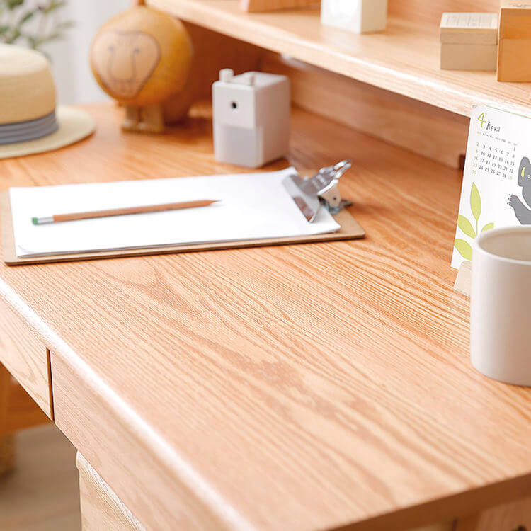 勉強やお絵かき、読書など、お子様が毎日使い、その成長を見守ってくれるデスク。毎日触れるものだからこそ、機能面やデザインにこだわって開発しました。ランドセルから学用品まで、しっかり片付く収納もついていて、便利な学習スタイルを叶えます。(※チェアは付属しておりません)デスクの天板やチェスト、卓上シェルフに贅沢に使用したオークの無垢材。1点、1点異なる木目を楽しめるのは、やはり無垢材ならではの魅力です。お子様の成長とともに深い味わいを刻み、大人になってからでも使えるムードを生み出します。(※ワゴンの側面・背面・底板、机の一部に合成樹脂化粧繊維板を使用しています。)木目を贅沢に味わえるフラットな取っ手の無いデザインを採用しました。引き出しには指をかけやすいように、見えにくい凹みを施しています。取っ手が無いことで、お子様が不意に引っかかってしまったり、ぶつかったりする危険も防ぎます。