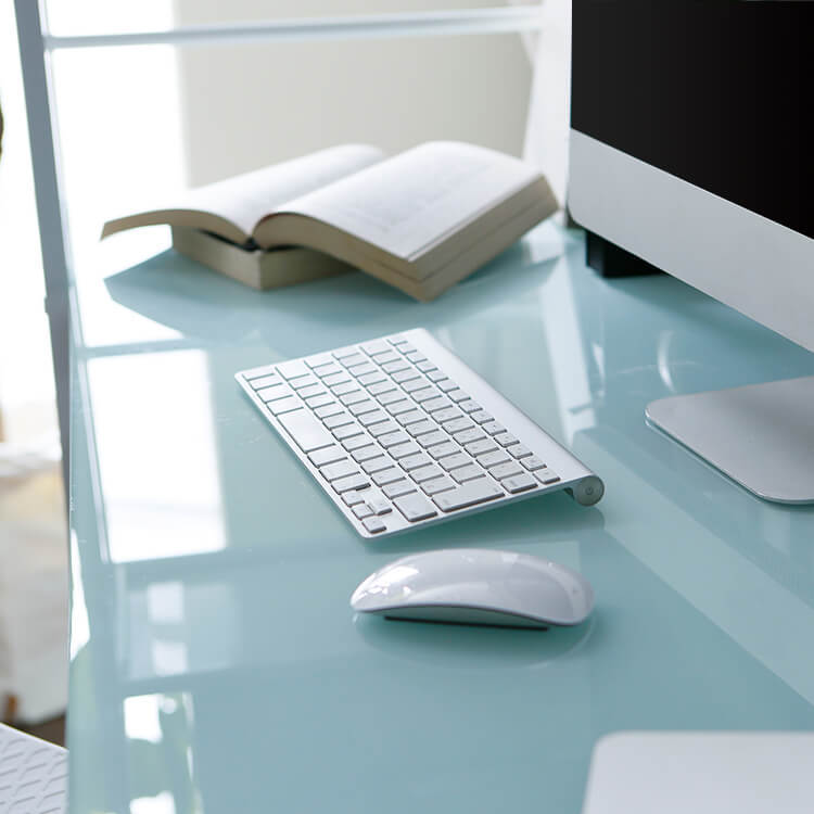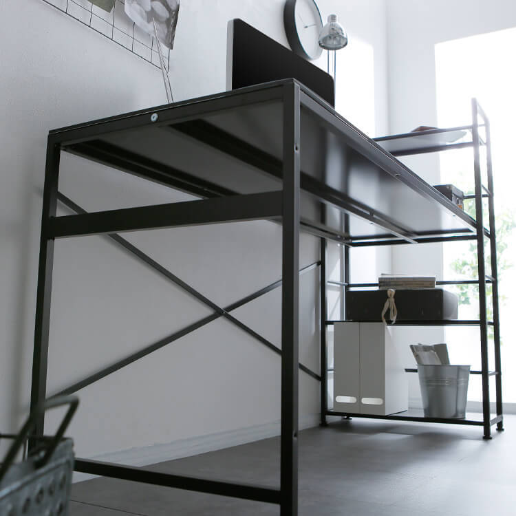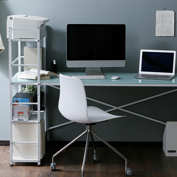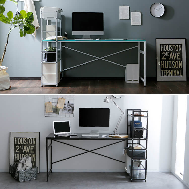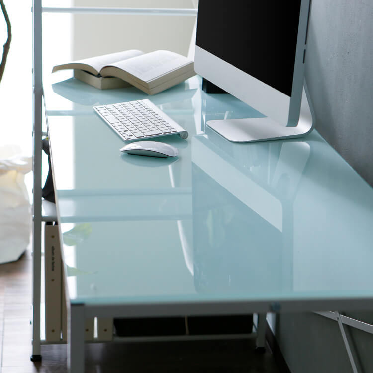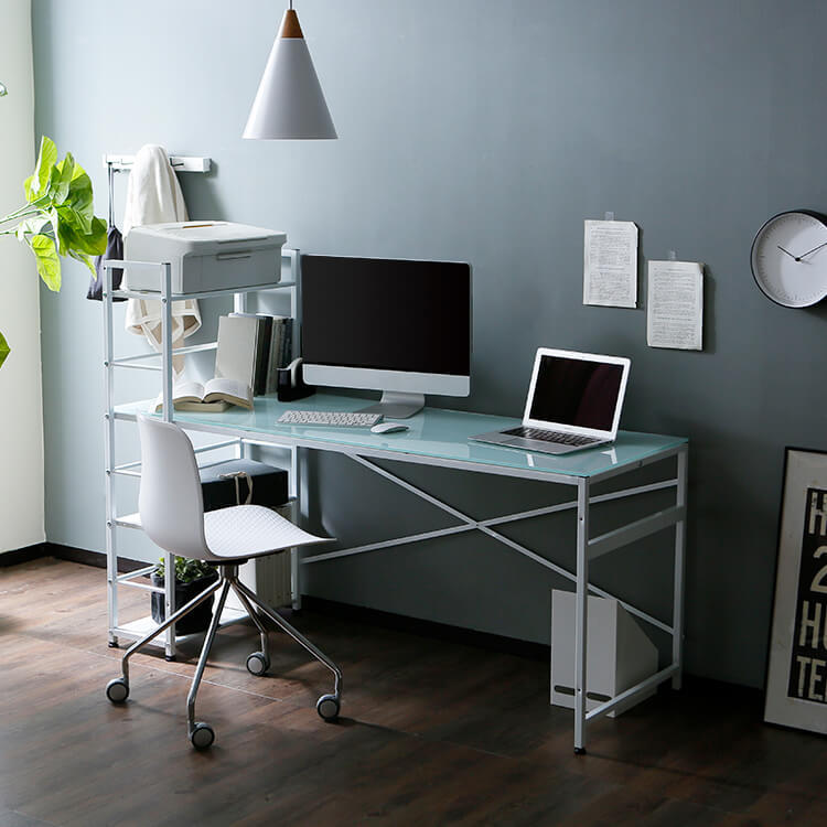 カスタマイズしやすいシンプルなデザインに、充実の収納力であなたのデスク環境を一気にグレードアップ!実用性とデザイン性を兼ね備え、発売以来大人気のデスクに新サイズが登場しました。スグ手の届く場所へ、書類やPC周辺機器もまとめて置ける便利なラック一体型。この一台で、デスク周りをカッコよく一新!使えば使う程、あなたもラック一体型の良さにハマってしまう事でしょう。美しい光を反射するスモークガラスの天板が、デスク上をスタイリッシュに彩ります。足元が透けないこだわりのスモークガラスは、高級感があり、さらに傷や汚れも目立ちにくいこだわりの素材です。デスクトップとノートPCの2台使いも余裕。モニター2台並べても圧迫感なく使える広さで、本格的なデスクワークをする方にもオススメです。