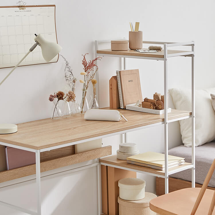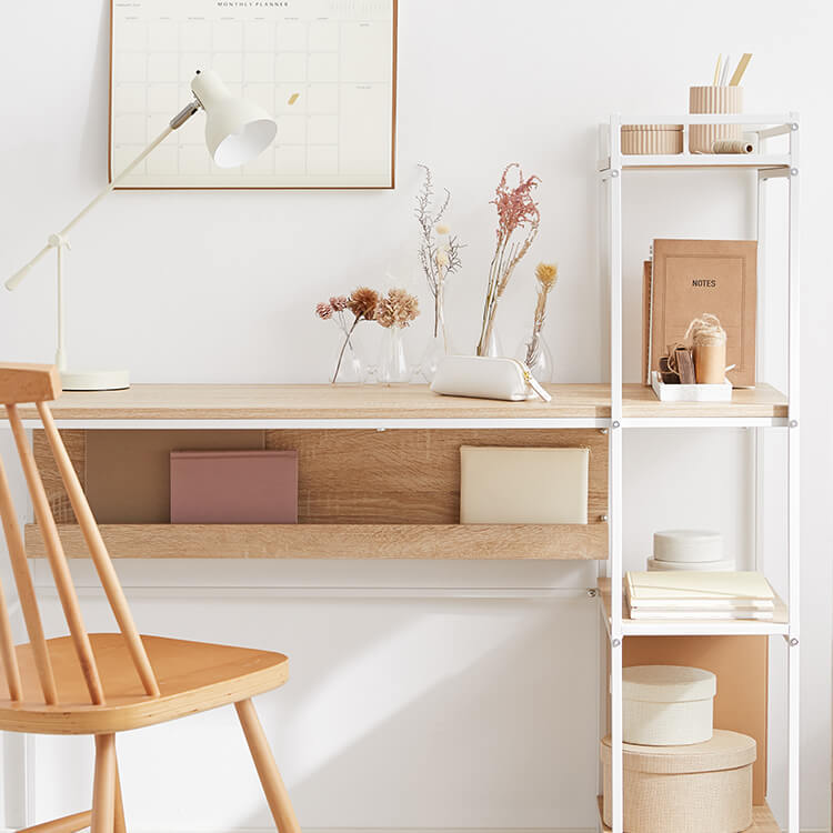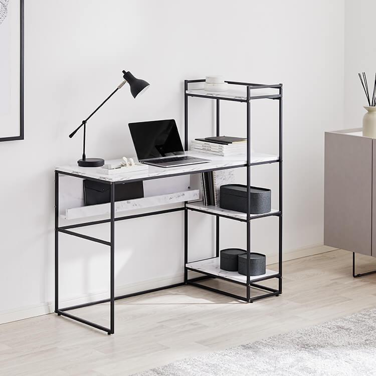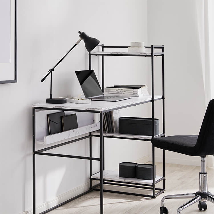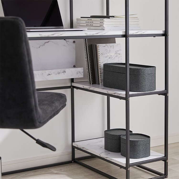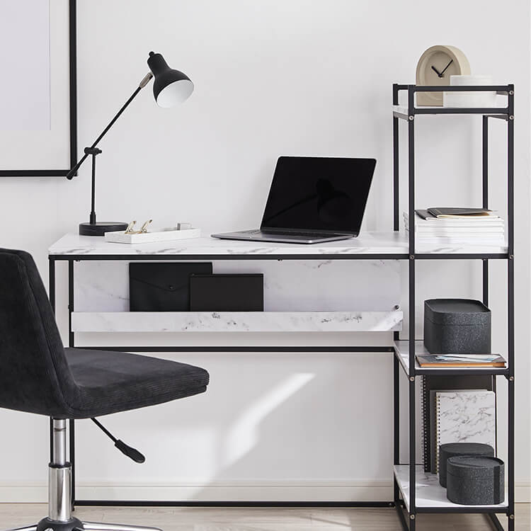 オシャレさも、使いやすさも譲れない。そんなあなたへお届けしたい、スマートなデザインの「一体型デスク」。広々使えるデスクに、小物や本を飾れるラックをプラスしました。お気に入りのモノを飾って、あなた好みのデスクスペースにアレンジしてください。こちらの商品は当社デザイナーが独自のこだわりを持って完成させたオリジナル商品です。どんなお部屋にも合うシンプルなスマートさで、置くだけで画になるデザイン性の高さにとことんこだわりました。細身のスチール脚がアクセントのシンプルでスマートなデザイン。どんなテイストのお部屋にも合わせやすく、すっきりとしたデスク周りを演出します。リアルな質感に仕上げたあたたかみを感じる木目調と、高級感漂い置いた物までお洒落に魅せる大理石柄の天板。お部屋に合わせてお選びください。