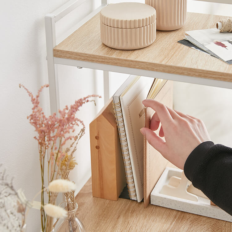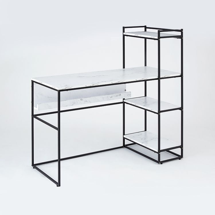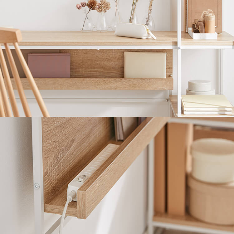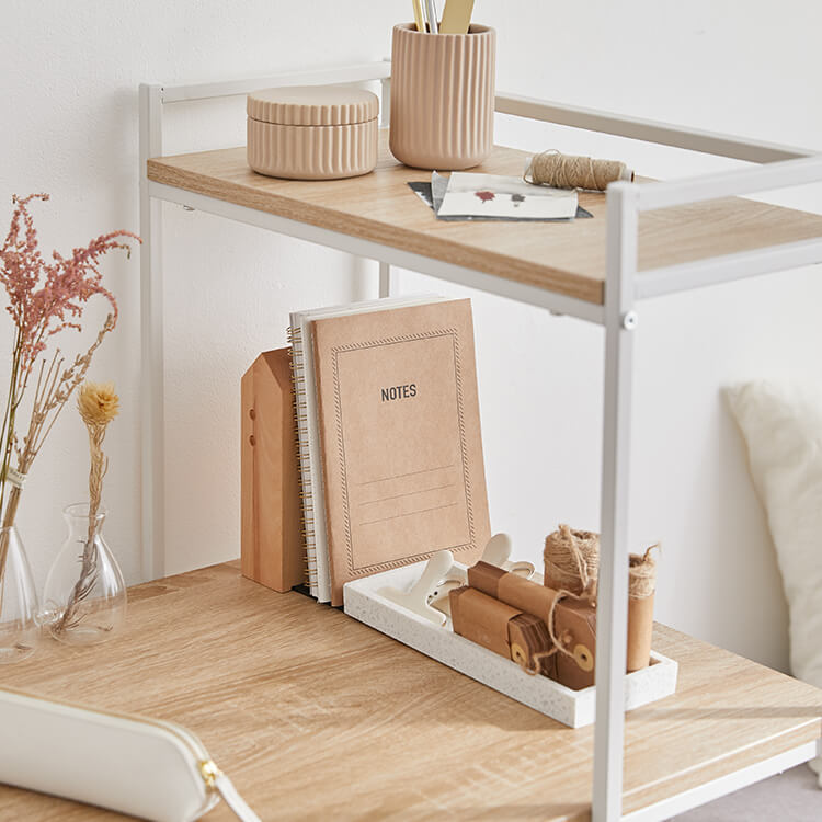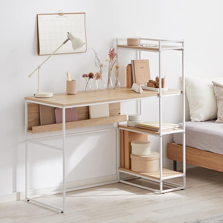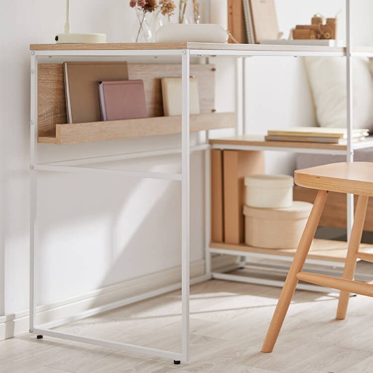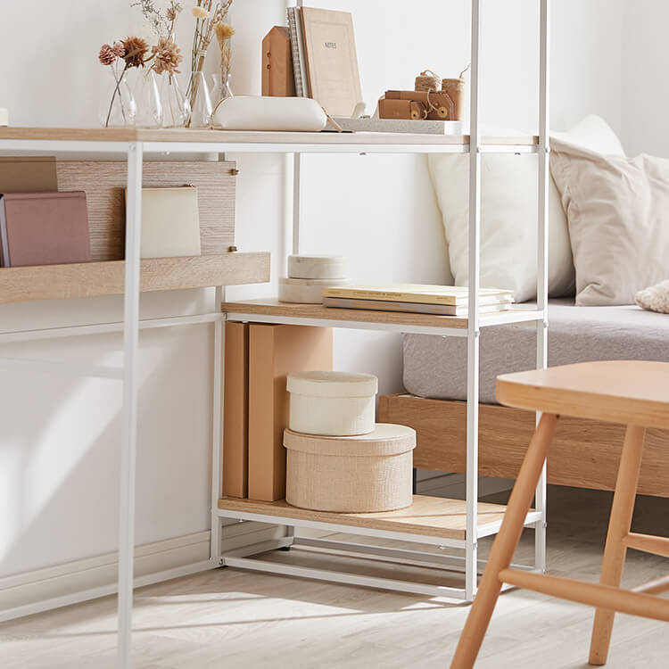 オシャレさも、使いやすさも譲れない。そんなあなたへお届けしたい、スマートなデザインの「一体型デスク」。広々使えるデスクに、小物や本を飾れるラックをプラスしました。お気に入りのモノを飾って、あなた好みのデスクスペースにアレンジしてください。こちらの商品は当社デザイナーが独自のこだわりを持って完成させたオリジナル商品です。どんなお部屋にも合うシンプルなスマートさで、置くだけで画になるデザイン性の高さにとことんこだわりました。細身のスチール脚がアクセントのシンプルでスマートなデザイン。どんなテイストのお部屋にも合わせやすく、すっきりとしたデスク周りを演出します。リアルな質感に仕上げたあたたかみを感じる木目調と、高級感漂い置いた物までお洒落に魅せる大理石柄の天板。お部屋に合わせてお選びください。
