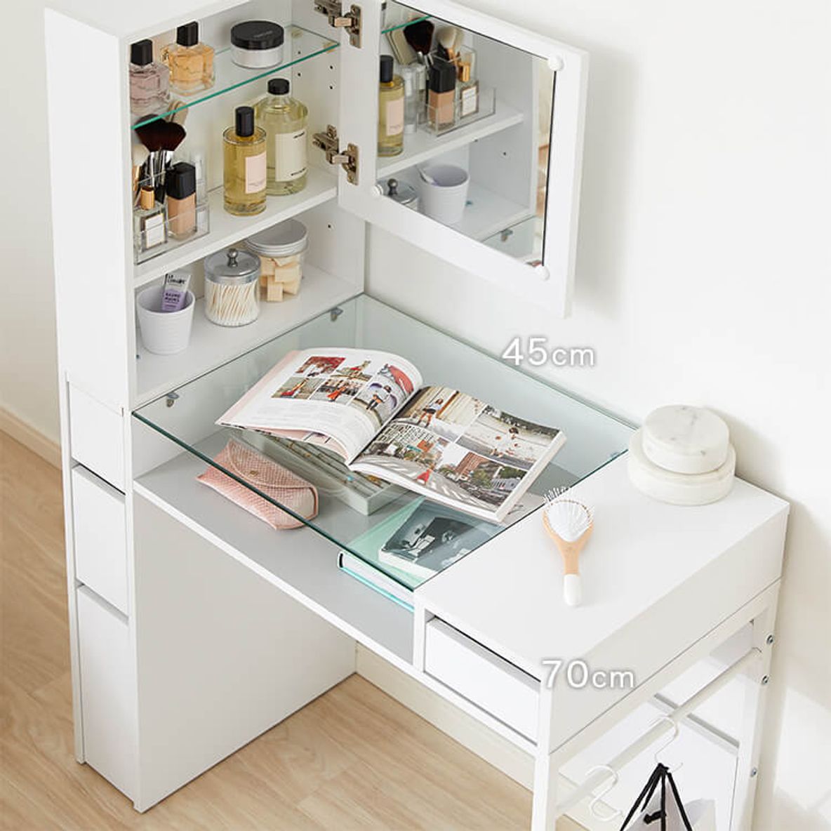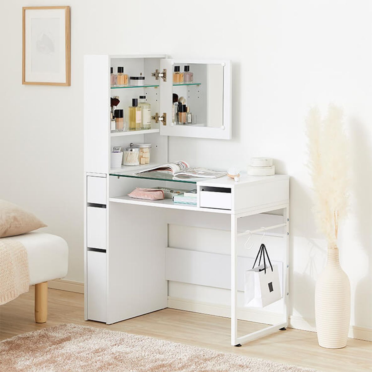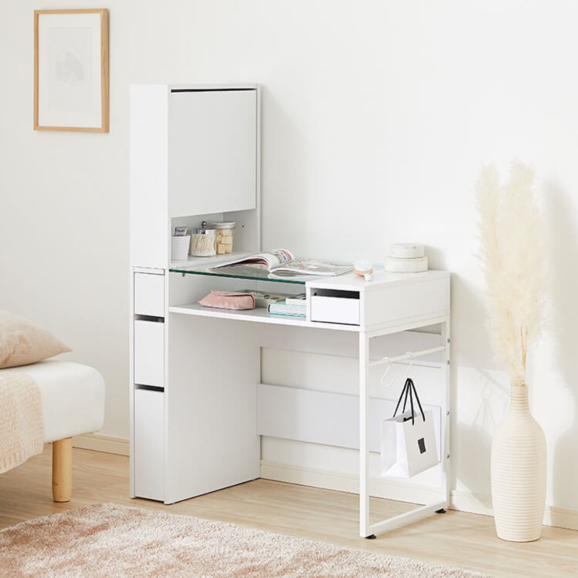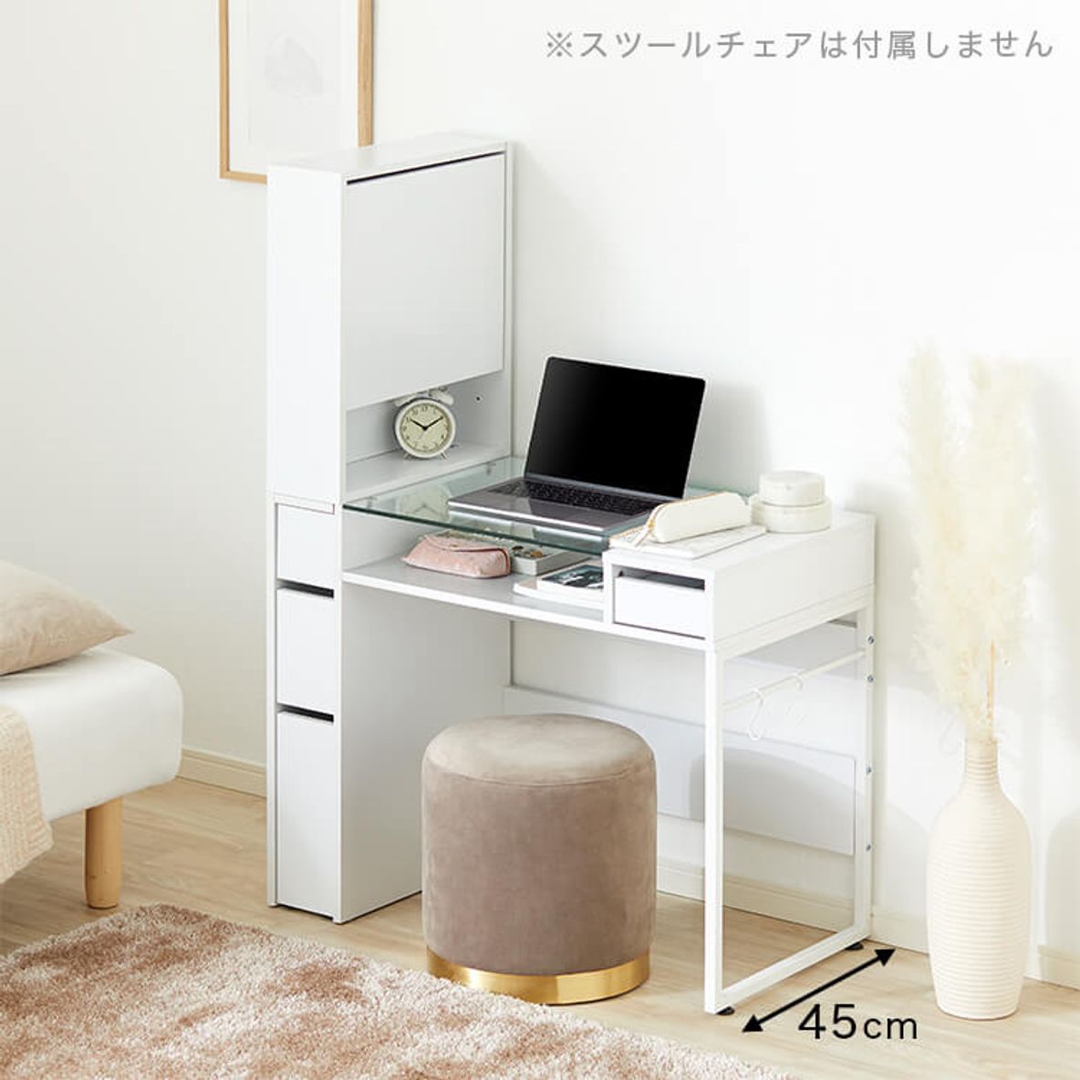 普段は作業スペースとして、扉を開けばメイクアップもできるドレッサー機能付きデスク。一人暮らしのワンルームにも置けるコンパクトさで1台2役の活躍をしてくれます。扉の内側にミラーが付いているので、扉を開くだけでドレッサーに早変わり。小物が多いメイク道具も棚部分に収納すれば、扉を閉じるだけで見た目スッキリです。普段はノートパソコンでの作業や書き物をするワークデスクとして活躍します。全体奥行が45cmとスリムなので、ワンルームなどスペースの限られたお部屋にも置けるサイズ感です。デスク上の収納は、扉付きの収納とオープンスペースの上下2つに分かれています。上段は扉で隠す収納として、下段はすぐ手に取りたい時計や鍵など、普段よく使うものの置き場所としてお使いいただけます。