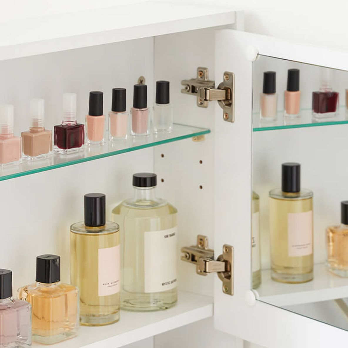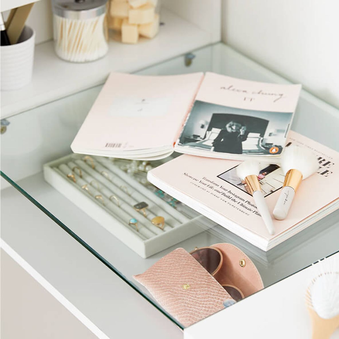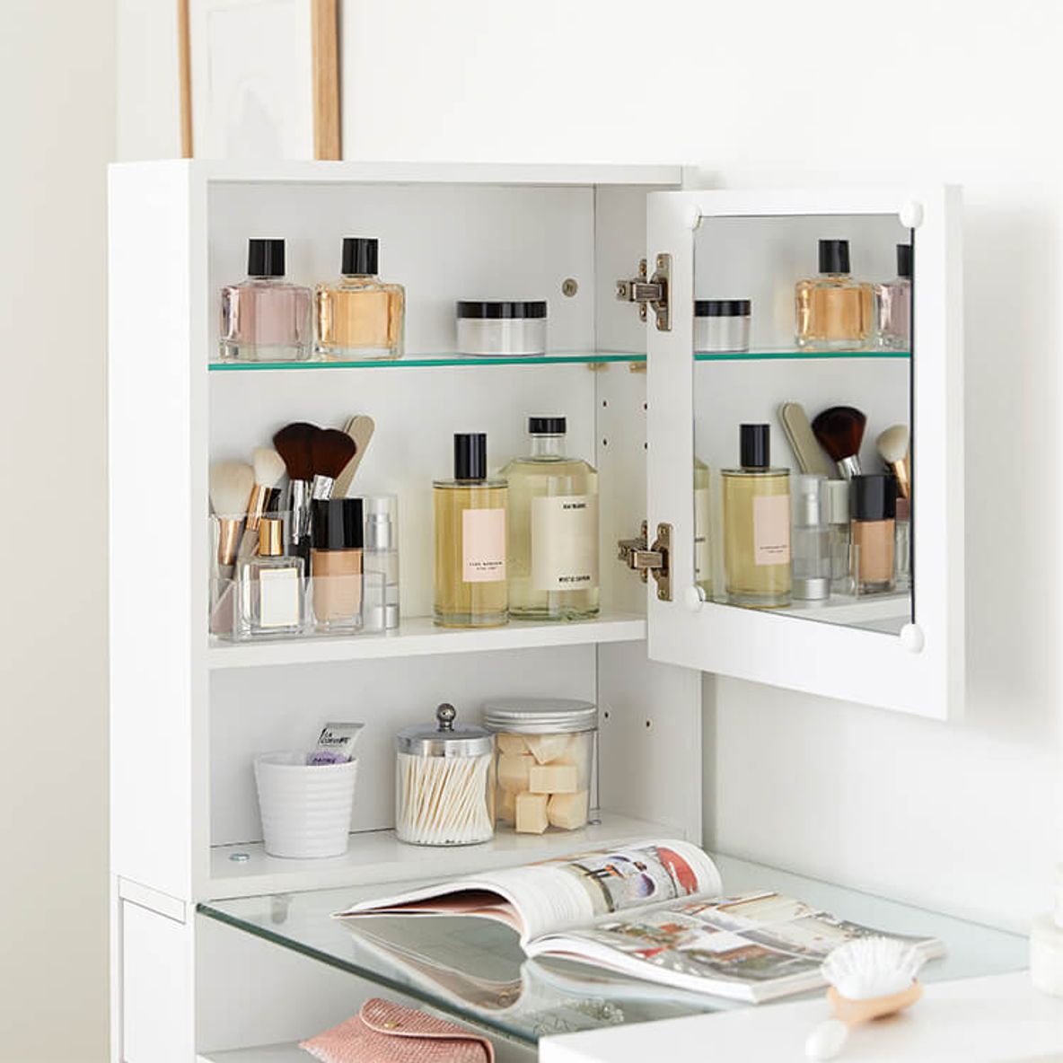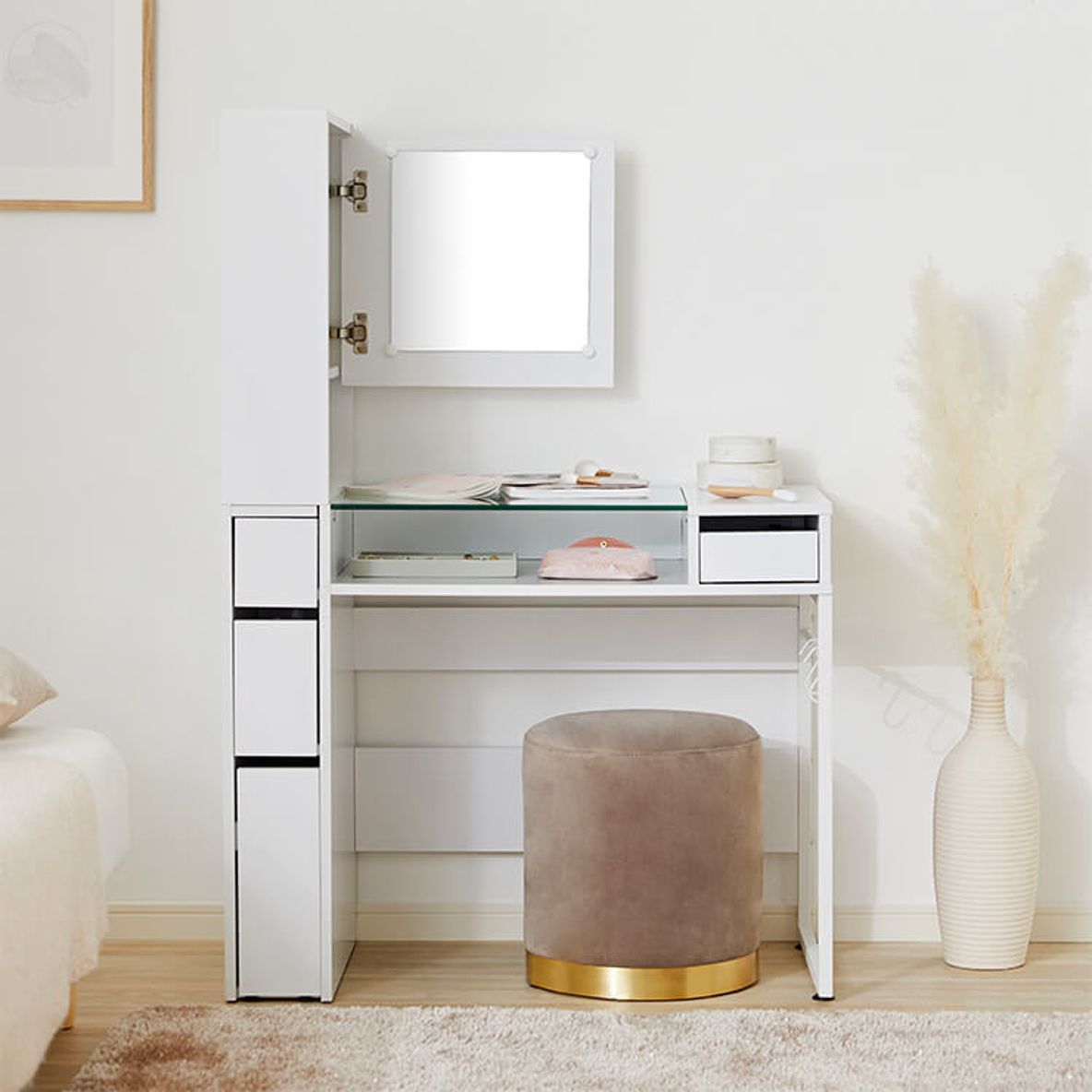 普段は作業スペースとして、扉を開けばメイクアップもできるドレッサー機能付きデスク。一人暮らしのワンルームにも置けるコンパクトさで1台2役の活躍をしてくれます。扉の内側にミラーが付いているので、扉を開くだけでドレッサーに早変わり。小物が多いメイク道具も棚部分に収納すれば、扉を閉じるだけで見た目スッキリです。普段はノートパソコンでの作業や書き物をするワークデスクとして活躍します。全体奥行が45cmとスリムなので、ワンルームなどスペースの限られたお部屋にも置けるサイズ感です。デスク上の収納は、扉付きの収納とオープンスペースの上下2つに分かれています。上段は扉で隠す収納として、下段はすぐ手に取りたい時計や鍵など、普段よく使うものの置き場所としてお使いいただけます。