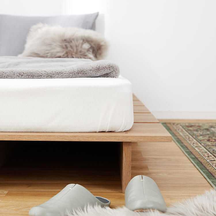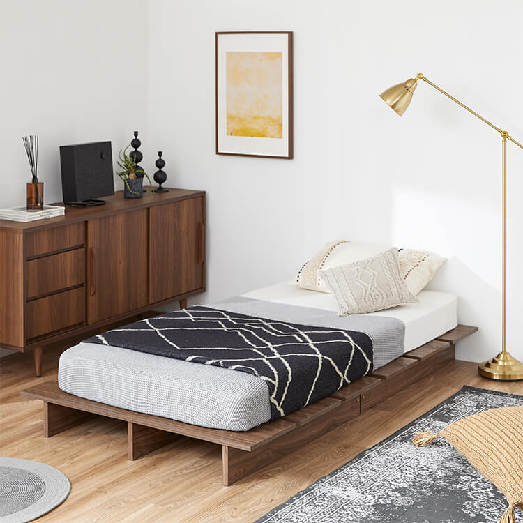 「もっと気軽に北欧テイストを」そんな思いから生まれた、あたたかみあふれるベッドフレーム。 優しい木目調が、お部屋を心安らぐナチュラルムードに染め上げます。シンプルで飽きの来ないデザインは、北欧のモノづくりの心から学び、生まれたもの。 冬の長い間をおうちで過ごす北欧では、毎日使う家具に飽きが来ないよう、無駄のないシンプルな家具を生み出しました。機能的で美しい北欧テイストのデザインは、置く部屋のテイストを選ばず自然と溶け込んでくれます。このベッドフレームは上に乗せるタイプなので、はめ込みタイプよりも気軽にマットレスを選んでいただけます。