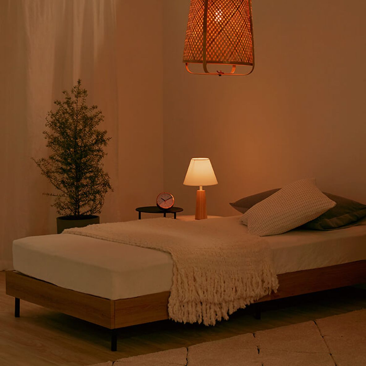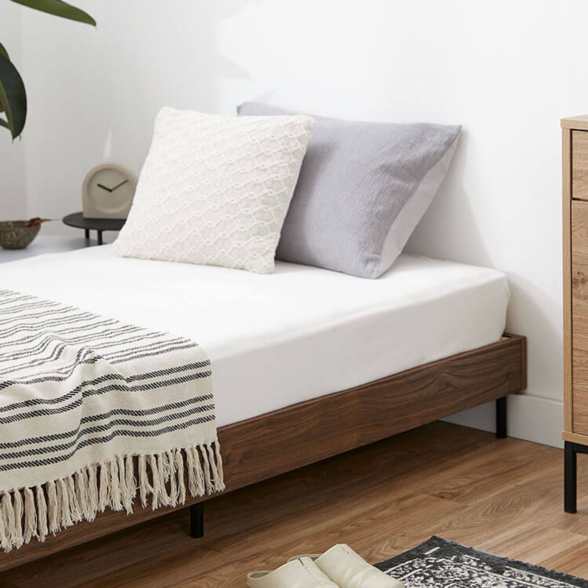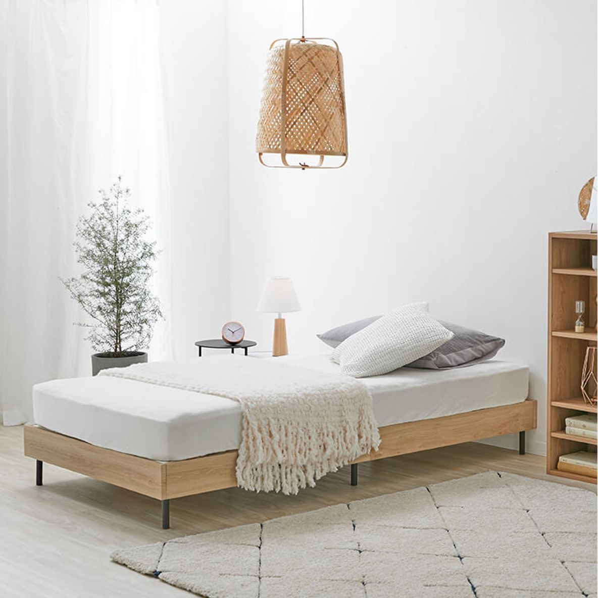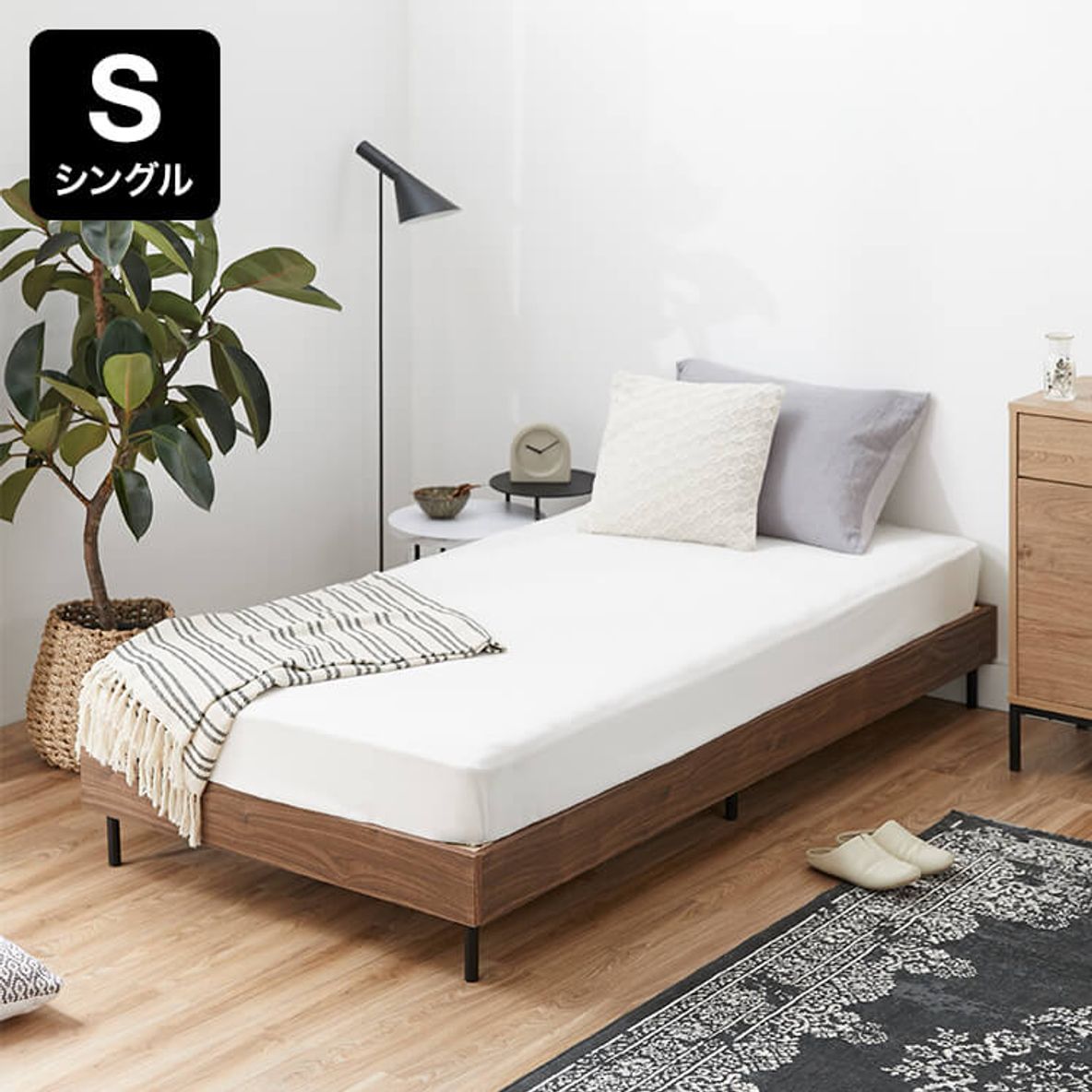 解放感のある「ロースタイル×ヘッドレス」のスマートなデザインが魅力。 ナチュラルになじむ木目柄とシンプルなスチールの素材を使用したベッドフレーム[シングルサイズ]です。「異素材MIX」「ヘッドレスデザイン」「ロースタイル」の3つのポイントが、自由度の高い、おしゃれな寝室空間をつくりだします。お部屋のスタイルを選ばない「木目柄×スチール」の組み合わせ。異素材が生み出す落ち着いたムードが、さらにスタイリッシュで居心地の良いお部屋にしてくれます。まるで本物の天然木のようなリアルな木目柄が、お部屋にあたたかみをプラス。ヴィンテージ感漂う当社こだわりのオリジナルカラー「シャビーナチュラル」と、重厚感ある「ウォルナット」からお選びいただけます。