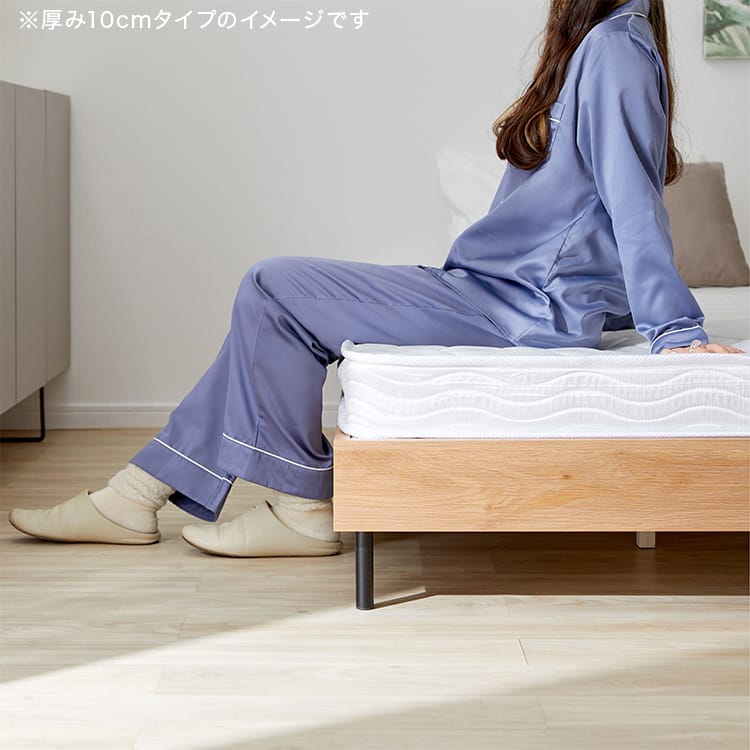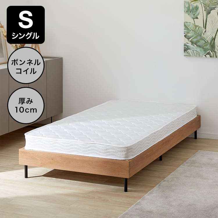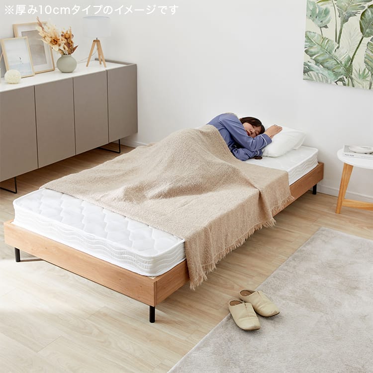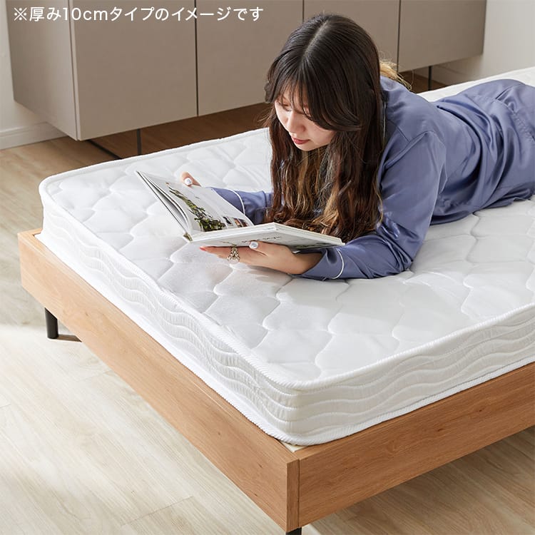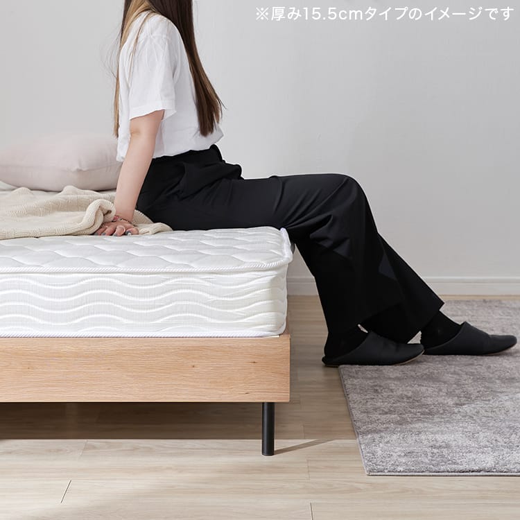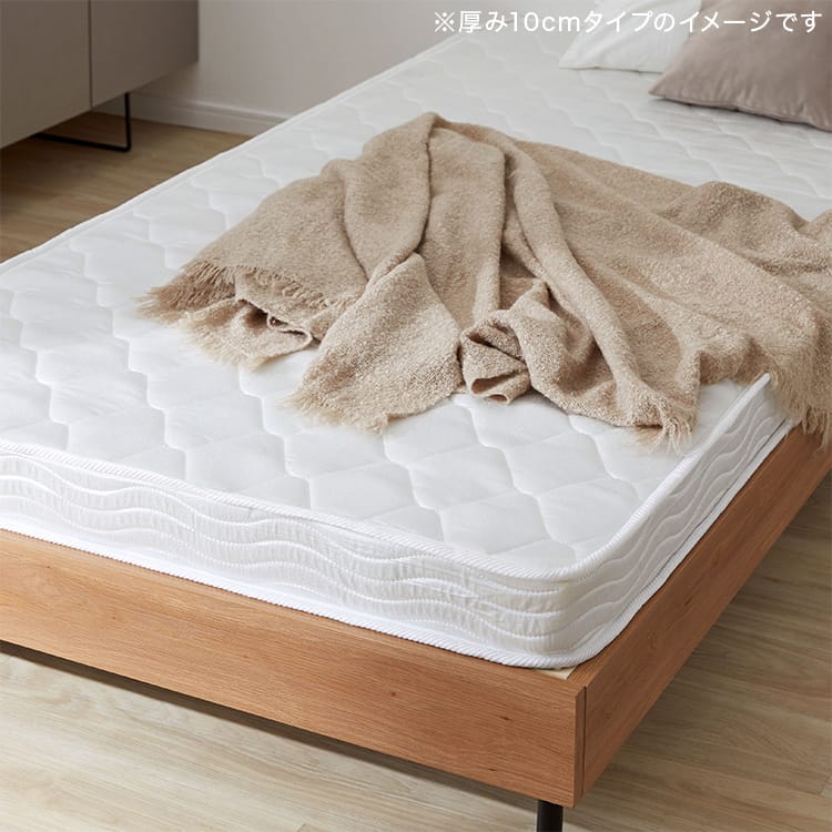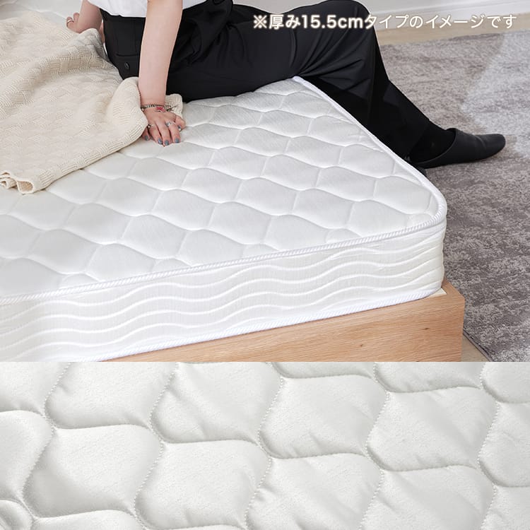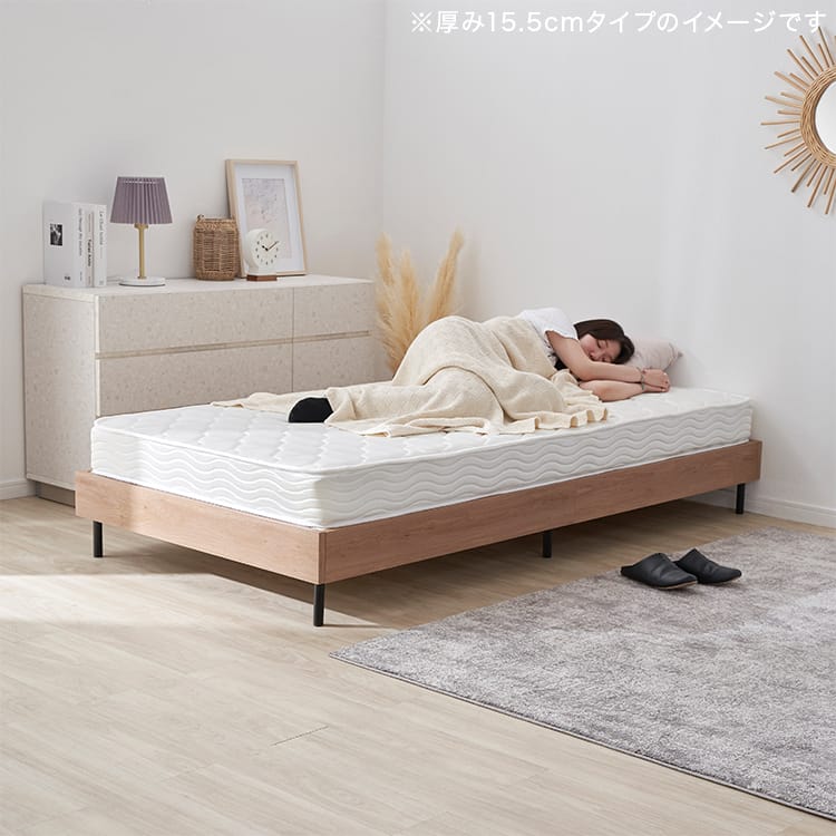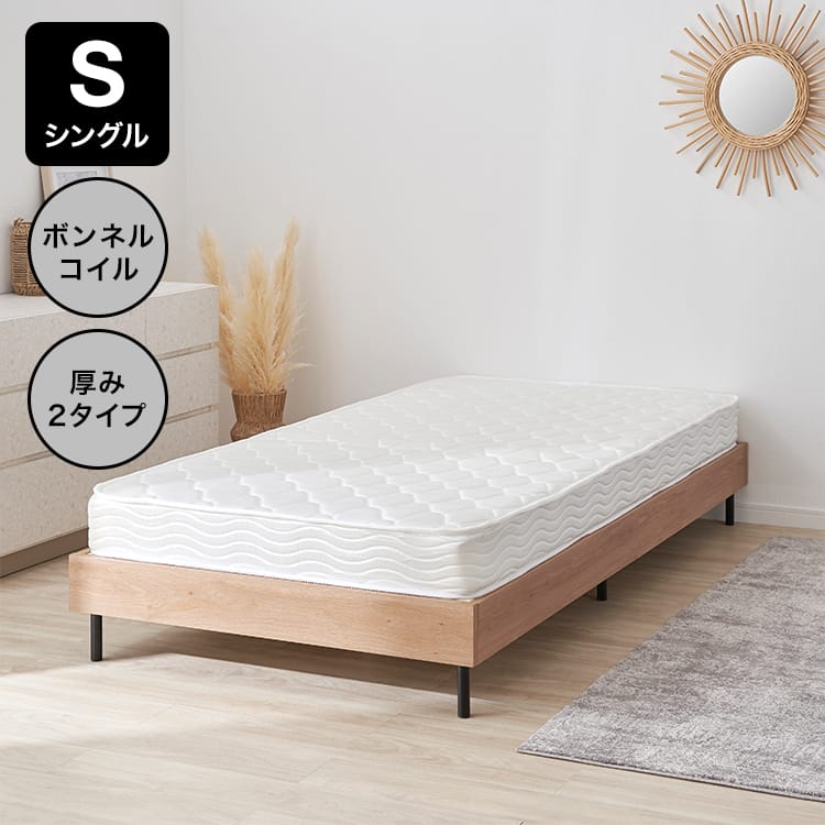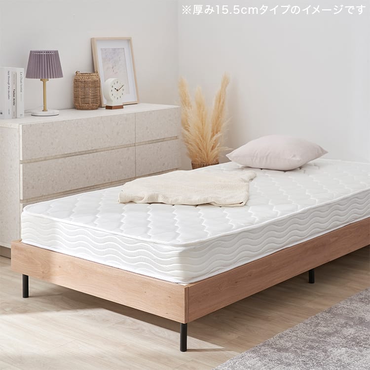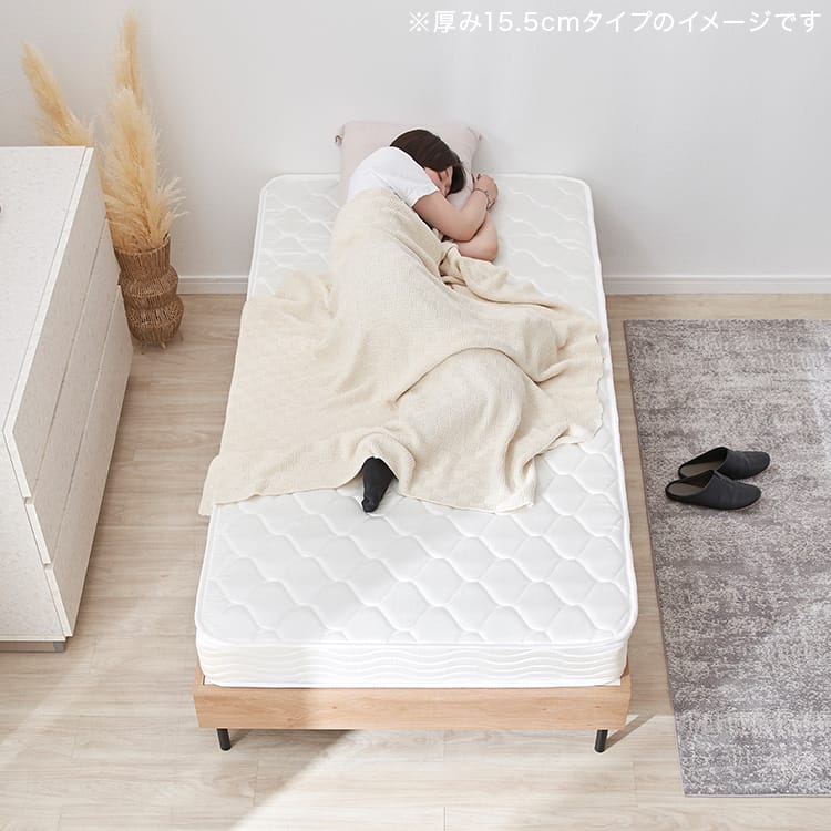 爽やかな目覚めのためには、快適な睡眠スタイルが大切。ボンネルコイルを使用したベースをキルティング生地で包んだ、癒しの弾力が魅力のマットレスです。厚みが15.5cmと10cmの2タイプからお選びいただけます!これから新生活を始める方や、一人暮らしをされる方、初めてベッドをお使いの方にピッタリの、基本をおさえたマットレス。適度な硬さがあるので、やわらかすぎる寝心地が苦手な方にもオススメです。ベッドフレームはもちろん直置きでも使える厚み15.5cm、ロフトベッドで使いやすい厚み10cm。両タイプとも、しっかりとした弾力のボンネルコイルを使用する事で、底付き感の無い寝心地を実現しました。ロール状に小さく梱包することで、搬入しやすくなり、専用ケースに入れてのお届けなので段ボールの処理が不要です。また、生産後すぐに圧縮されるため、お届けまで汚れや雑菌が付きにくく、衛生面も◎