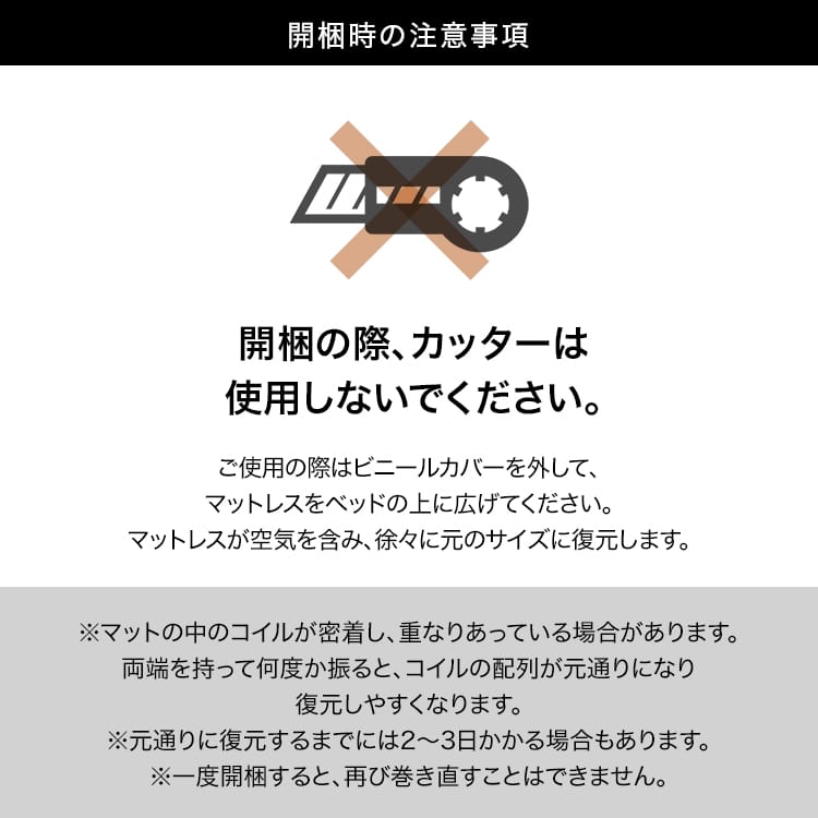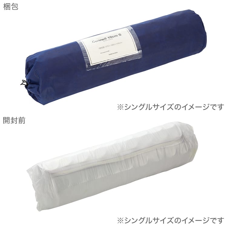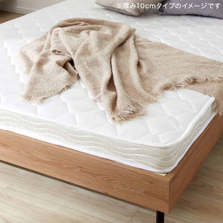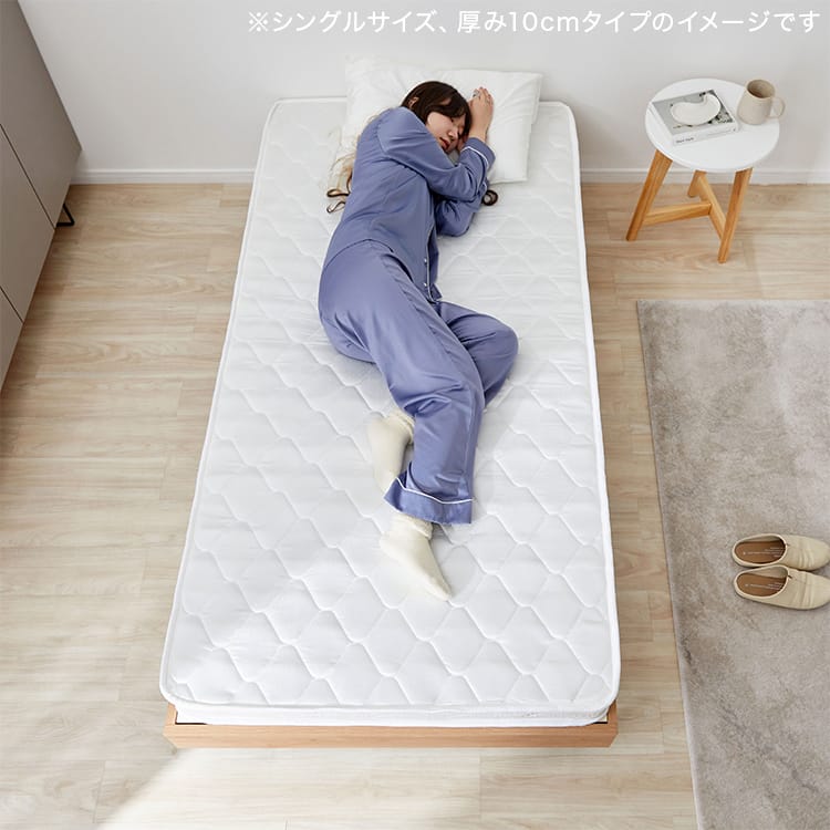 爽やかな目覚めのためには、快適な睡眠スタイルが大切。ボンネルコイルを使用したベースをキルティング生地で包んだ、癒しの弾力が魅力のマットレスです。厚みが15.5cmと10cmの2タイプからお選びいただけます!これから新生活を始める方や、一人暮らしをされる方、初めてベッドをお使いの方にピッタリの、基本をおさえたマットレス。適度な硬さがあるので、やわらかすぎる寝心地が苦手な方にもオススメです。ベッドフレームはもちろん直置きでも使える厚み15.5cm、ロフトベッドで使いやすい厚み10cm。両タイプとも、しっかりとした弾力のボンネルコイルを使用する事で、底付き感の無い寝心地を実現しました。ロール状に小さく梱包することで、搬入しやすくなり、専用ケースに入れてのお届けなので段ボールの処理が不要です。また、生産後すぐに圧縮されるため、お届けまで汚れや雑菌が付きにくく、衛生面も◎
