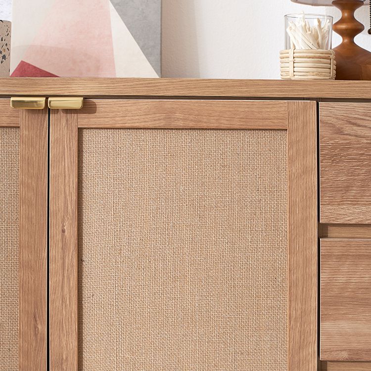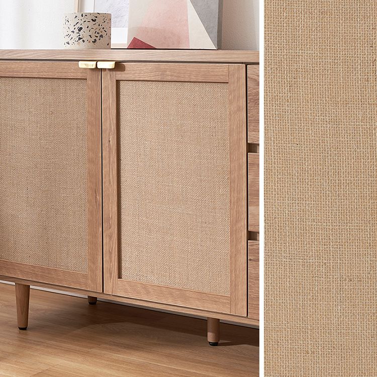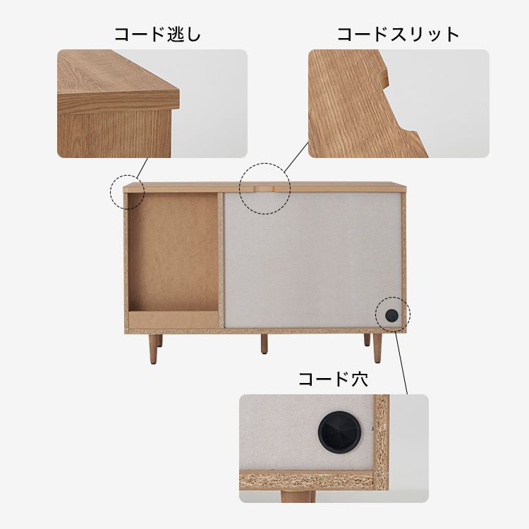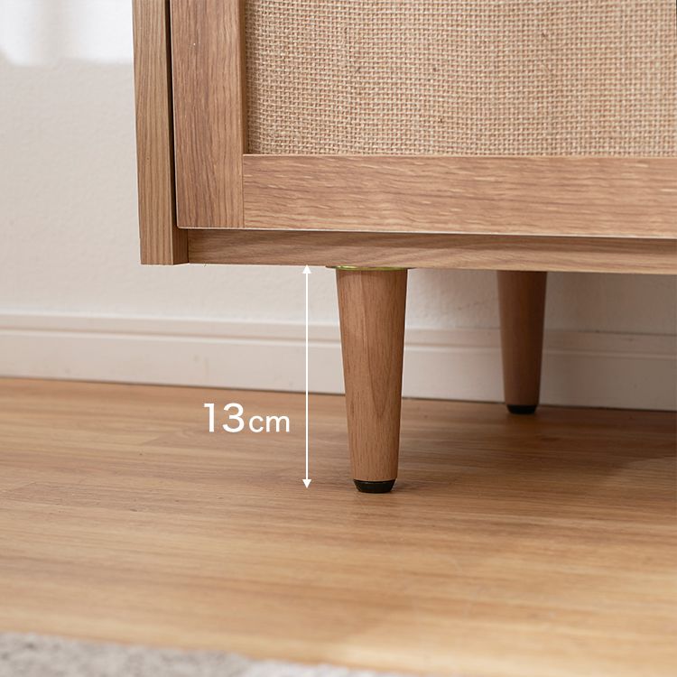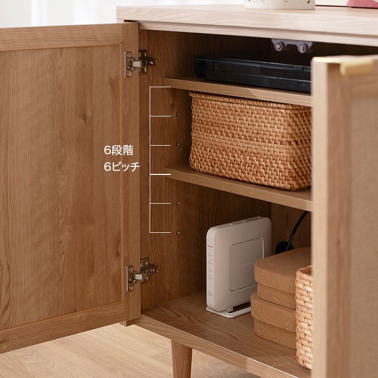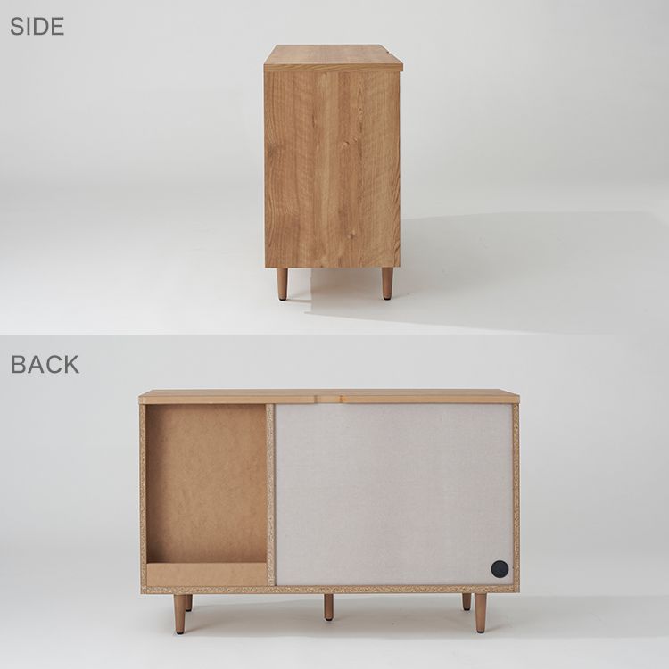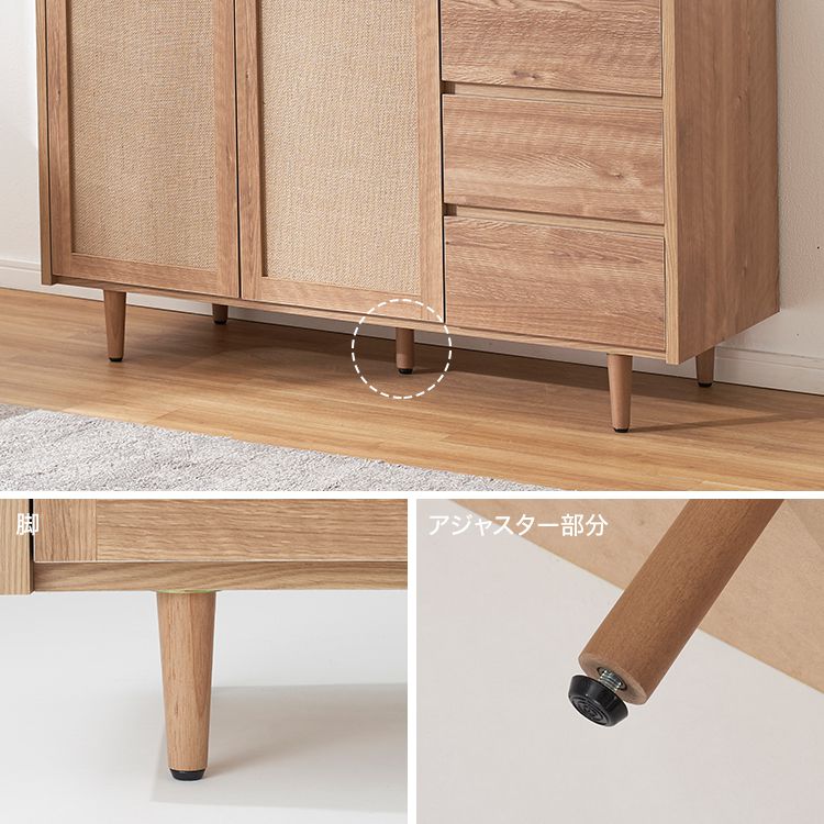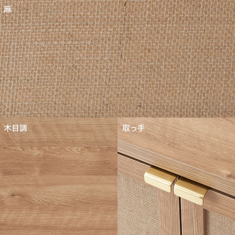 あたたかみのある木目調に天然素材の麻を組み合わせた、日本製サイドボード。異素材が織りなすナチュラルな風合いが、海外リゾートのような快適で居心地のいい空間を演出します。あたたかみのある木目調×サラッと爽やかな質感の麻×ゴールドの組み合わせ。ナチュラルな風合いと高級感を程よく組み合わせたデザインです。開き扉の前板には、麻(リネン)100%生地を施しました。明るく軽やかな見た目がデザイン全体のアクセントに。