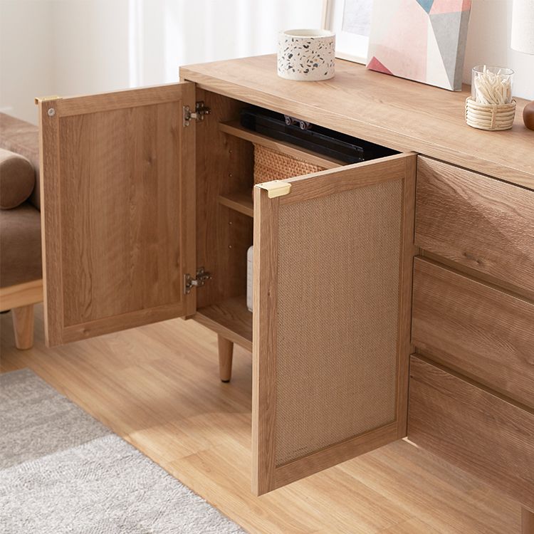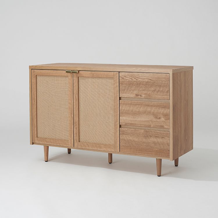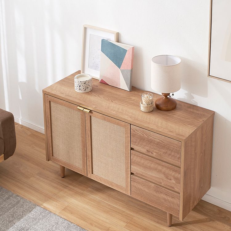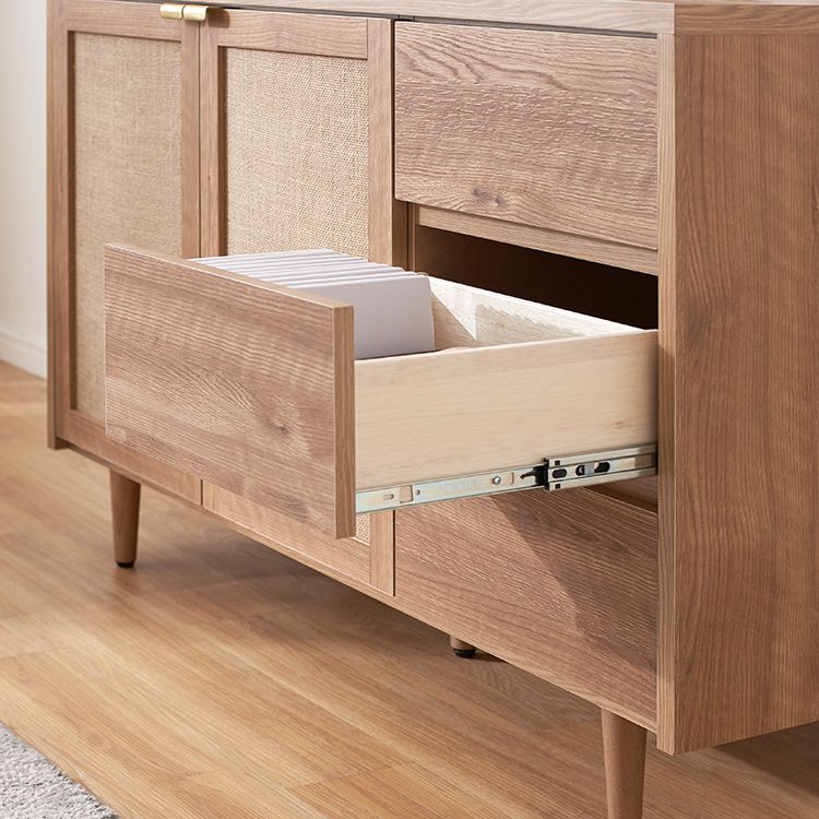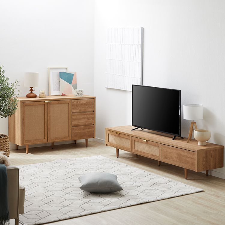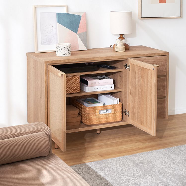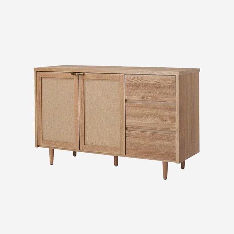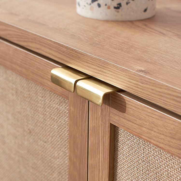 あたたかみのある木目調に天然素材の麻を組み合わせた、日本製サイドボード。異素材が織りなすナチュラルな風合いが、海外リゾートのような快適で居心地のいい空間を演出します。あたたかみのある木目調×サラッと爽やかな質感の麻×ゴールドの組み合わせ。ナチュラルな風合いと高級感を程よく組み合わせたデザインです。開き扉の前板には、麻(リネン)100%生地を施しました。明るく軽やかな見た目がデザイン全体のアクセントに。