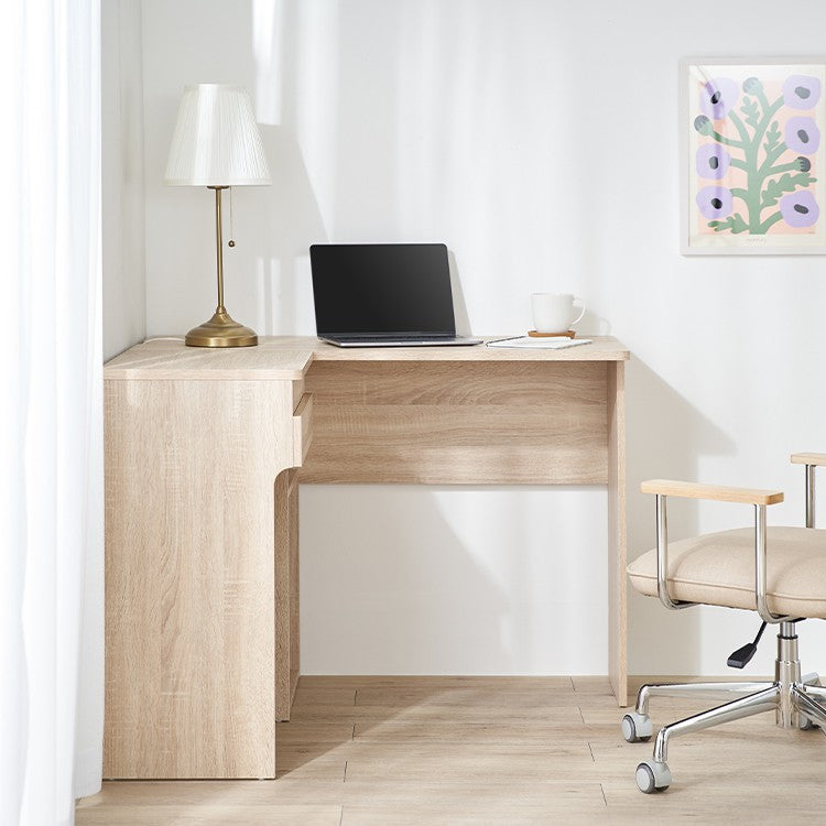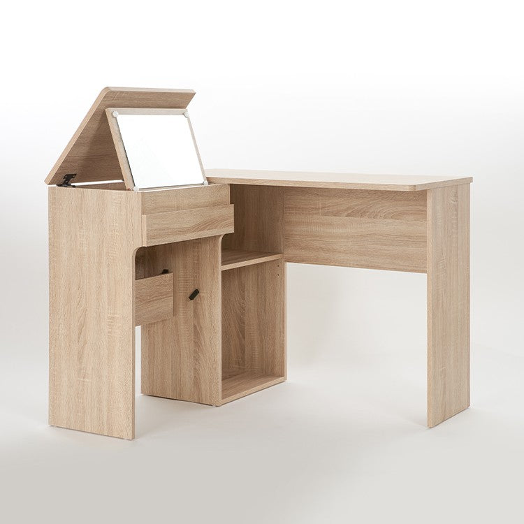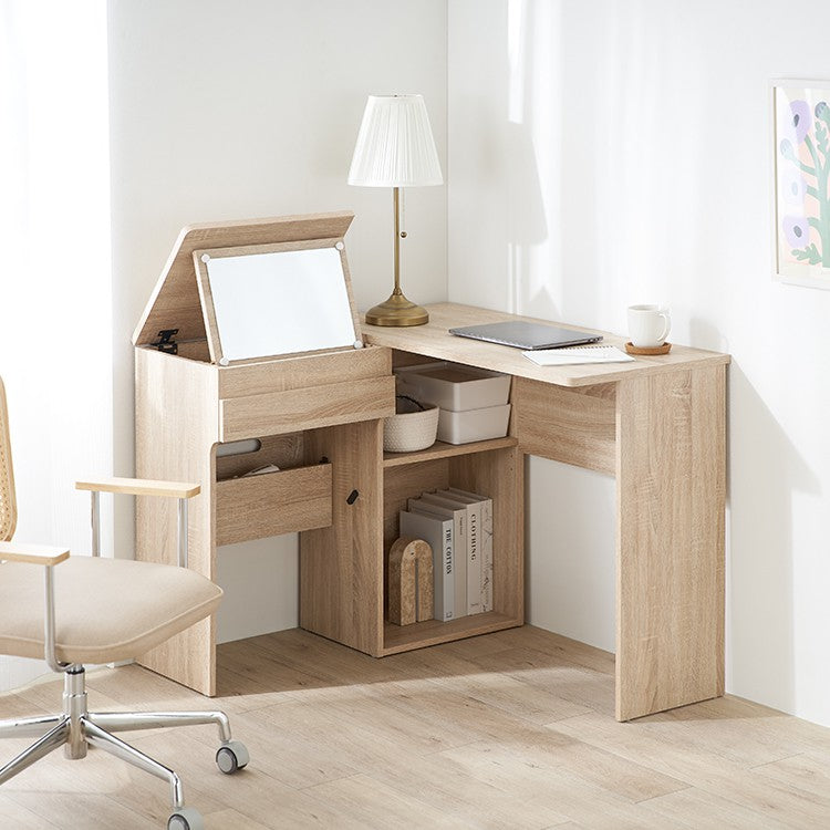 ドレッサーとデスクが一緒になった新しいカタチ。ドレッサー機能付きL字型デスクです。「狭いお部屋にドレッサーとデスクの両方を置くのは難しい……」という方にオススメ!デスクとドレッサーの2way使いが叶う!普段は作業スペースとして。お出かけ時にはドレッサーとして。一人暮らしにも置けるサイズ感で、1台2役の活躍です♪こちらの商品は当社デザイナーが独自のこだわりを持って完成させたオリジナル商品です。天板の内側にミラーが付いているので、天板を開くだけでドレッサーに早変わり。デスク作業が終わったら、サッとミラーを開いてメイクができるので時間短縮に!
