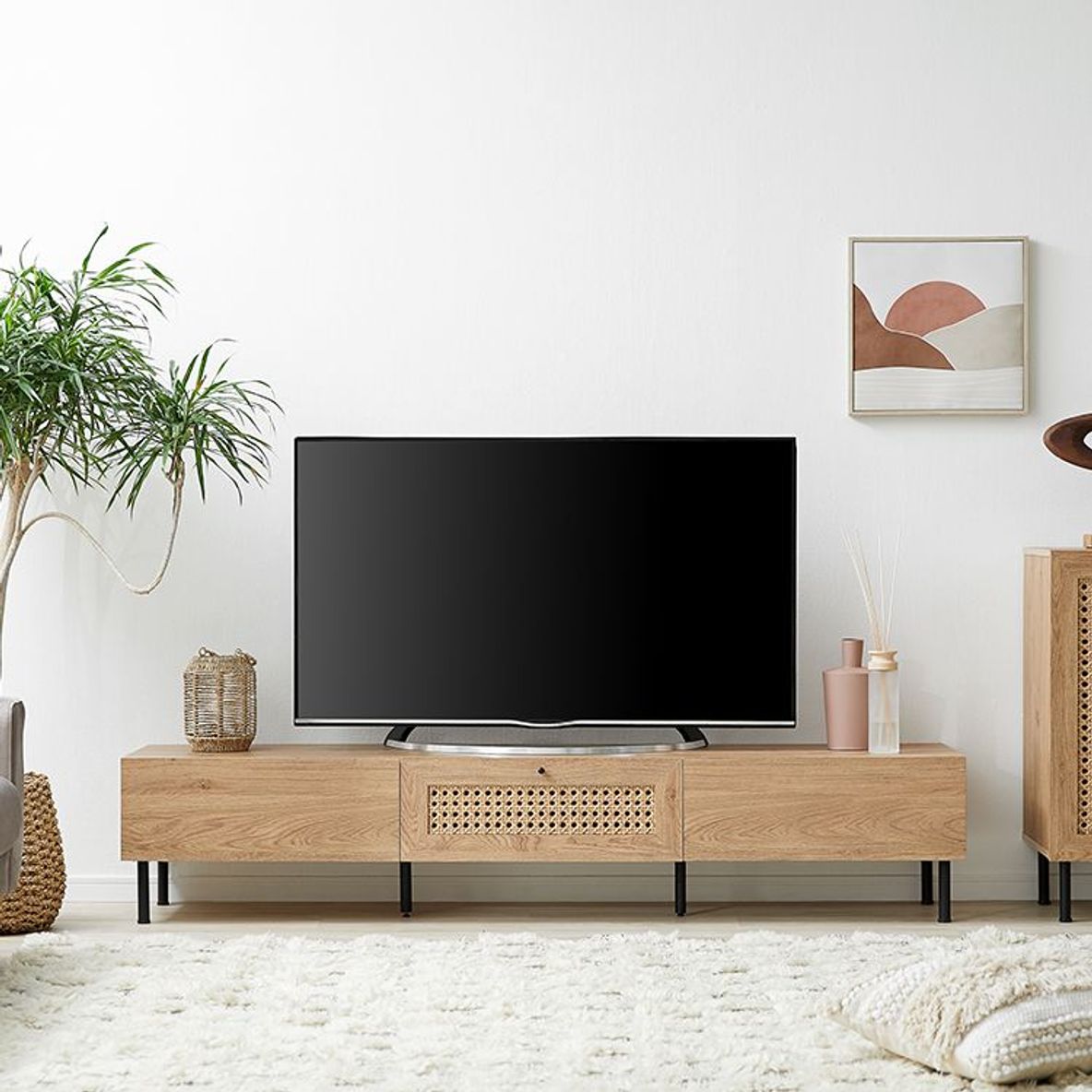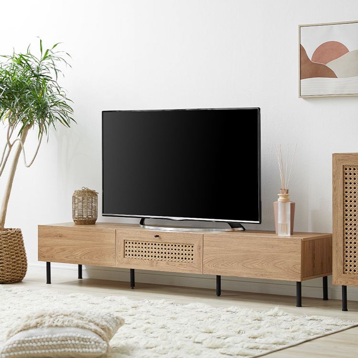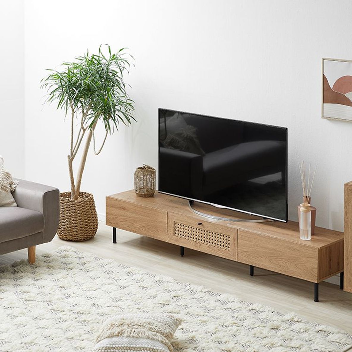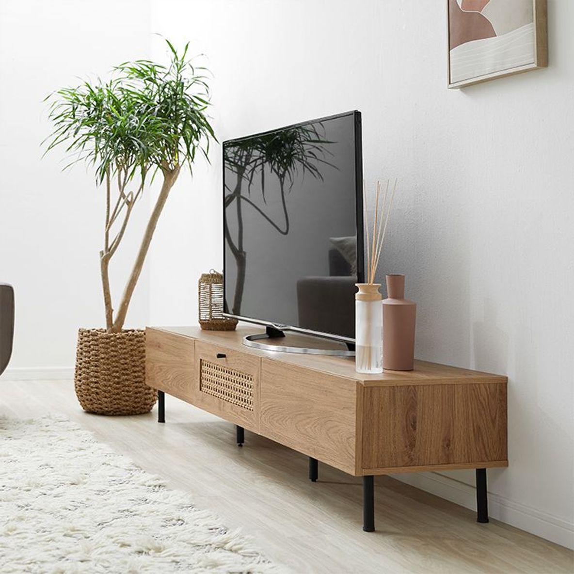 他とは違うおしゃれを取り入れたい方にぴったりの、ラタン調デザインをさりげなくあしらったテレビボードデザイン性の高さはもちろん、使いやすさ・収納力・コード配線にもこだわりました。こちらは当社デザイナーが独自のこだわりをもって完成させたオリジナル商品です。シンプルな中にも、他には無い味わいをデザインに落とし込み、カタチにしました。リビングの物がしっかりと片付く収納力が魅力の180cmタイプ。またテレビだけではなく、ディスプレイも広々と楽しめるサイズ感もポイントです。お部屋に合わせやすく、人とは違うモノを。リアルな木目調と細脚スチールの異素材を組み合わせることでこなれた雰囲気を演出。置くだけでセンスが光る空間に。