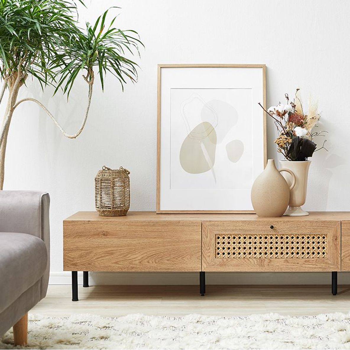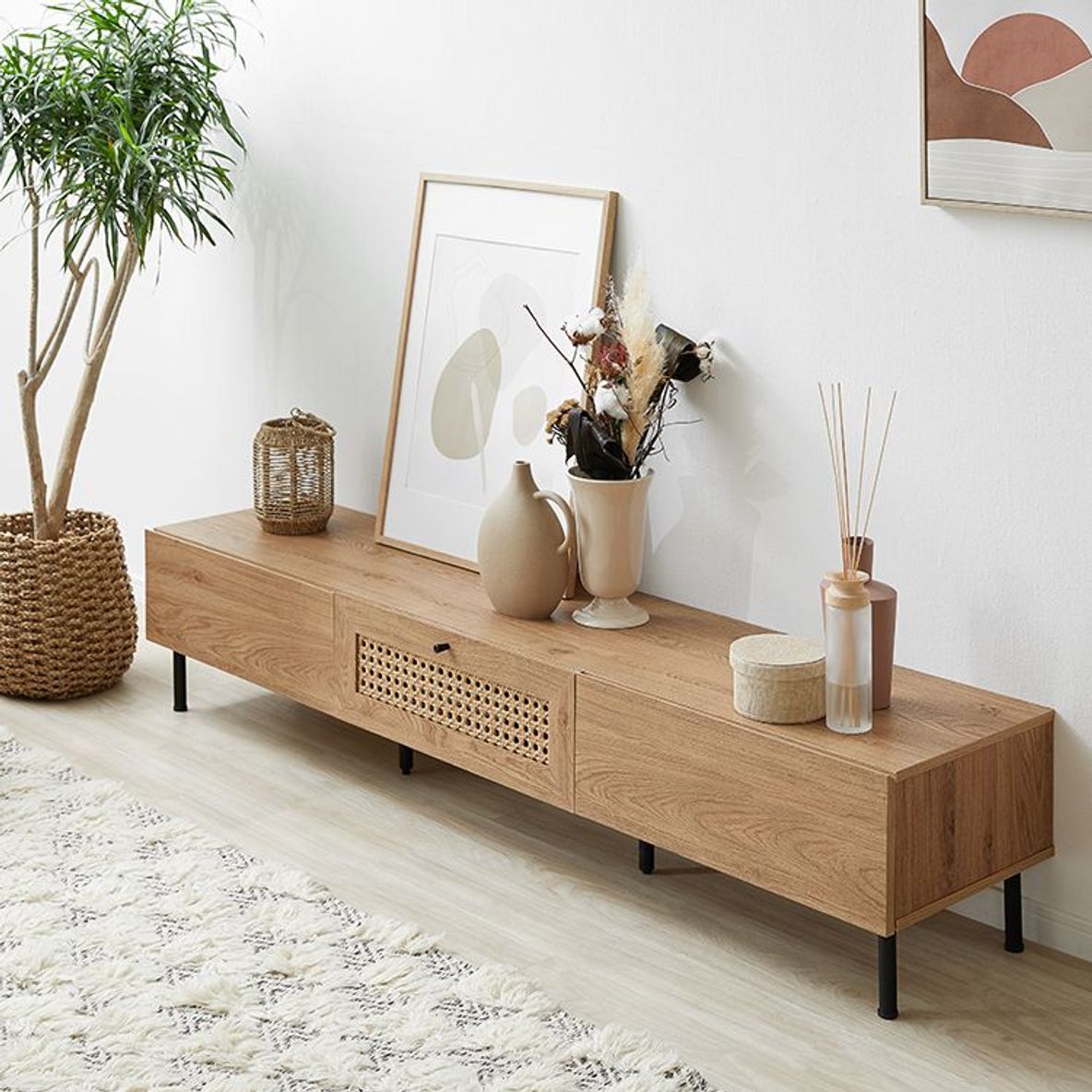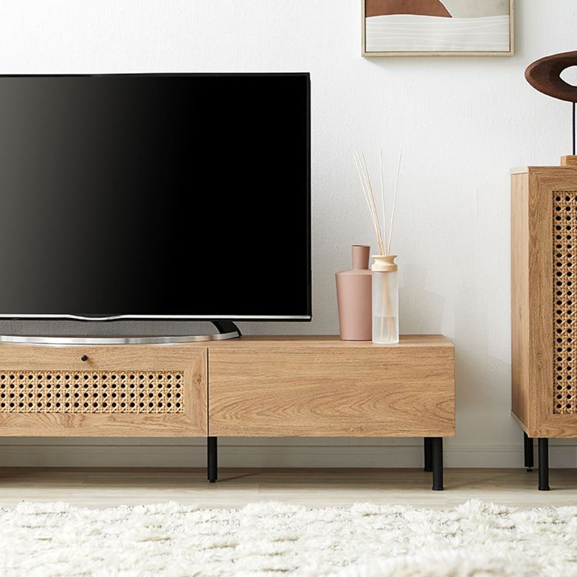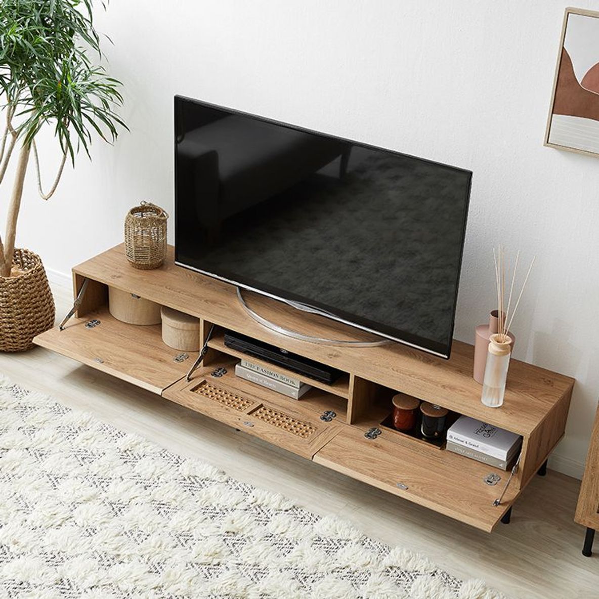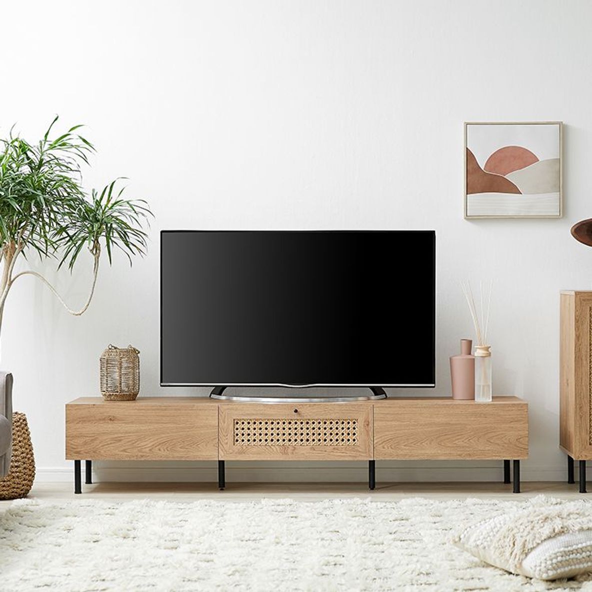他とは違うおしゃれを取り入れたい方にぴったりの、ラタン調デザインをさりげなくあしらったテレビボードデザイン性の高さはもちろん、使いやすさ・収納力・コード配線にもこだわりました。こちらは当社デザイナーが独自のこだわりをもって完成させたオリジナル商品です。シンプルな中にも、他には無い味わいをデザインに落とし込み、カタチにしました。リビングの物がしっかりと片付く収納力が魅力の180cmタイプ。またテレビだけではなく、ディスプレイも広々と楽しめるサイズ感もポイントです。お部屋に合わせやすく、人とは違うモノを。リアルな木目調と細脚スチールの異素材を組み合わせることでこなれた雰囲気を演出。置くだけでセンスが光る空間に。