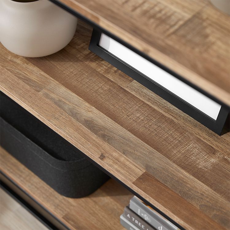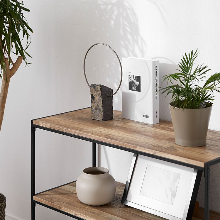 お部屋に馴染みやすい木目調に、細身のスチールをMIXした、シンプルで美しいオープンラック[3段]。お気に入りのアイテムを飾って、自分らしさが光るディスプレイを楽しめます。こちらは当社デザイナーが独自のこだわりをもって完成させたオリジナル商品!当社で人気のデザインをそのままに、スッと馴染みやすい木目調のオープンラックに仕上げました。マットブラックのスチールと、少しくすんだトーンの木目調を組み合わせたナチュラルモダンデザインです。本物の無垢材のような手触りの3Dペーパーを使用。3Dペーパーは、木目に合わせてザラザラと凹凸があるのが特徴です。