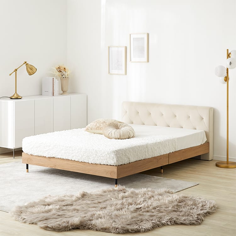 クラシカルなデザインにときめく、ダブルサイズのベッドフレーム。ベルベット調とゴールド脚の異素材が高級感漂う、憧れのエレガントな空間を演出してくれます。寝室の主役になるエレガントなこのベッドフレームは、美しいシルエットを生かしながらも、現代の日本の家庭に合うようにヘッドボードをデザインしました。