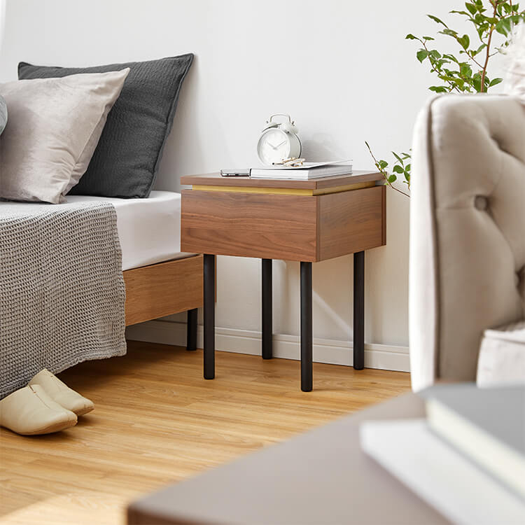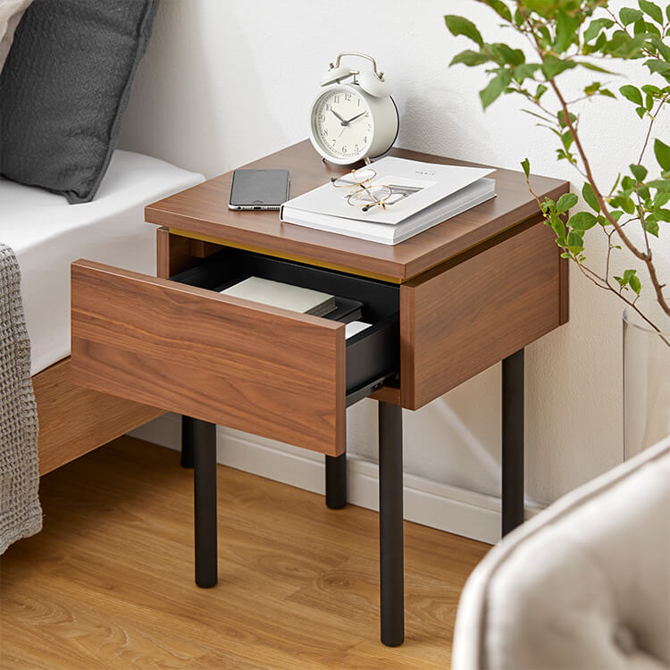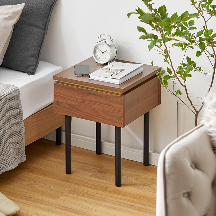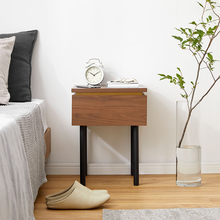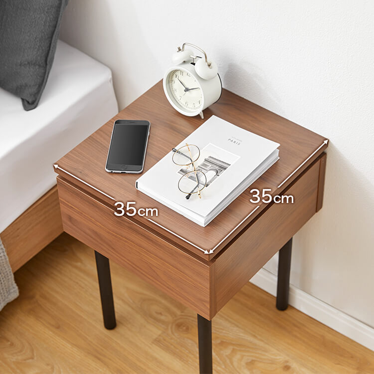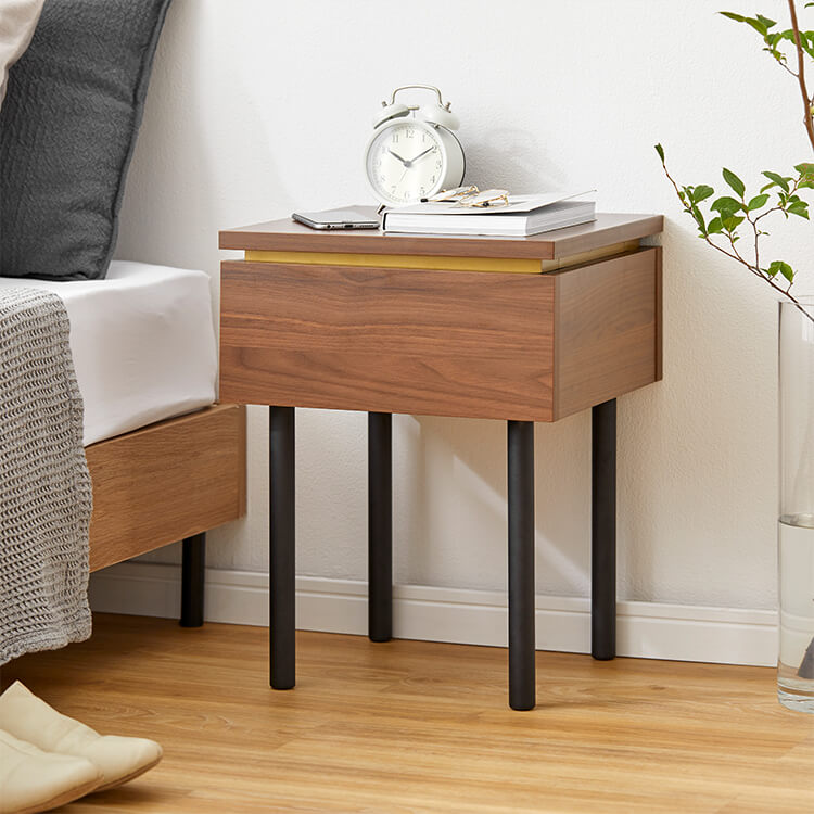 シンプルモダンで落ち着いたムードのサイドテーブルが、海外インテリアのようなオシャレ空間を演出してくれます。上品な海外インテリアを思わせる、味わい深いウォルナットの木目調と、ゴールドの組み合わせがポイント。無駄のないシンプルなデザインは、どの角度から見ても美しく際立ちます。どこにでも置きやすいコンパクトなサイズが魅力的。ソファやベッドサイドに置いて、ライトや観葉植物を飾るスペースとしてもピッタリ。自由なスタイルでご使用いただけます。天板は幅35×奥行35cmの正方形。コーヒーや本などはもちろん、タブレットやノートパソコンも置ける広さです。
