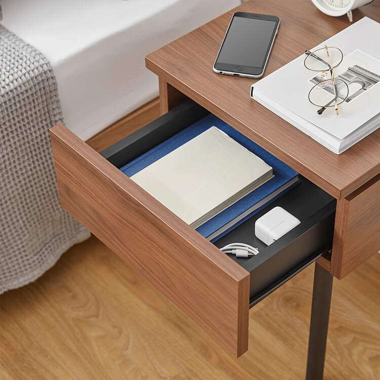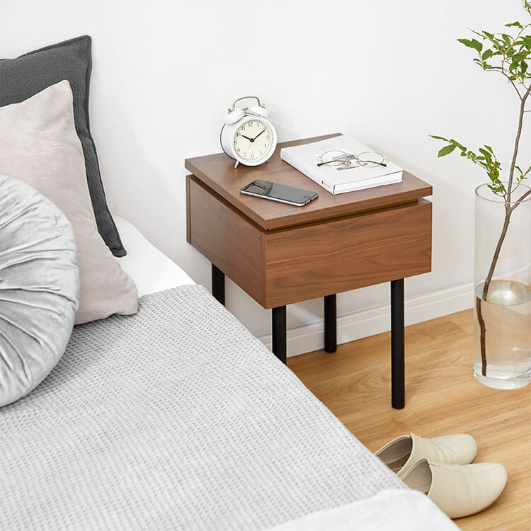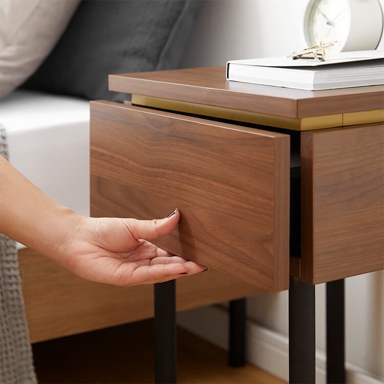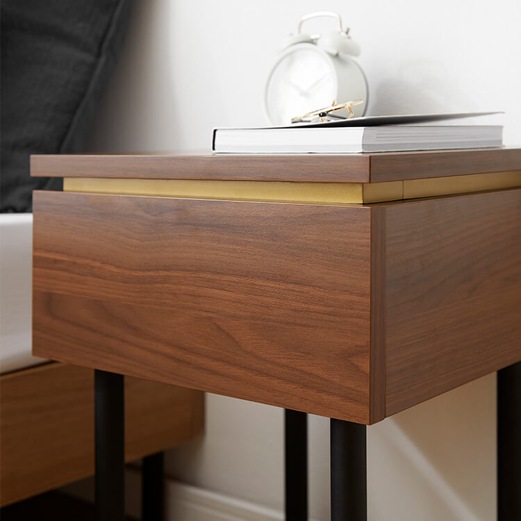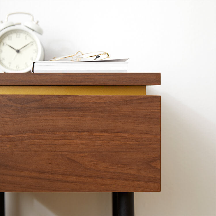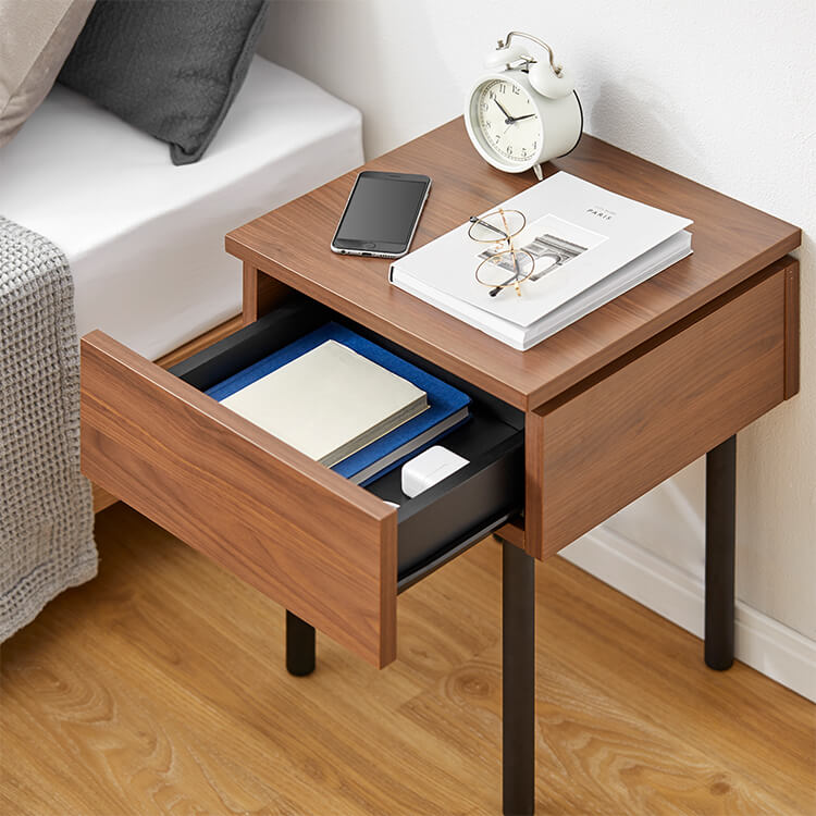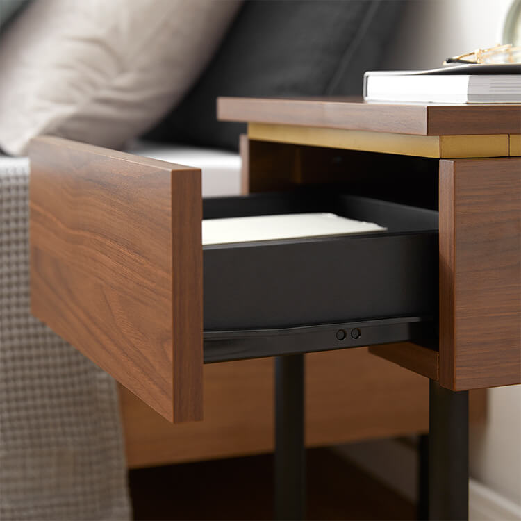 シンプルモダンで落ち着いたムードのサイドテーブルが、海外インテリアのようなオシャレ空間を演出してくれます。上品な海外インテリアを思わせる、味わい深いウォルナットの木目調と、ゴールドの組み合わせがポイント。無駄のないシンプルなデザインは、どの角度から見ても美しく際立ちます。どこにでも置きやすいコンパクトなサイズが魅力的。ソファやベッドサイドに置いて、ライトや観葉植物を飾るスペースとしてもピッタリ。自由なスタイルでご使用いただけます。天板は幅35×奥行35cmの正方形。コーヒーや本などはもちろん、タブレットやノートパソコンも置ける広さです。