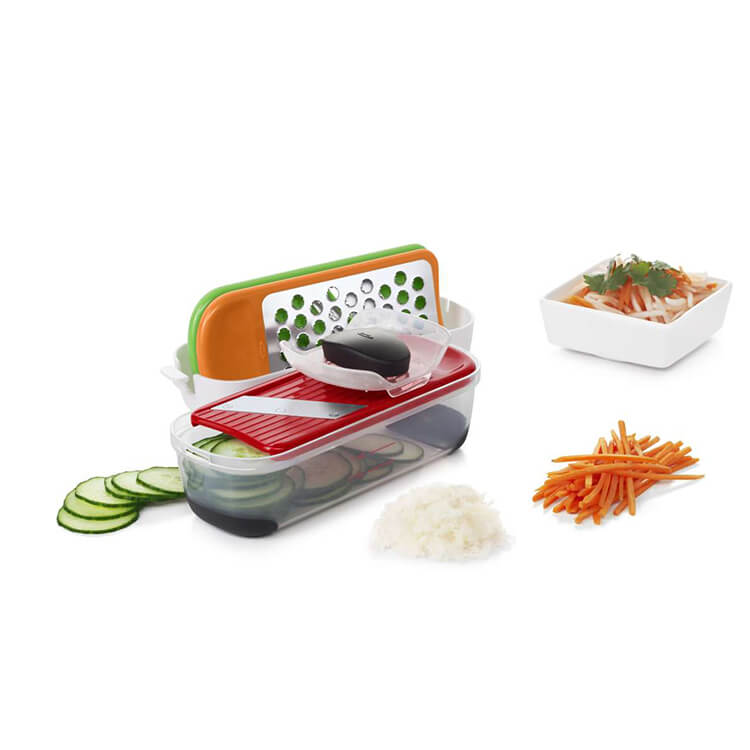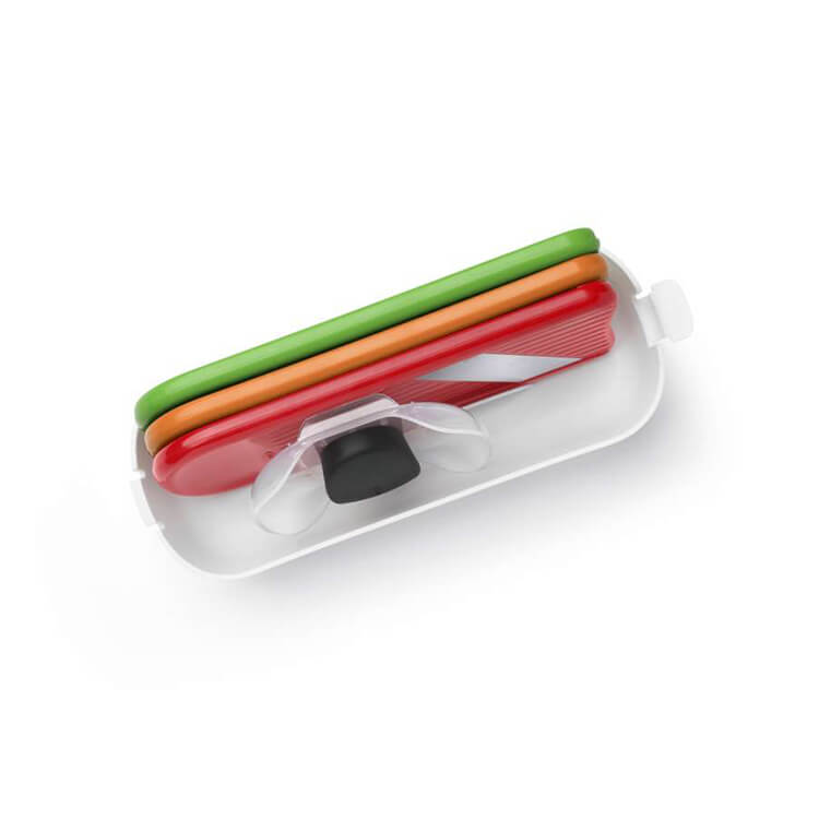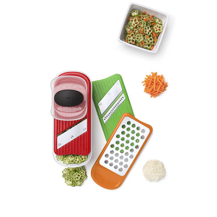 おろし、スライサー、千切りの3種類のブレート(刃)の便利なセットです。「より多くの人にとって使いやすいデザイン」を意味するユニバーサルデザイン。男女問わず、お年寄りから子供まで、右利きでも左利きでも簡単に使える製品を作るアメリカのブランドです。半透明のケースのフタは食材を受け止めるコンテナにもなります。滑りにくいよう底面には2か所の滑り止めのアシが付いています。カットした量の目安が分かる目盛りがついています。