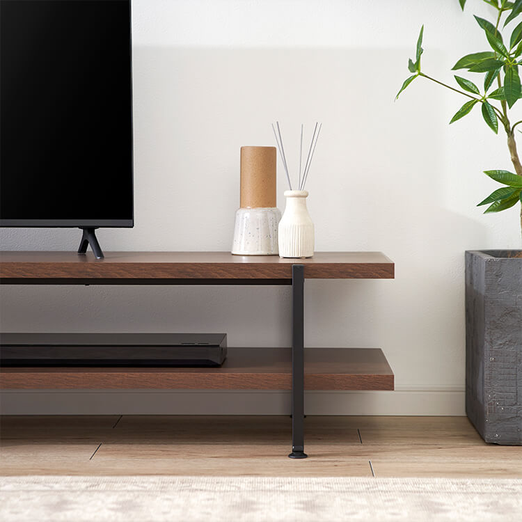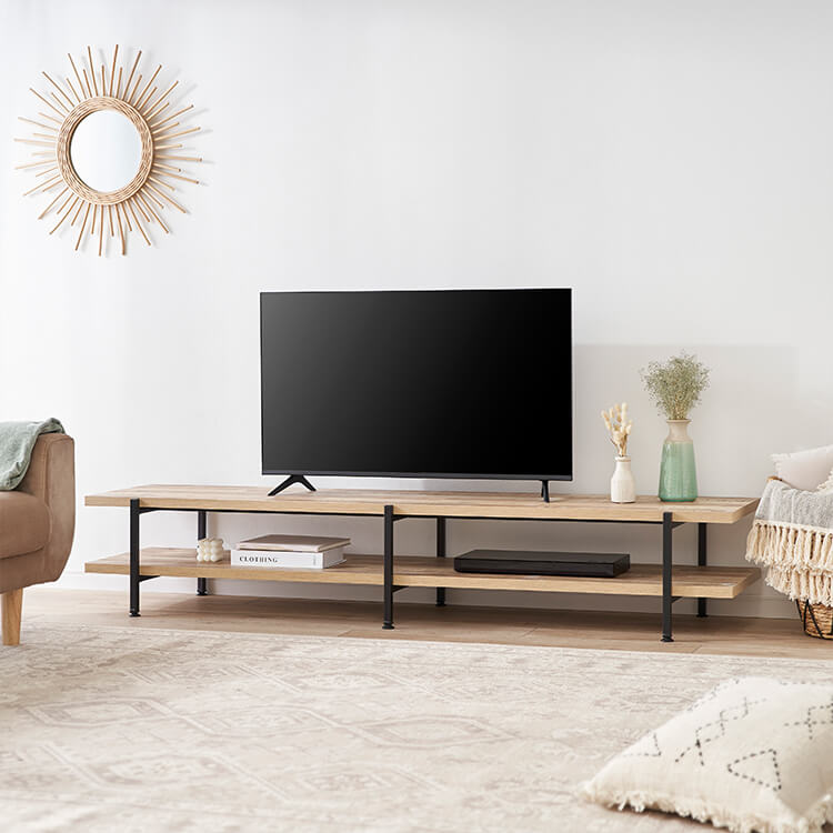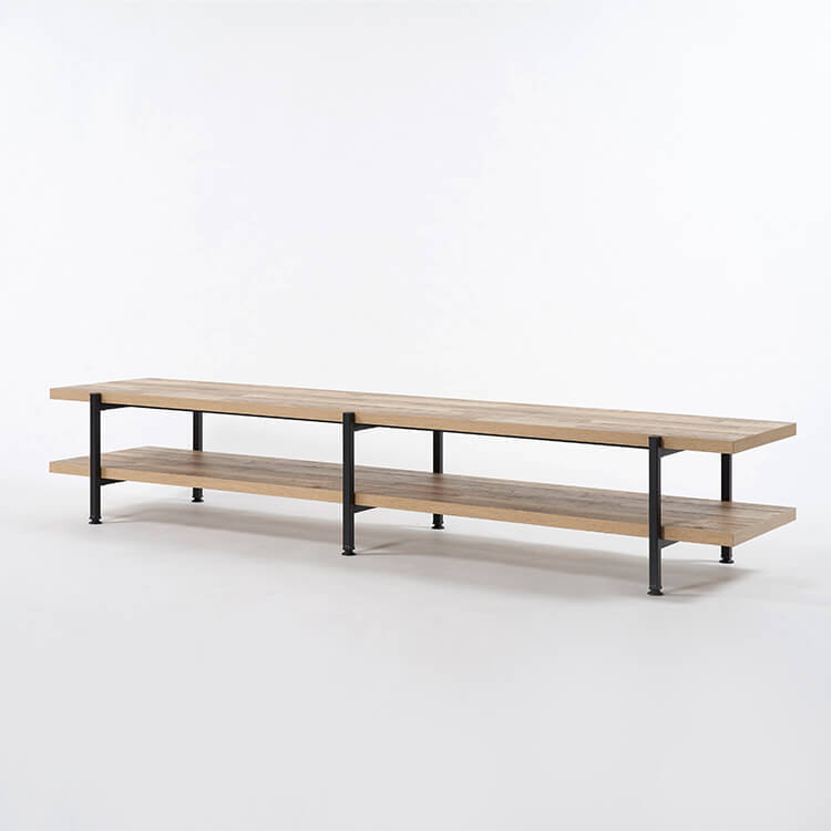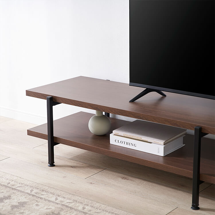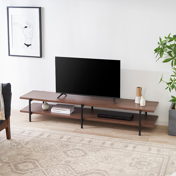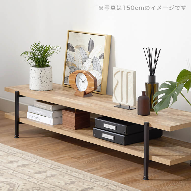 利便性の高さと美しさを併せ持つインダストリアル調のテレビボード[幅180cm]。シンプルなデザインで使いやすく、男前系に限らず様々なテイストのお部屋に馴染んでくれます。シンプルな異素材の組み合わせが、装飾で飾られたデザインとは違った魅力に。シンプルだからこそ、自分の理想の空間が叶うインダストリアル調シリーズです。こちらは当社デザイナーが独自のこだわりをもって完成させたオリジナル商品です。シンプルな中にも、他には無い味わいをデザインに落とし込み、カタチにしました。広々使えて余裕のある幅180cmタイプの天板は、テレビはもちろんお気に入りの雑貨を置くスペースとしてもぴったり!ロータイプのディスプレイ棚としても活躍します。