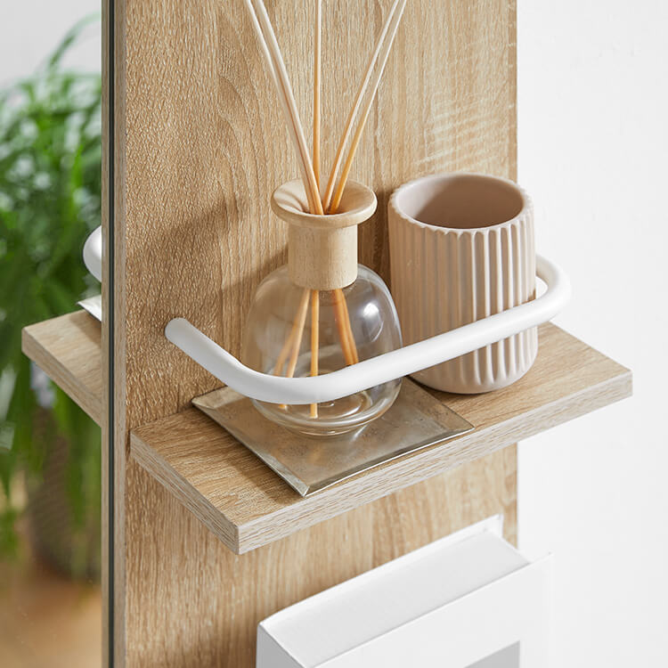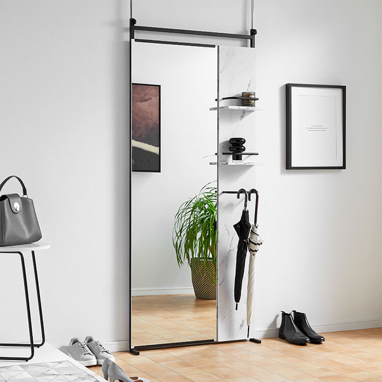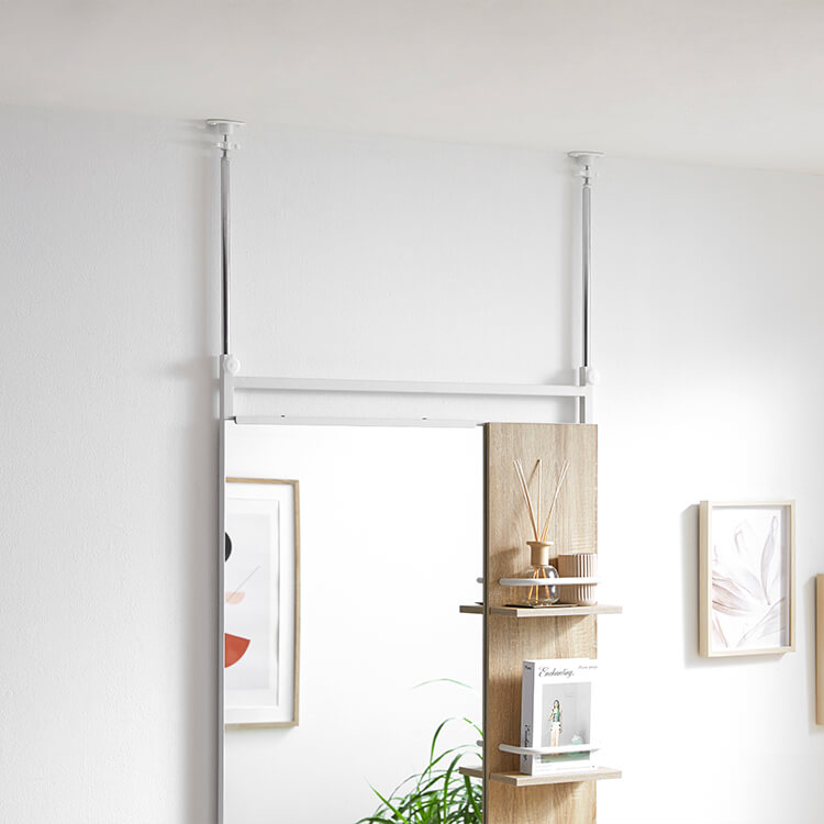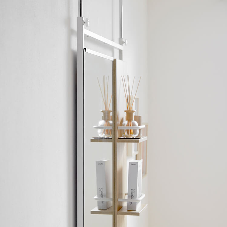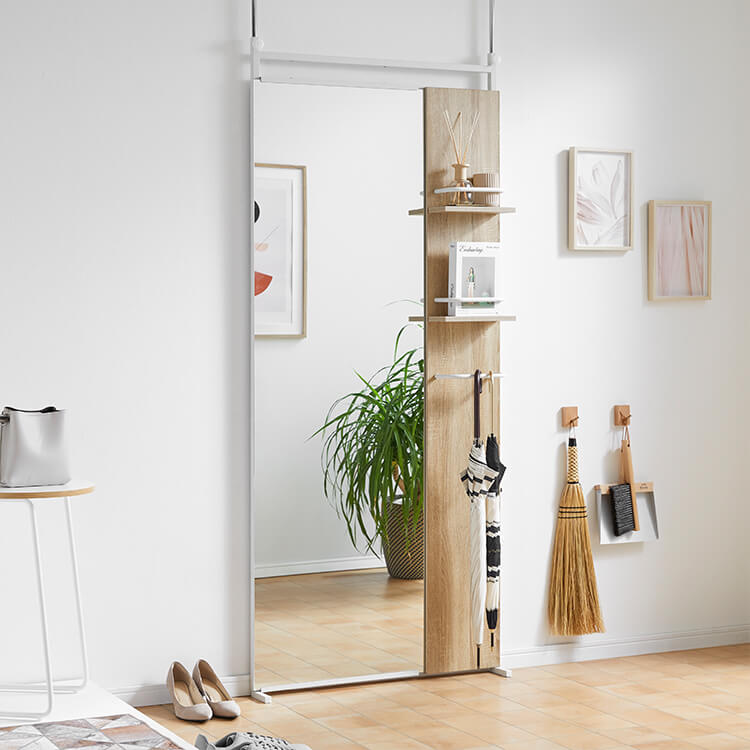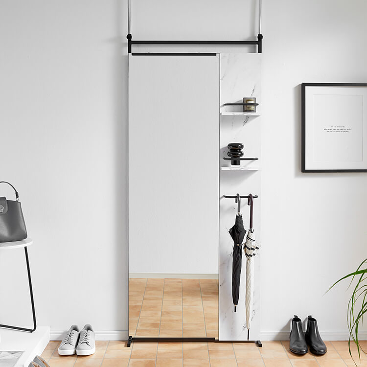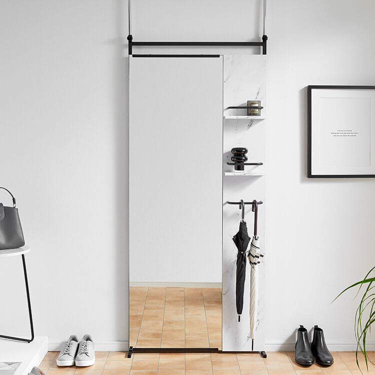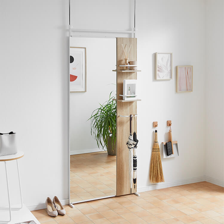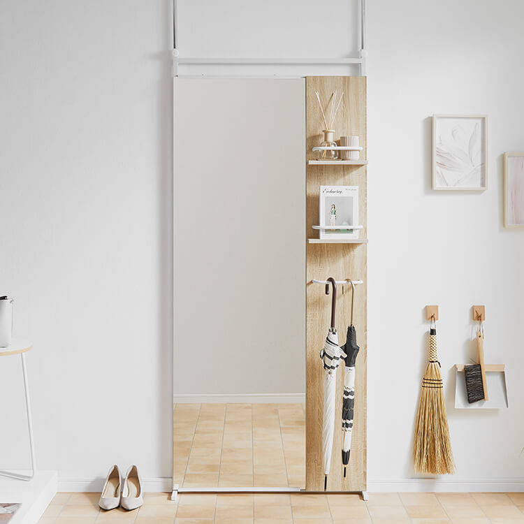限られたスペースをうまく活用できる収納付きミラー。天井と壁さえあれば、場所を選ばず、どこでも設置可能です。「姿見ミラー」に、「収納スペース」をプラス。省スペースでも、毎日のオシャレと、便利な収納を叶えてくれるアイテムです。玄関スペースに設置すれば、お出かけ前の身だしなみチェックもサッとできます。1台で、「ミラー」と「収納」の2役が叶うので、一人暮らしやワンルームのお部屋にもぴったりです。