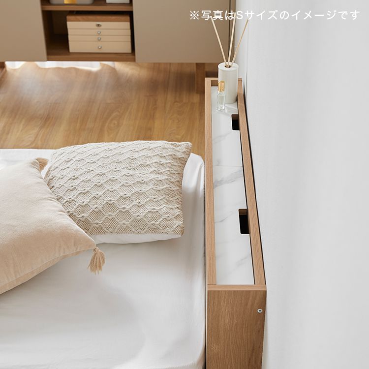 落ち着いた雰囲気を演出する「木目調×大理石柄」のデザインと、便利な収納スペースを施したロースタイルベッド。窮屈になりがちな寝室をスッキリ快適な空間にしてくれます。「リバーシブル仕様」「便利な宮棚」「ロースタイル」の3つのポイントが、より過ごしやすいベッドルームへと導きます。こちらは当社デザイナーが独自のこだわりを持って完成させたオリジナル商品です。インテリアに取り入れやすい大理石柄のアクセントと、くつろぎ感を与えられるロータイプデザインにこだわりました。ホワイトインテリアやモダンインテリアなど幅広いテイストに合わせやすい「木目調×大理石柄」の組み合わせ。ワンポイントに大理石柄が入ることで高級感を感じ、落ち着いたムードを演出します。