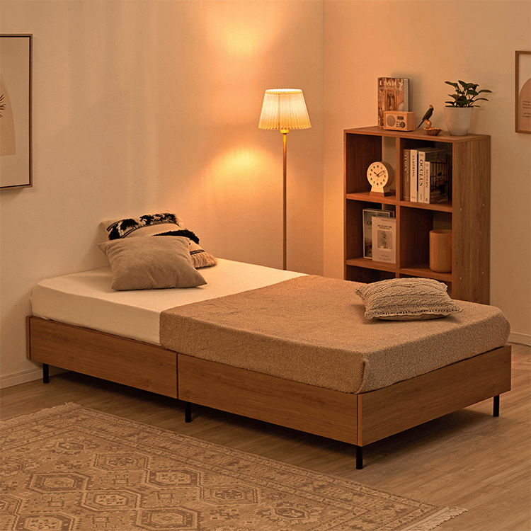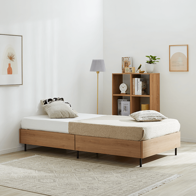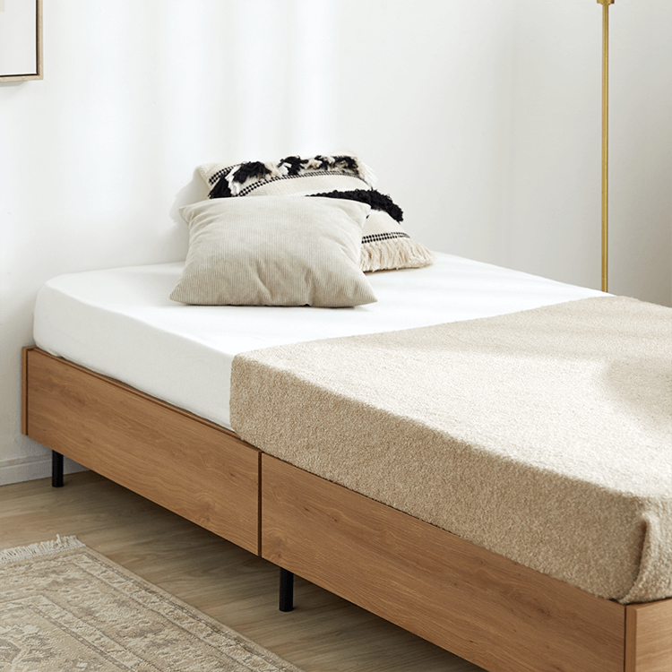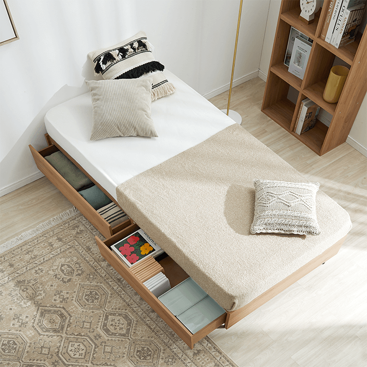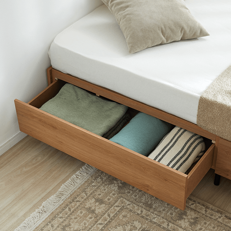 引き出し収納で荷物をすっきりお片付け!さらに、脚付きのスマートデザインで、スペースが限られたお部屋の悩みと願いに寄り添うローベッドです。一見、収納の無いシンプルなベッドに見えますが、実は2つの引き出し収納が!引き出すまで気付かない、さりげなく物を仕舞えるデザインです。一般的な収納付きベッドと比べると、脚元に余白があるだけで、お部屋の抜け感がこれだけ違う!一般的な収納付きベッド特有のズッシリさを抑える為、収納はそのままに脚元に空間をつくりました。解放感のある寝室をつくりたい時はロースタイルがオススメ!狭く窮屈な印象になりがちな寝室も、ベッドの高さを低くすることで天井が高く感じられます。