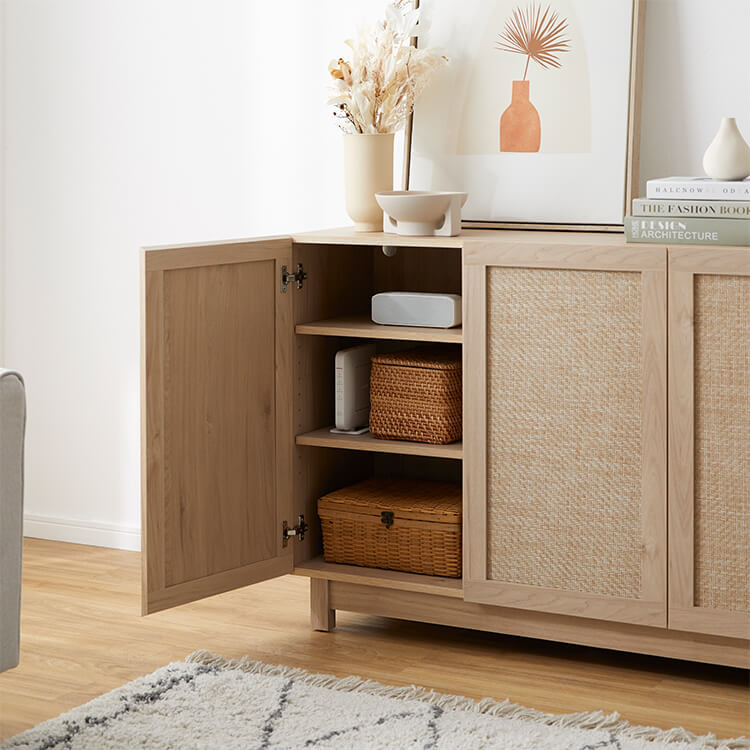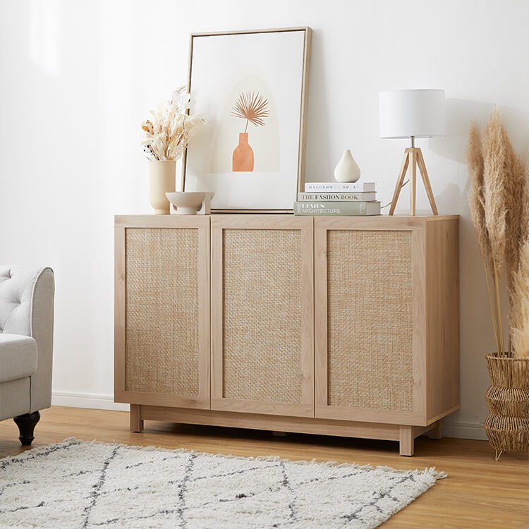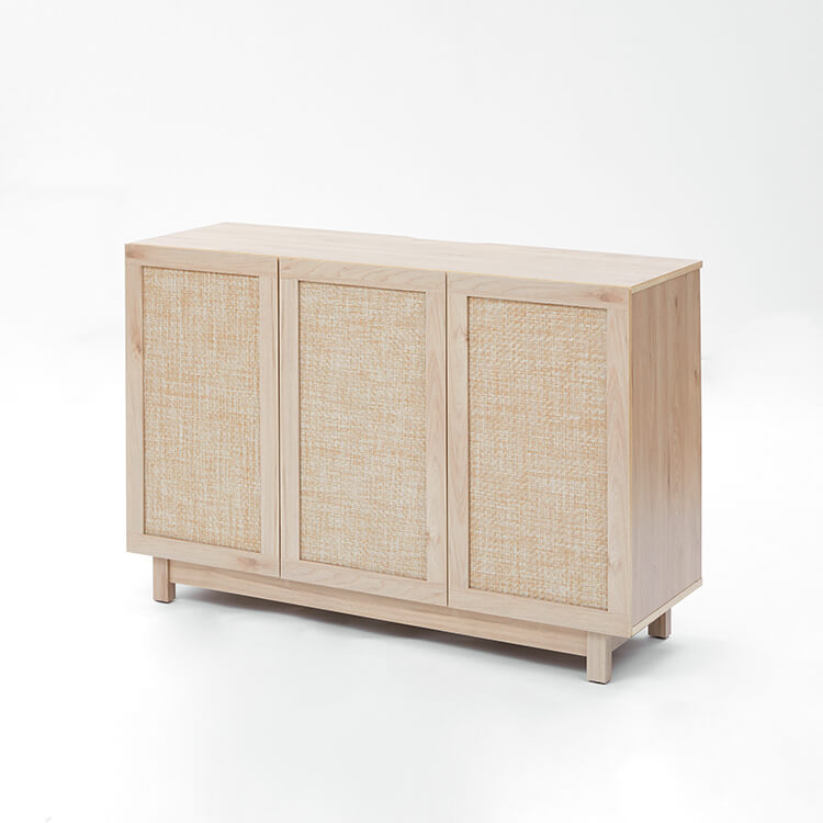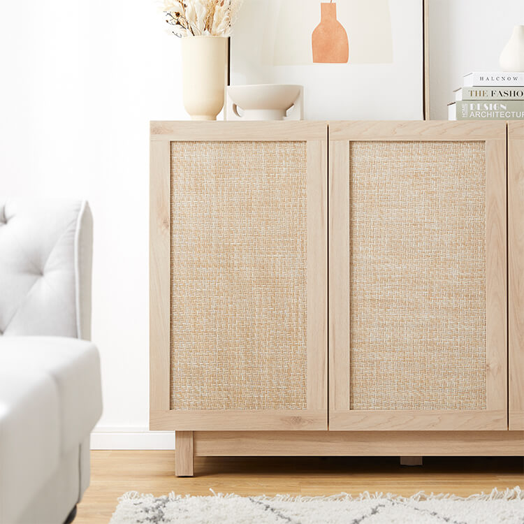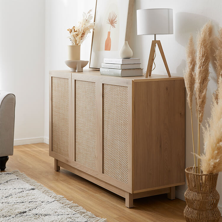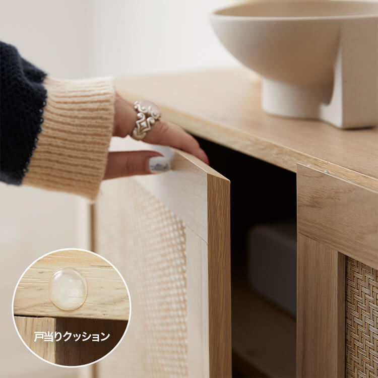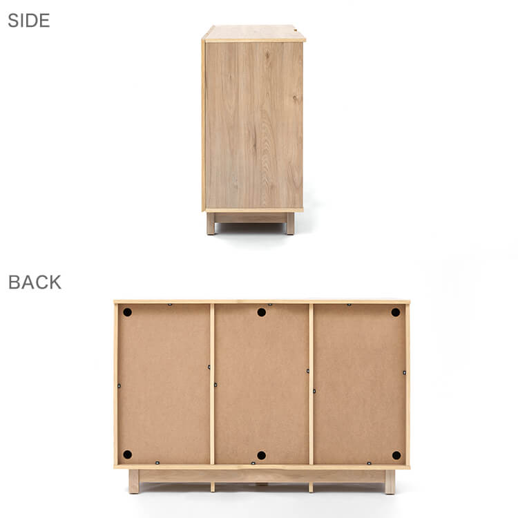 あたたかみのある木目調にリアルな麻風素材を組み合わせたサイドボード[幅約120cm]。麻風の素材感が織りなすナチュラルな風合いが、ジャパンディスタイルのような快適で居心地のいい空間を演出します。開き扉の前板には、本物の麻ではなく、ポリ塩化ビニルを使用することでお手入れも手軽になりました。明るく軽やかな見た目がデザイン全体のアクセントに。思わず触れたくなるような木目調は、木のぬくもりを表現したリアルで洗練された張地にこだわりました。デザイン性を高めるために、扉を開けた際に見える組み立てのネジ穴を隠せるキャップをお付けしています。こちらは当社デザイナーが独自のこだわりをもって完成させたオリジナル商品です。シンプルな中にも、他には無い味わいをデザインに落とし込み、カタチにしました。