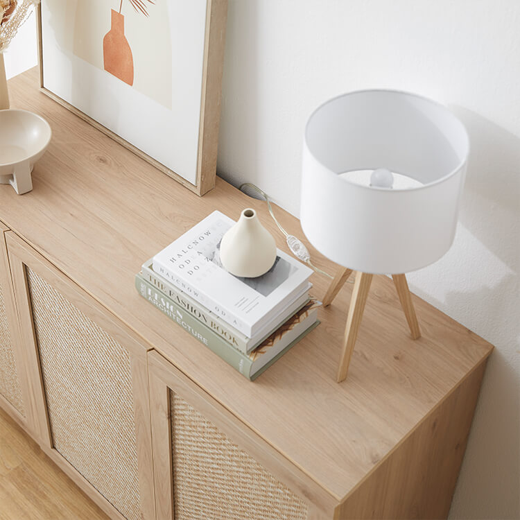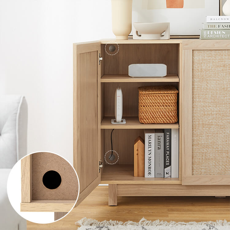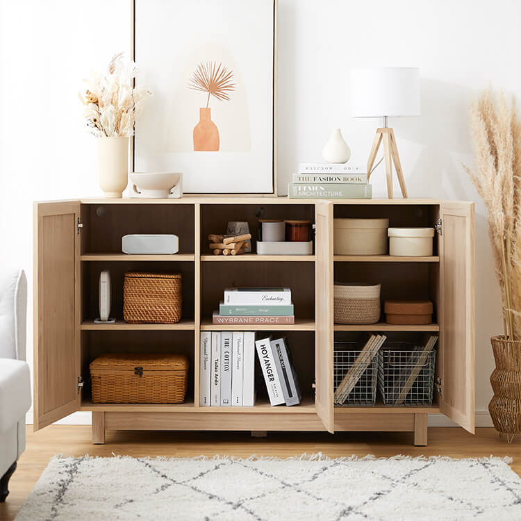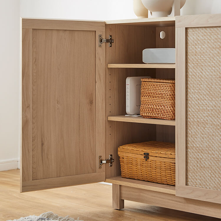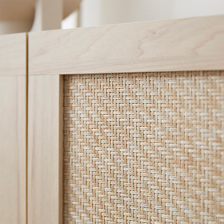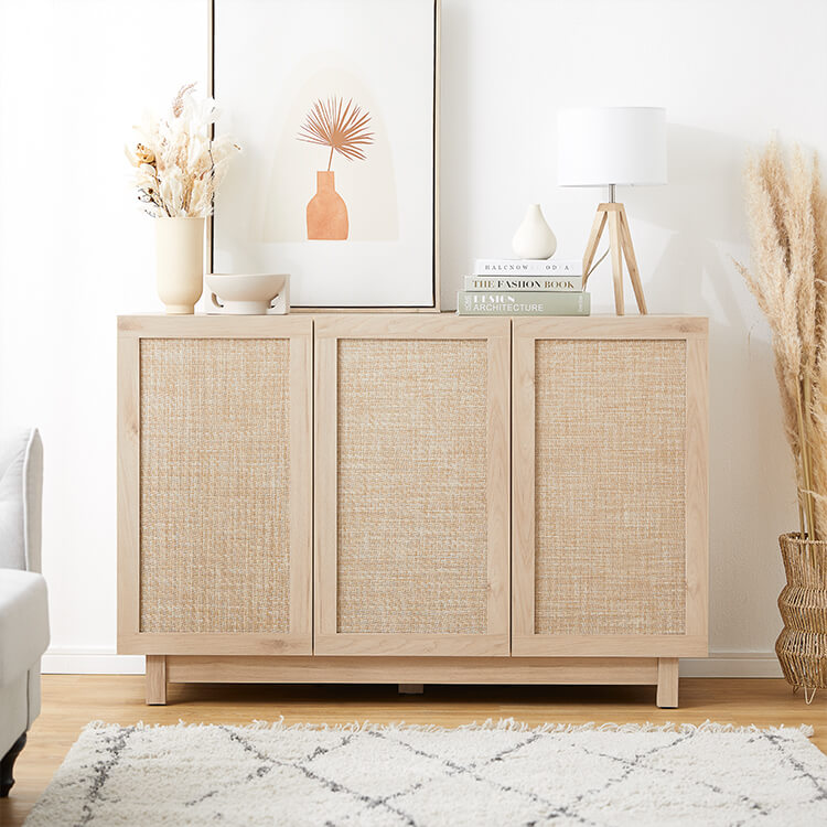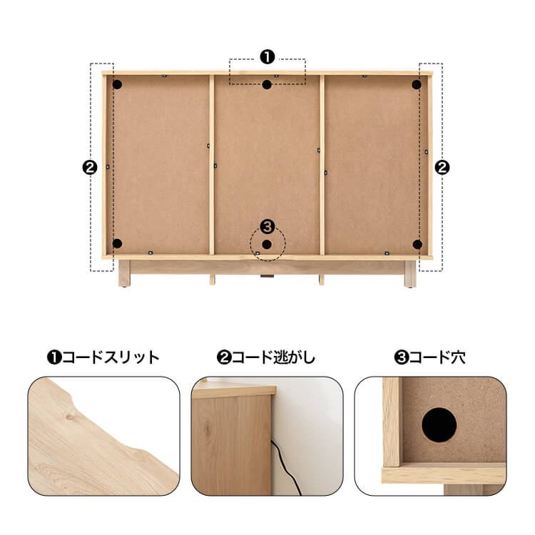 あたたかみのある木目調にリアルな麻風素材を組み合わせたサイドボード[幅約120cm]。麻風の素材感が織りなすナチュラルな風合いが、ジャパンディスタイルのような快適で居心地のいい空間を演出します。開き扉の前板には、本物の麻ではなく、ポリ塩化ビニルを使用することでお手入れも手軽になりました。明るく軽やかな見た目がデザイン全体のアクセントに。思わず触れたくなるような木目調は、木のぬくもりを表現したリアルで洗練された張地にこだわりました。デザイン性を高めるために、扉を開けた際に見える組み立てのネジ穴を隠せるキャップをお付けしています。こちらは当社デザイナーが独自のこだわりをもって完成させたオリジナル商品です。シンプルな中にも、他には無い味わいをデザインに落とし込み、カタチにしました。