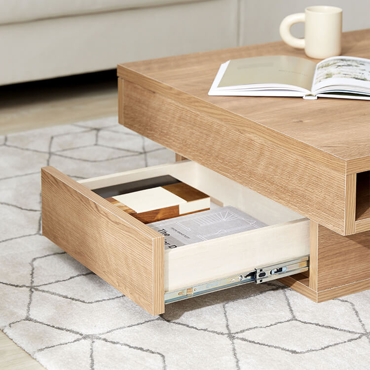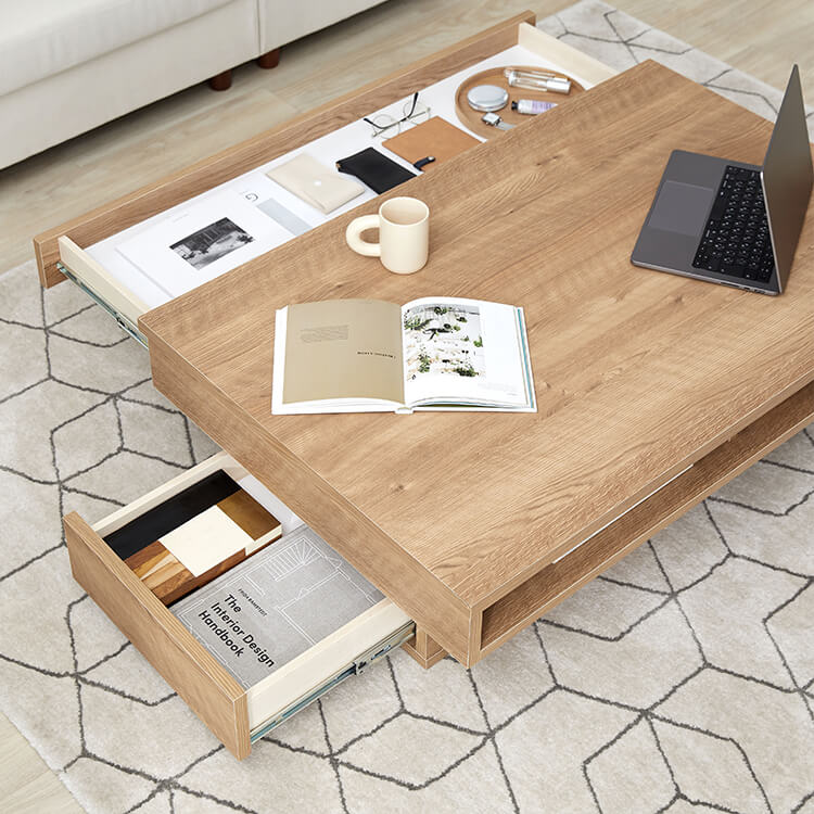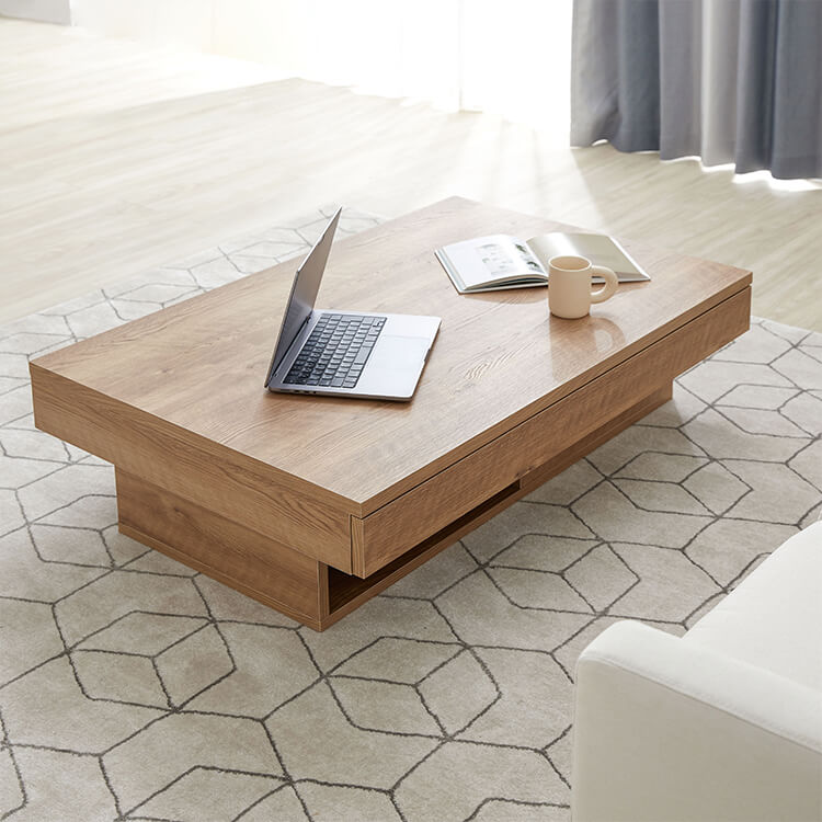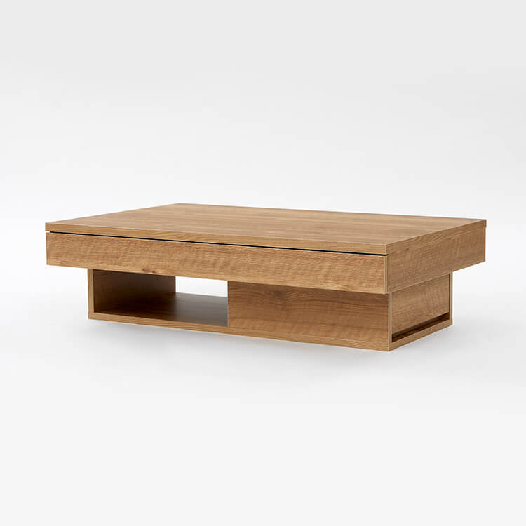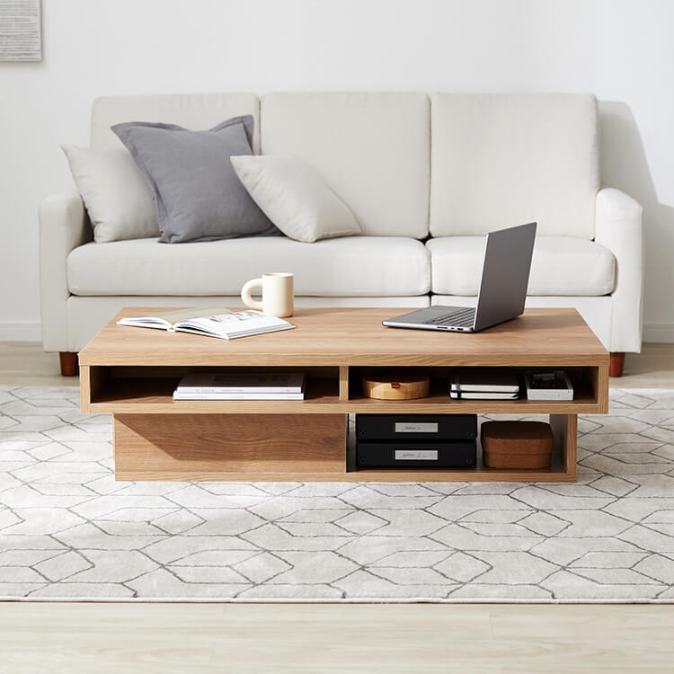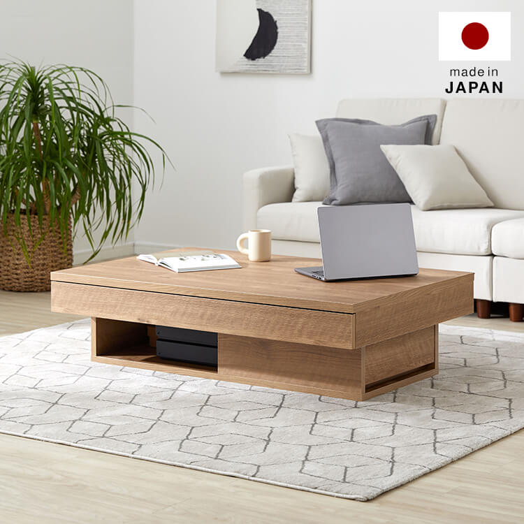 落ち着いた木目調と洗練されたデザインが美しい、日本製センターテーブル。テーブルの台輪部分に収納機能をつけることでさらに収納力をアップ!ごちゃつきがちな小物や雑誌などをスッキリ収納できます。こちらは当社デザイナーが独自のこだわりをもって完成させたオリジナル商品です。美しい木目柄を遮る取っ手をつけないことで、スタイルを選ばないフラットなデザインに仕上げました。リビングの生活感を隠す、5カ所の収納スペースを確保!隠したいものは引き出しに、隠したら使いづらいティッシュなどはオープン収納に。隠すor見せる収納を使い分けると便利です。天板下には、生活感を隠す「浅め」の引き出し、台輪部分には「深め」の引き出しを設けました。リビングのごちゃつきがちな小物や雑誌などをスッキリ収納できます。