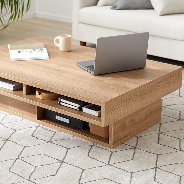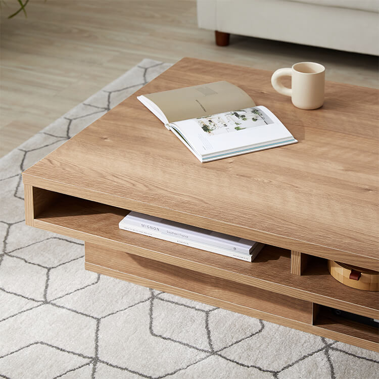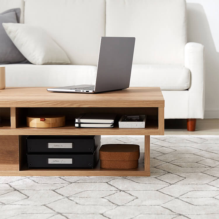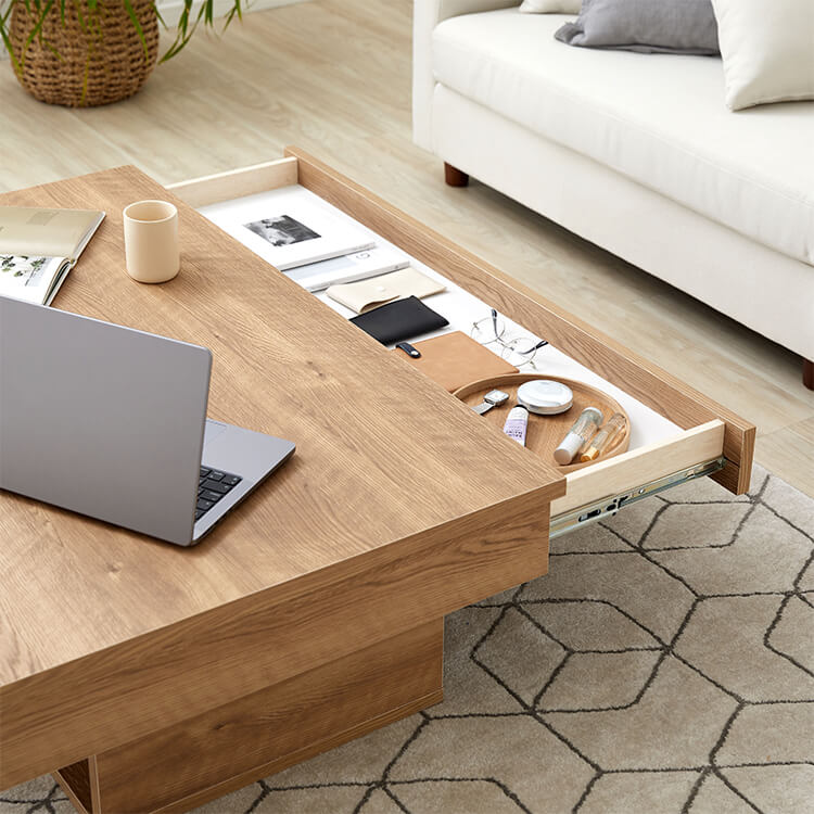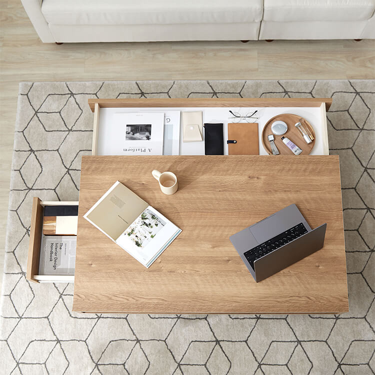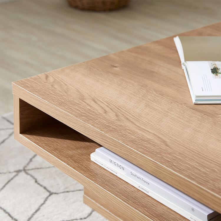 落ち着いた木目調と洗練されたデザインが美しい、日本製センターテーブル。テーブルの台輪部分に収納機能をつけることでさらに収納力をアップ!ごちゃつきがちな小物や雑誌などをスッキリ収納できます。こちらは当社デザイナーが独自のこだわりをもって完成させたオリジナル商品です。美しい木目柄を遮る取っ手をつけないことで、スタイルを選ばないフラットなデザインに仕上げました。リビングの生活感を隠す、5カ所の収納スペースを確保!隠したいものは引き出しに、隠したら使いづらいティッシュなどはオープン収納に。隠すor見せる収納を使い分けると便利です。天板下には、生活感を隠す「浅め」の引き出し、台輪部分には「深め」の引き出しを設けました。リビングのごちゃつきがちな小物や雑誌などをスッキリ収納できます。