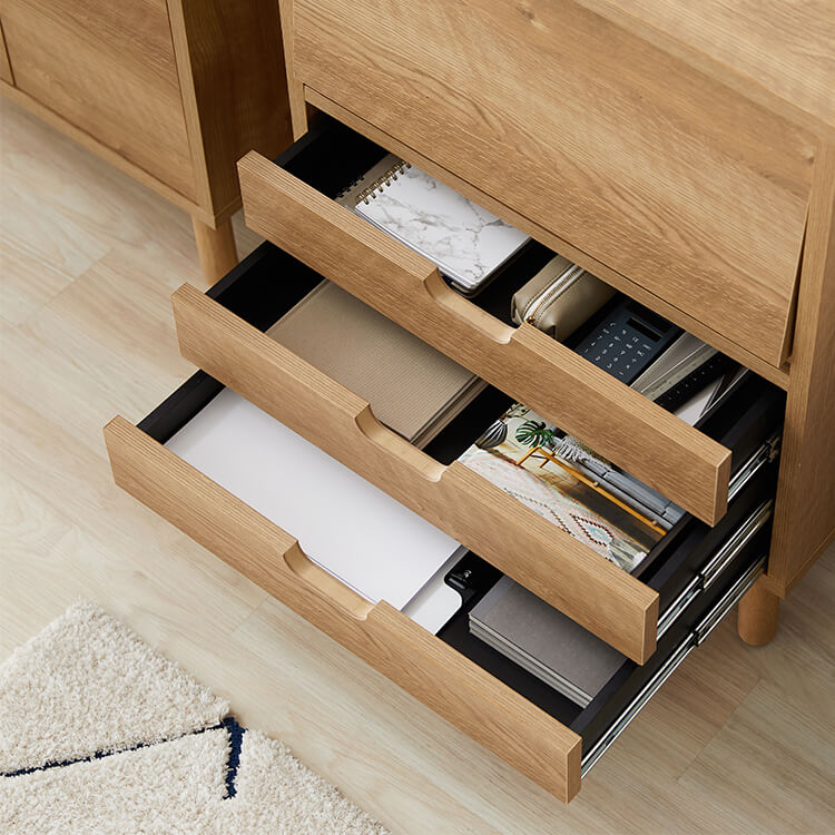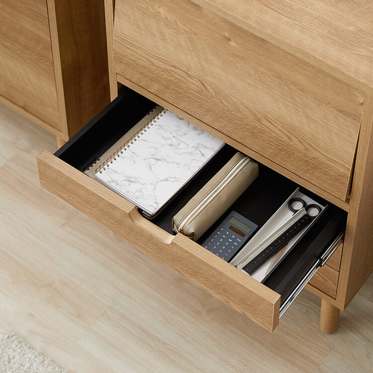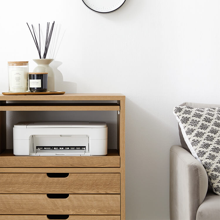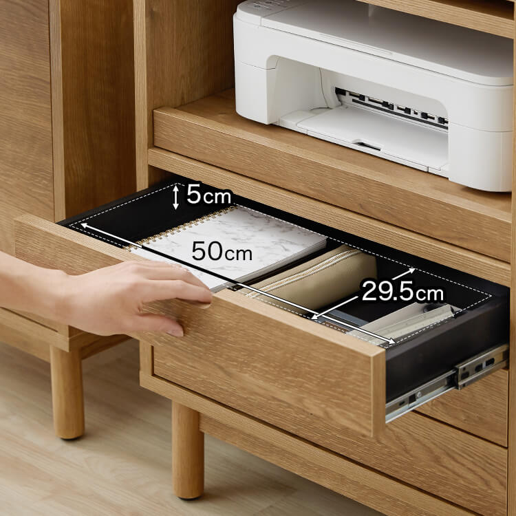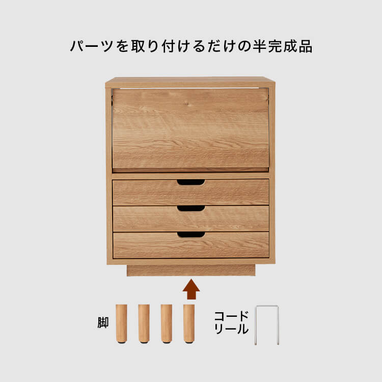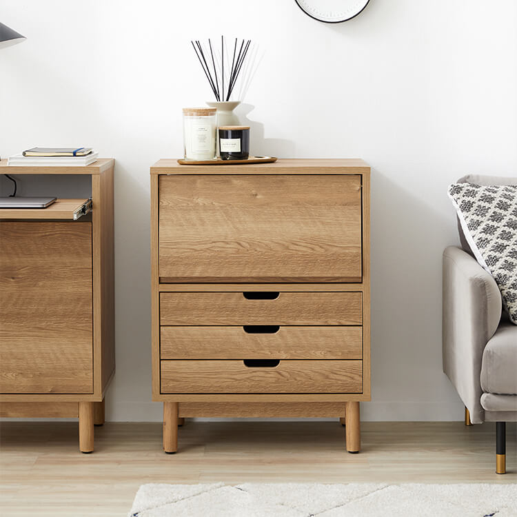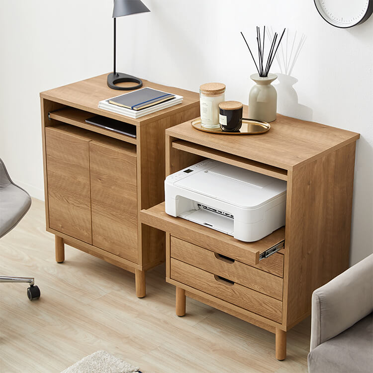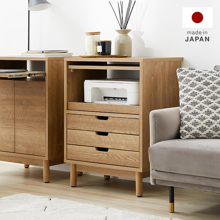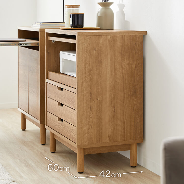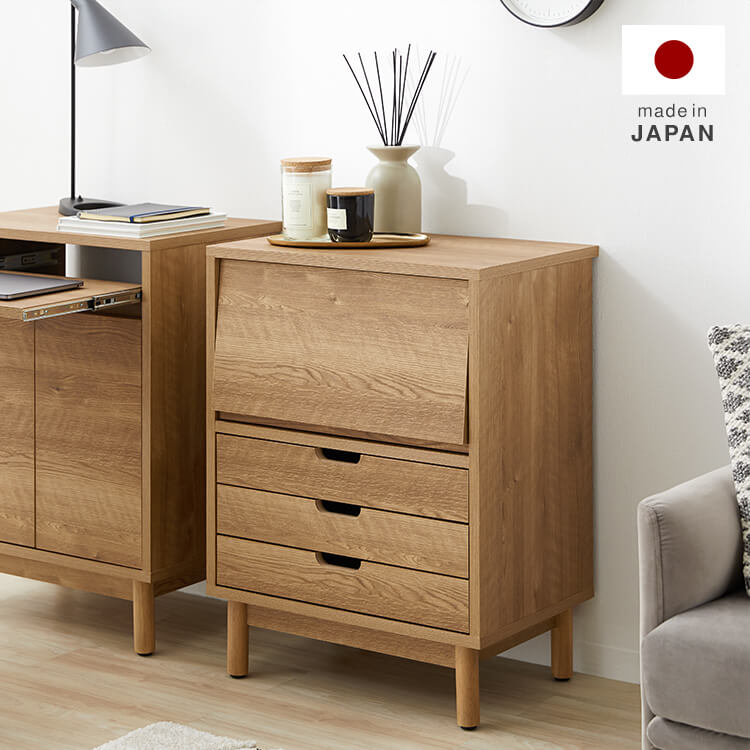 フラップ扉で生活感を隠せるキャビネット。PC、プリンター、電話などの家電から、小物類や書類まで、リビングに溢れるモノをスッキリ収納できます。シンプルでナチュラルなデザインが落ち着いた空間を演出。リアルな木目調と、取っ手の無い上品なフラットデザインで生活感を美しくしまいます。熟練の家具職人が一つ一つ丁寧に真心を込めて作り上げました。シンプルなデザインの中に、匠の精巧な美しさが光ります。お部屋の圧迫感を抑えて、気軽に置きやすい幅60×奥行42cm。ワンルームやリビングにオススメのサイズ感です。
