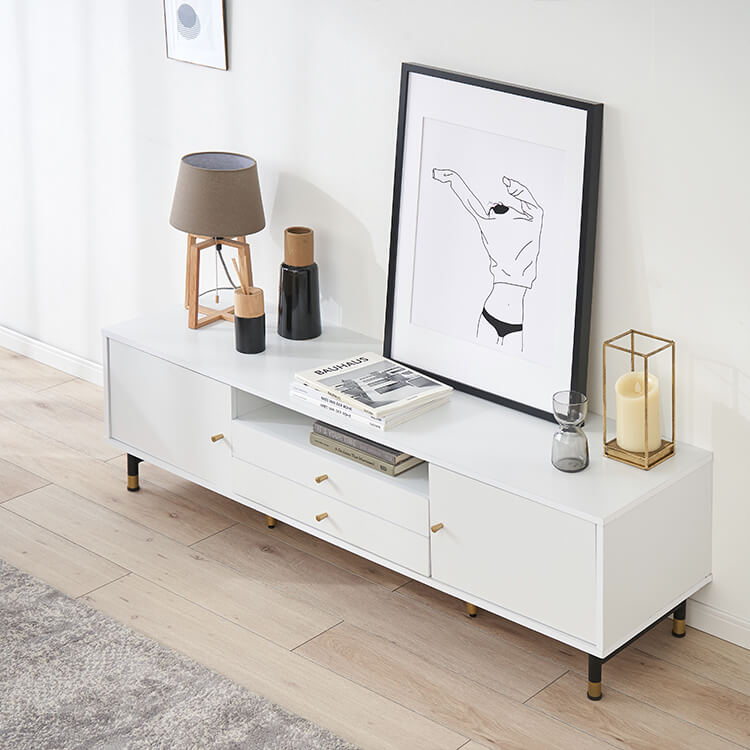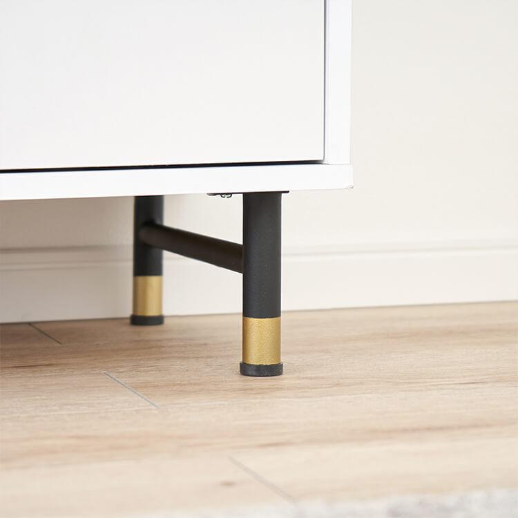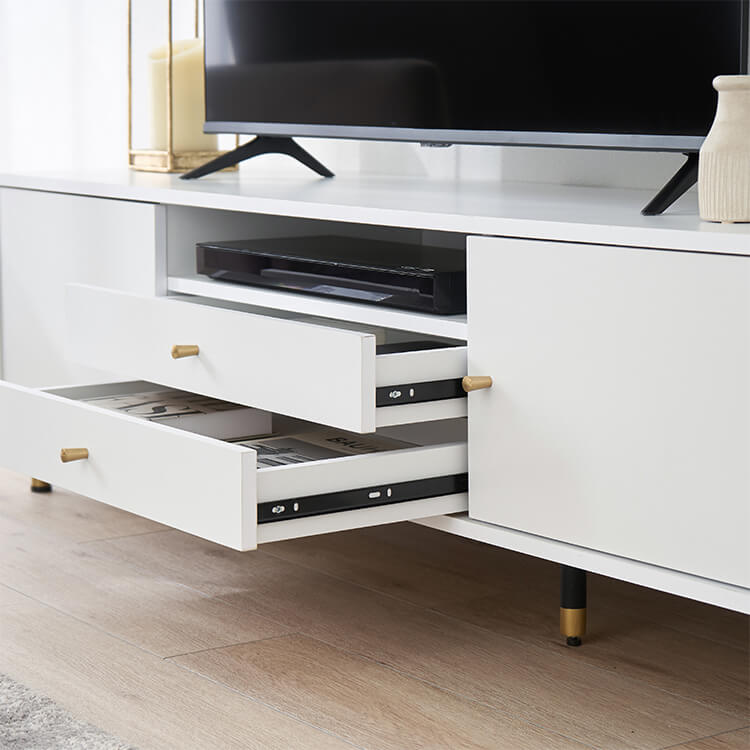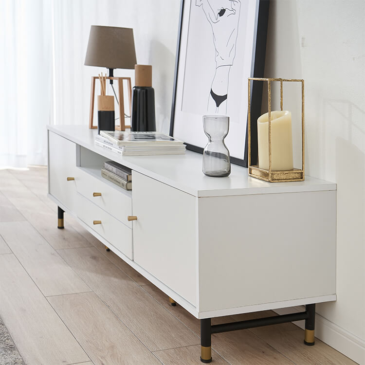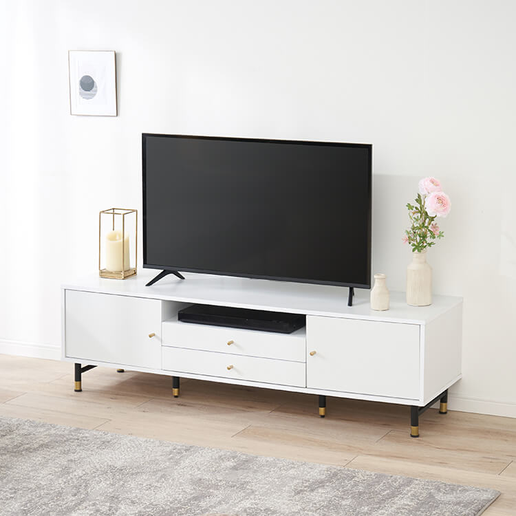 ホワイトを基調としたデザインの中に光るゴールドカラーがエレガントな印象のテレビボード。幅140cmとワンルームにもおすすめのサイズ感です。高級感漂うエレガントなテレビボードは、綺麗めスタイルにピッタリ。甘くなりすぎない、大人っぽさのあるお部屋をつくります。取っ手と脚にはアクセントとなる、ゴールドカラーを取り入れました。シンプルなデザインの中に、ゴージャスで美しい印象をプラスします。ゴールドカラーの、上品さと美しさが光るさりげない取っ手。大ぶりの取っ手とは異なり、スッキリとした印象へと導きます。