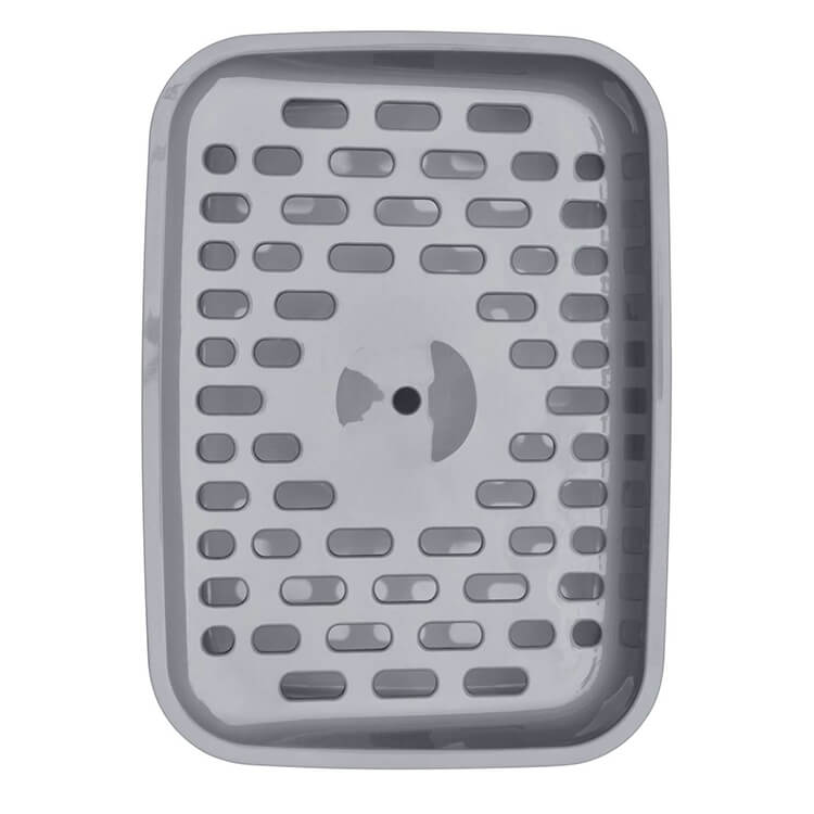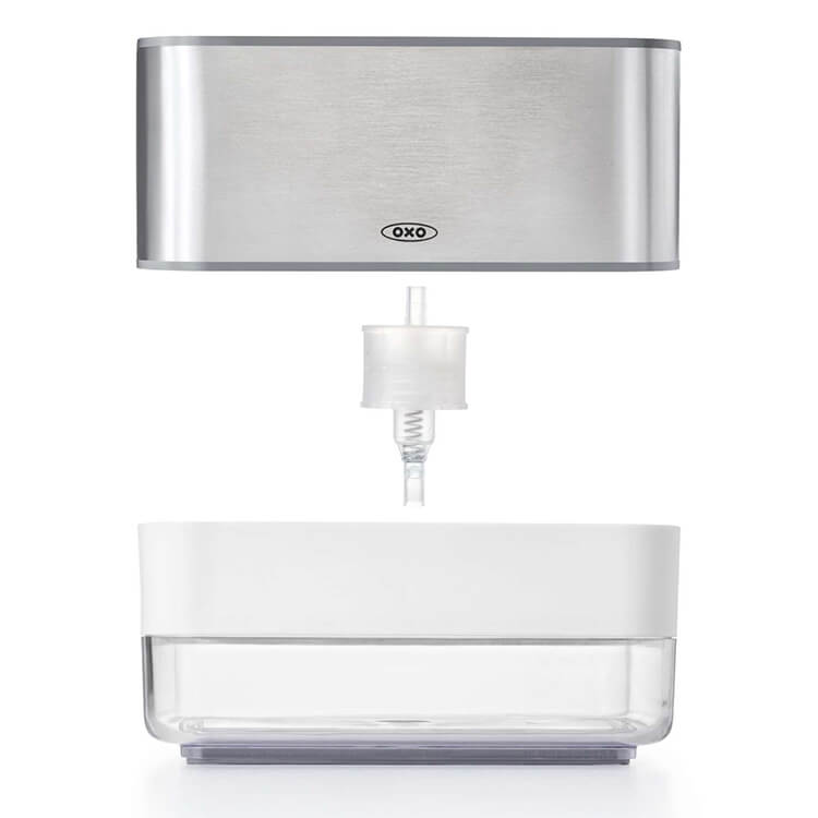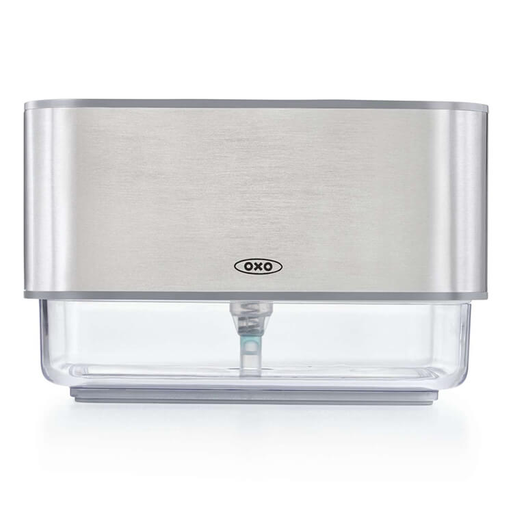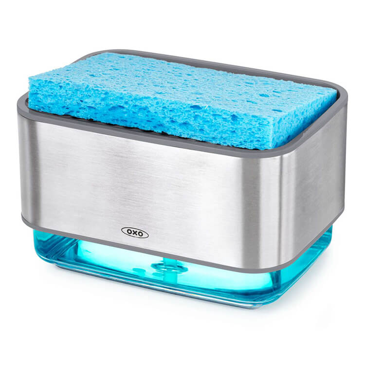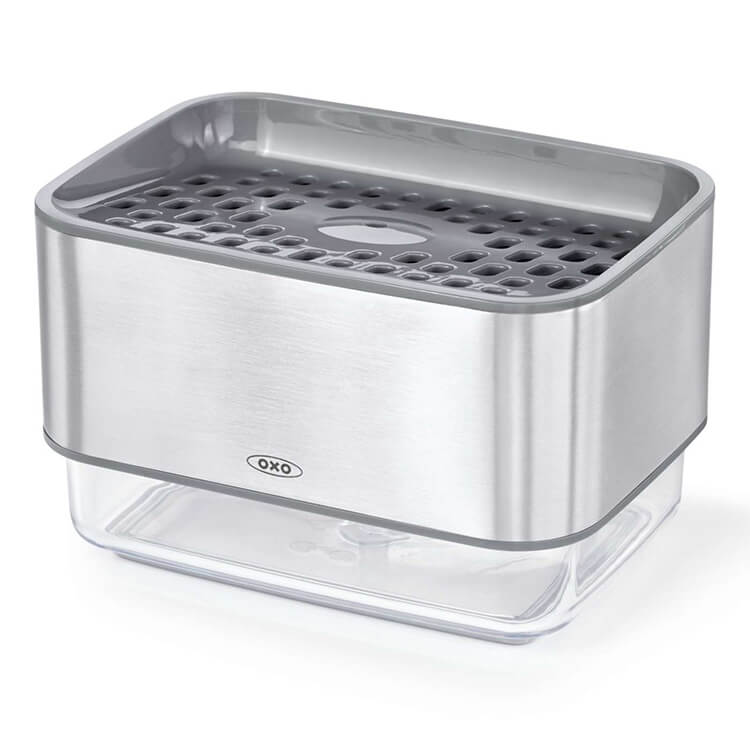 これひとつで、スポンジホルダーとソープディスペンサーの2役をこなします。また、空間に馴染むシンプルなデザインも魅力です。「より多くの人にとって使いやすいデザイン」を意味するユニバーサルデザイン。男女問わず、お年寄りから子供まで、右利きでも左利きでも簡単に使える製品を作るアメリカのブランドです。洗練されたデザインで、狭いシンク周りでもスッキリと置けます。トレイにスポンジを乗せて、上からプッシュするだけで簡単にスポンジに洗剤をつけることができます。