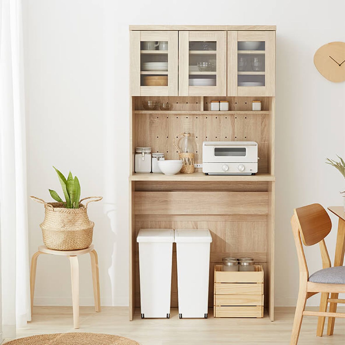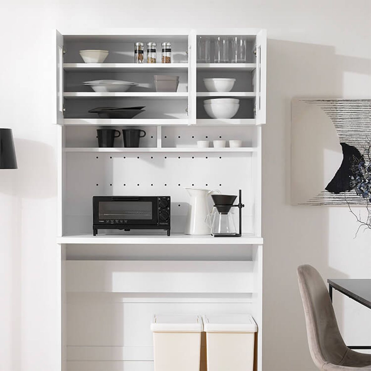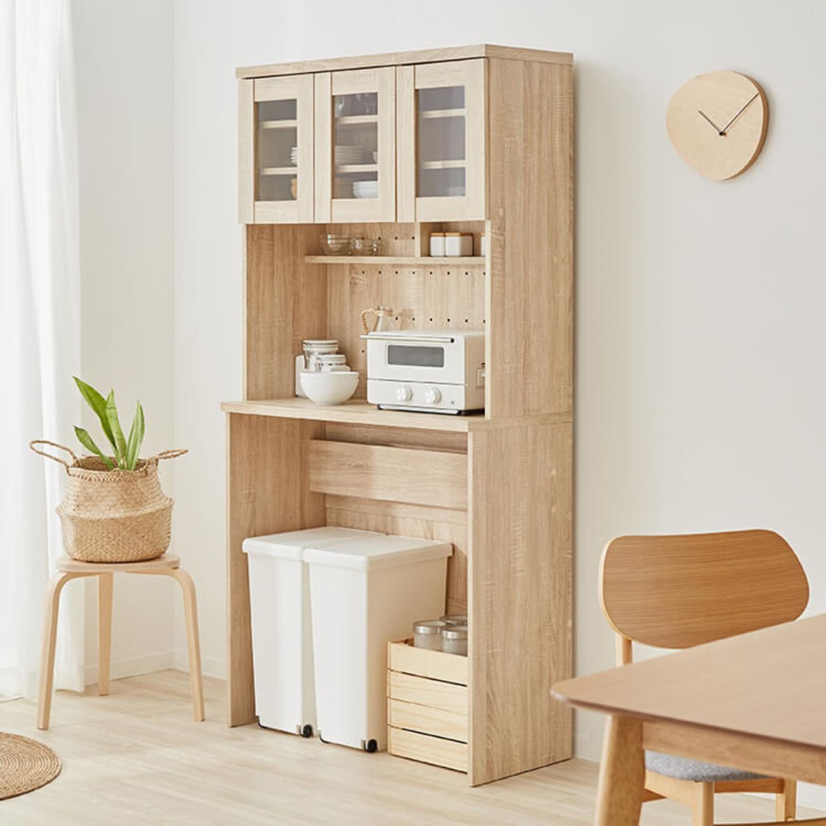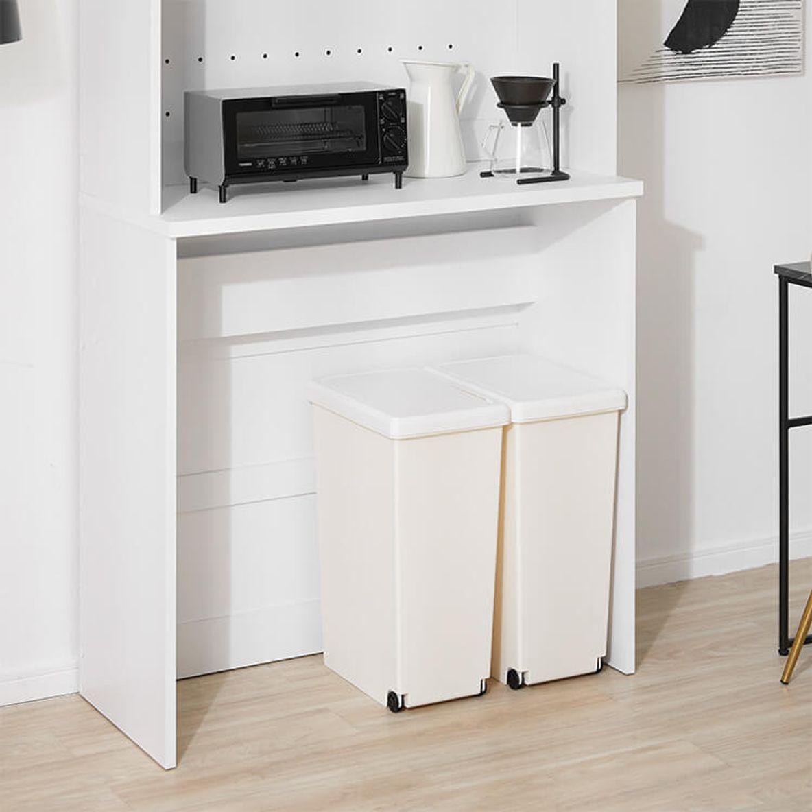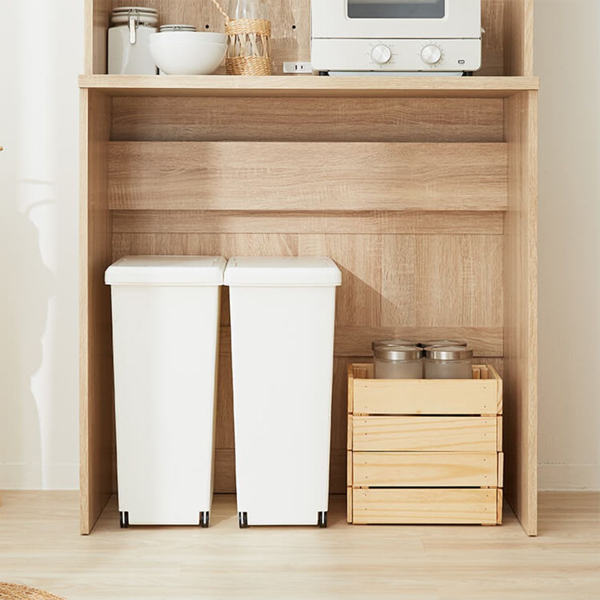 ダストボックスの上にできがちなデッドスペースを有効活用できるキッチンボード。限られたスペースを無駄なく使え、すっきりと片付いたキッチンスペースを作ります。ゴミ箱の上にできがちなもったいないスペース。この収納が使っていなかった空間の使い方を変え、お使いのキッチンスペースの可能性を広げます。ゆとりある高さ設計や、あると便利な袋収納ポケットなど、使い勝手を考えた機能が付いています。横幅は収納力をキープしつつも、スペースをとりすぎない90cm。1人暮らしでもファミリーでもお使いいただける賢いサイズ感です。奥行も約41cmと導線を妨げないスリム設計で、横から見てもシンプルですっきりとした見た目です。飽きの来ないシンプルなデザインは、置くものを引き立たせてくれるので、自分らしい見せる収納を楽しむこともできます。